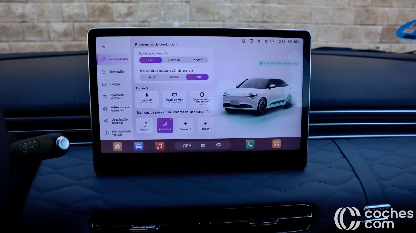 También hay que acudir a la pantalla para modificar los niveles de frenada regenerativa. Son tres (Débil, Medio y Fuerte), están muy bien escalonados y no dan apenas tirones molestos al levantar el pie del acelerador.