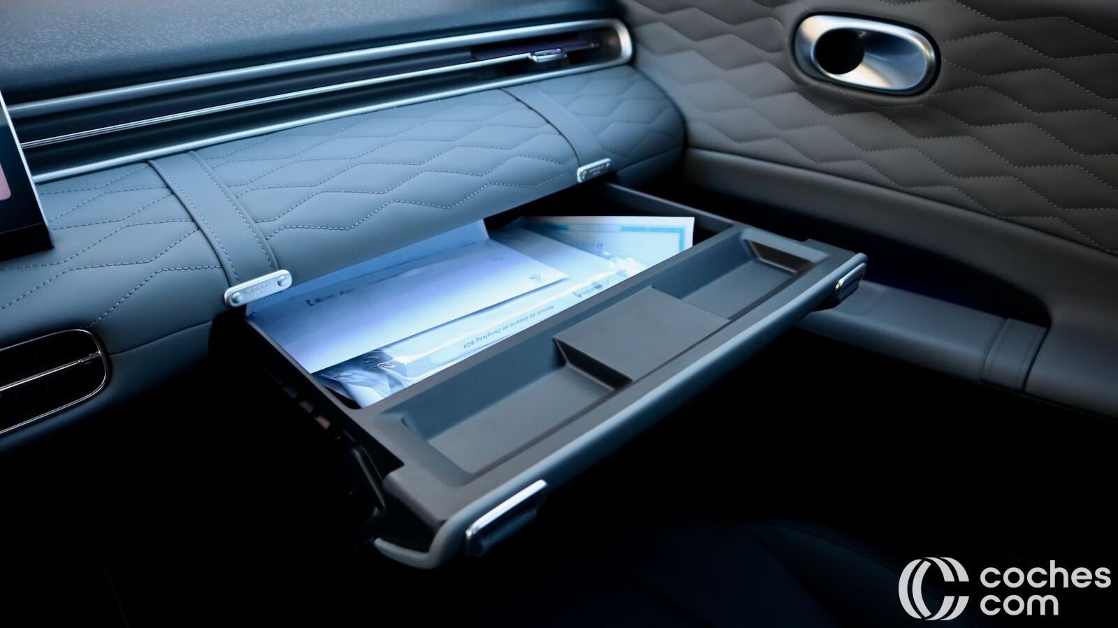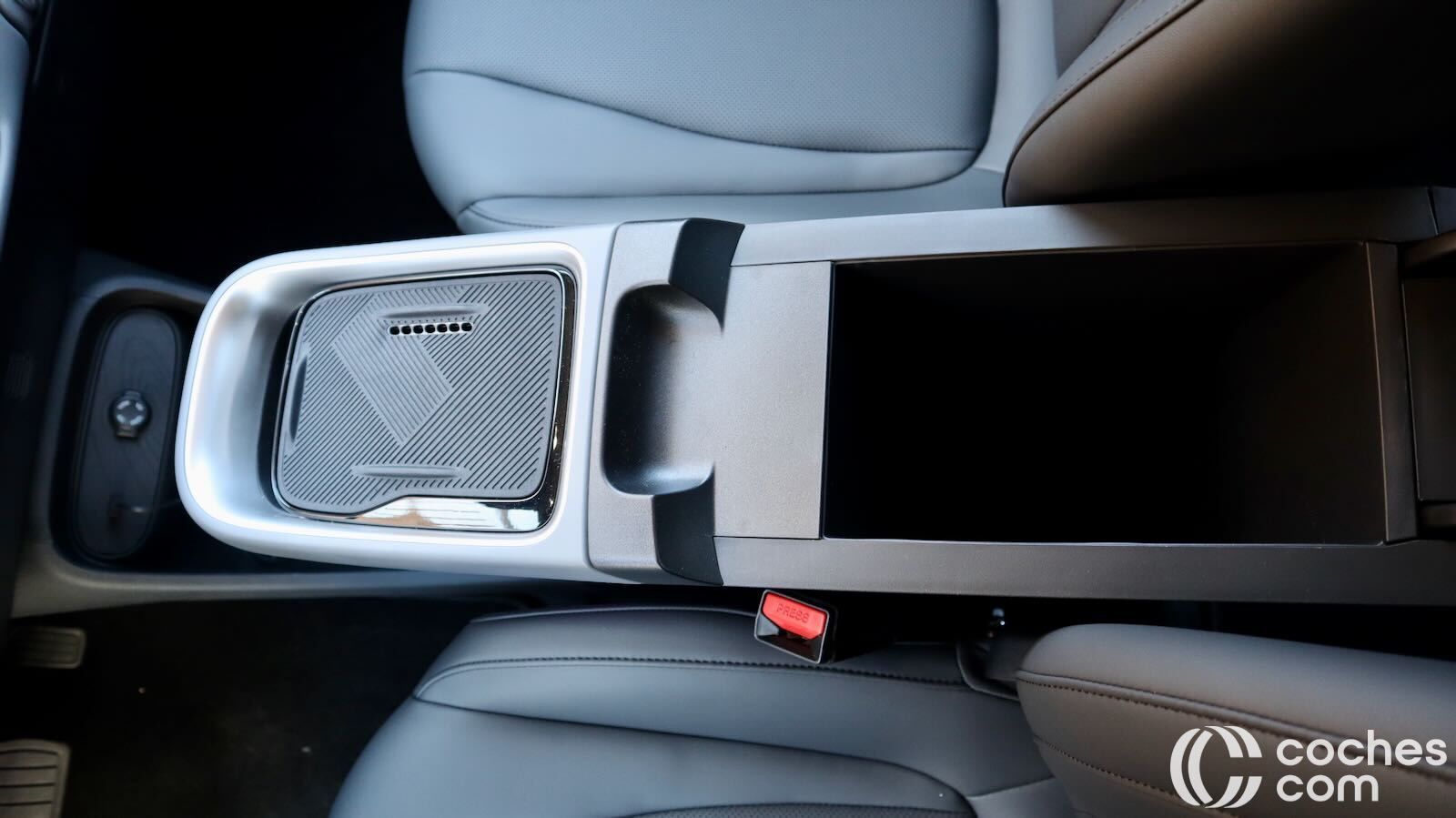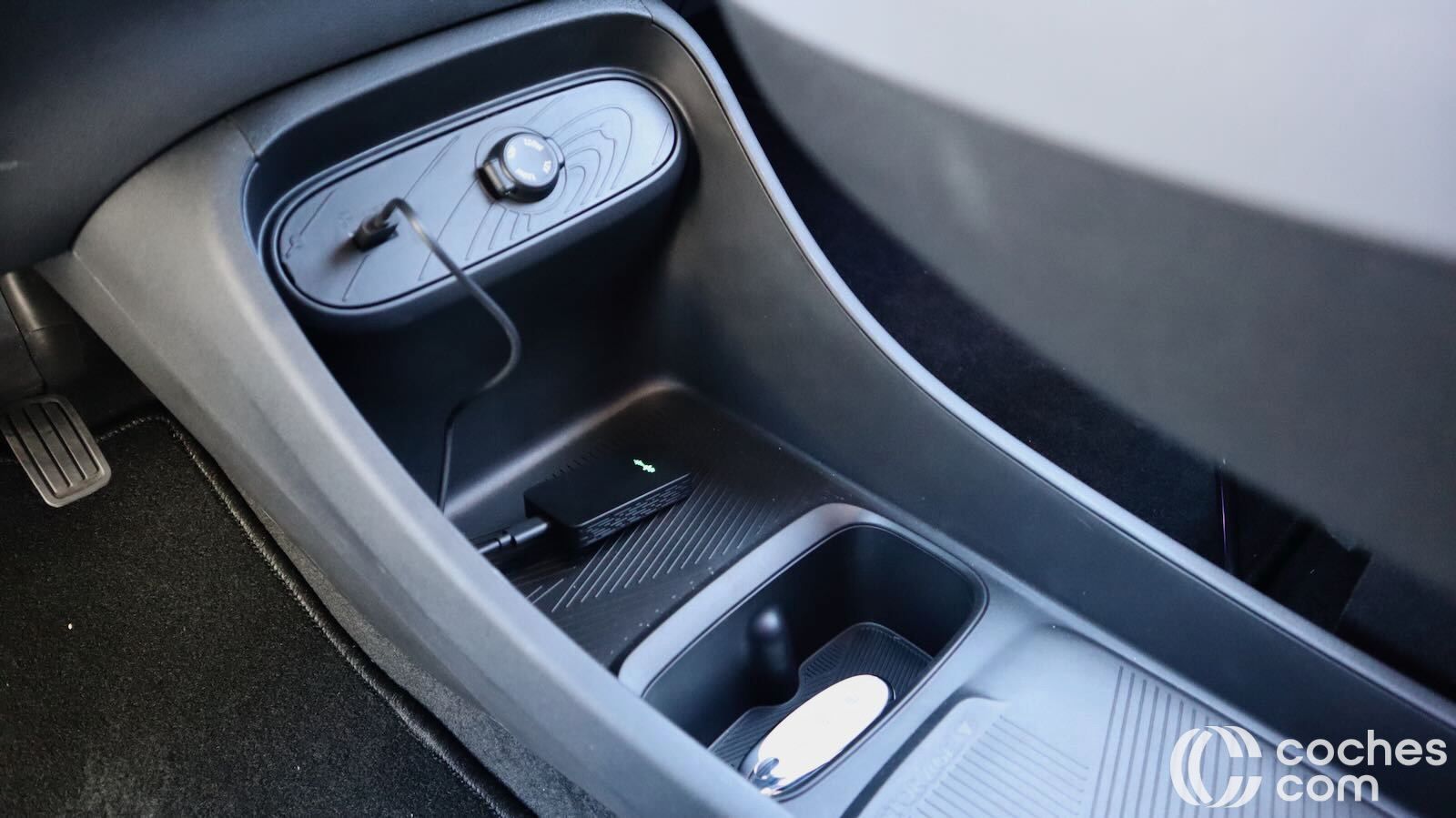 La palanca de cambio está ubicada en la columna de la dirección, lo que libera mucho espacio entre los asientos. Hay una consola a dos alturas. La inferior abierta, con conexiones y espacio donde puede caber hasta una mochila. En la superior encontramos una base de carga inalámbrica y un cofre bajo el reposabrazos. Se suman a bolsas de las puertas y a una guantera curiosa, en forma de cajón, no muy profundo pero que puede servir como soporte para un ordenador portátil.
