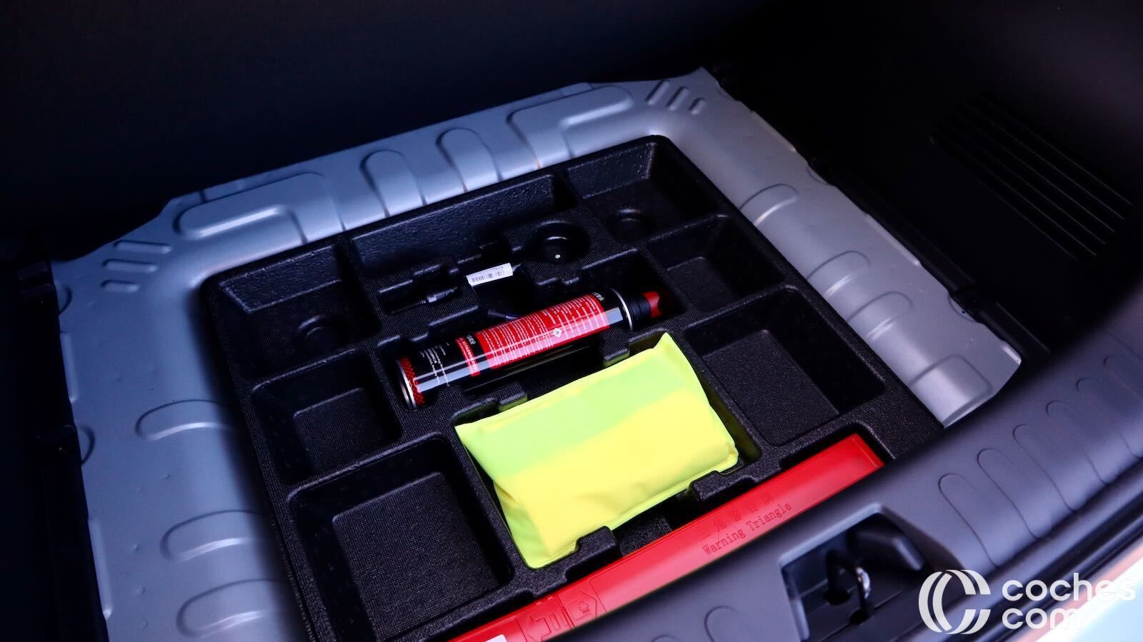 Bajo el piso contamos con un pequeño espacio compartimentado donde guardar el kit reparapinchazos o algún enser pequeño, pero no cabrían los cables de carga. No es un espacio que la marca haya cuidado mucho, pues no hay ganchos para colgar bolsas o elementos para sujetar la carga. Tampoco contamos con una bandeja que separe esa zona del habitáculo y evite ver lo que llevas.