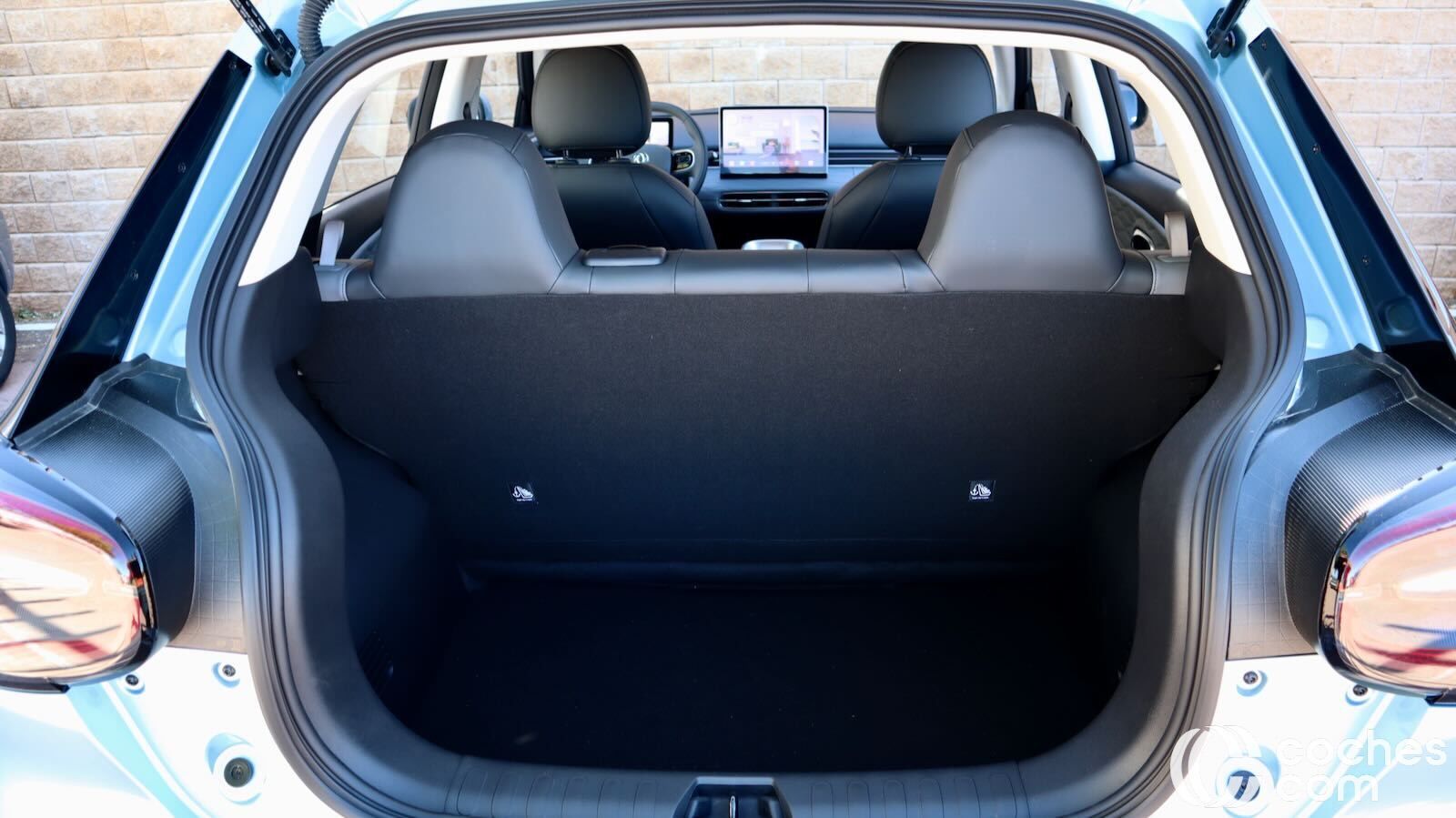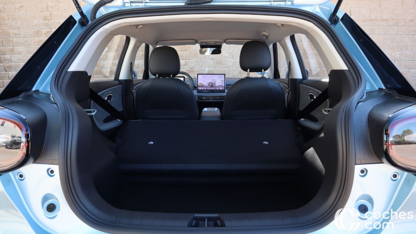 Tres personas delgadas podrían caber y, como es habitual en los eléctricos, el piso es totalmente plano. El problema viene de que se les ha olvidado poner reposacabezas central. Y los dos de los laterales no son regulables, sino que están unidos al repaldo. Para los más altos no van a resultar demasiado cómodos.