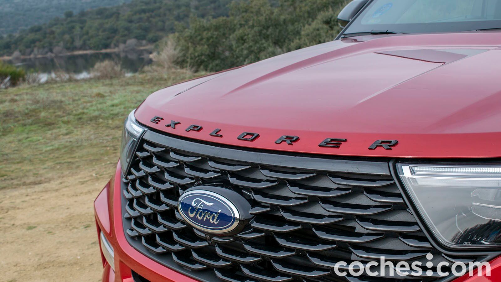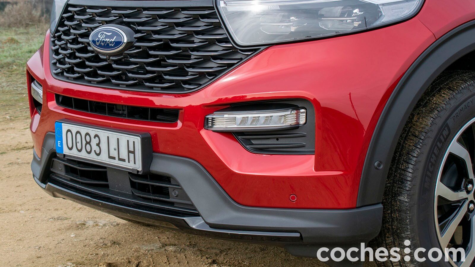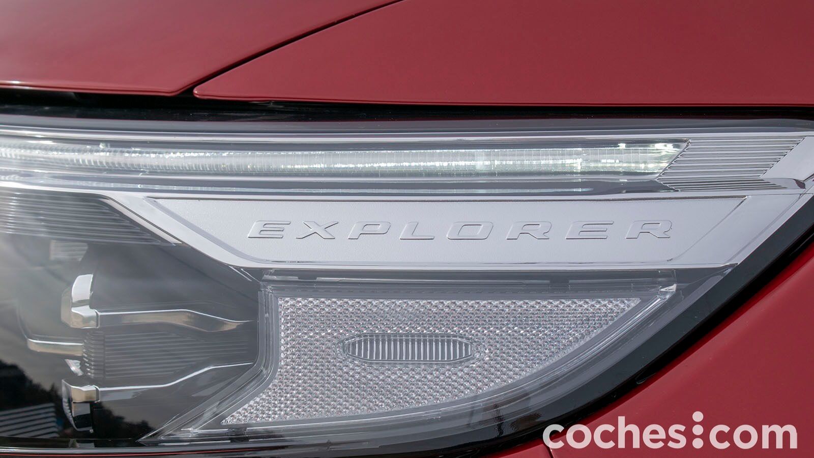 No hace falta que nos digan la procedencia del Explorer, con sólo verle es fácil de adivinar. Tiene una estética muy americana, con formas marcadas y elementos reconocibles. El frontal es lo más característico, con un capó muy horizontal que queda rematado con el nombre del modelo. Por debajo aparece una parrilla de enormes dimensiones con entramado en 3D, perfectamente integrada con los faros Full LED. La parte baja el paragolpes continúa con esas formas sugerente y las luces antiniebla separadas.