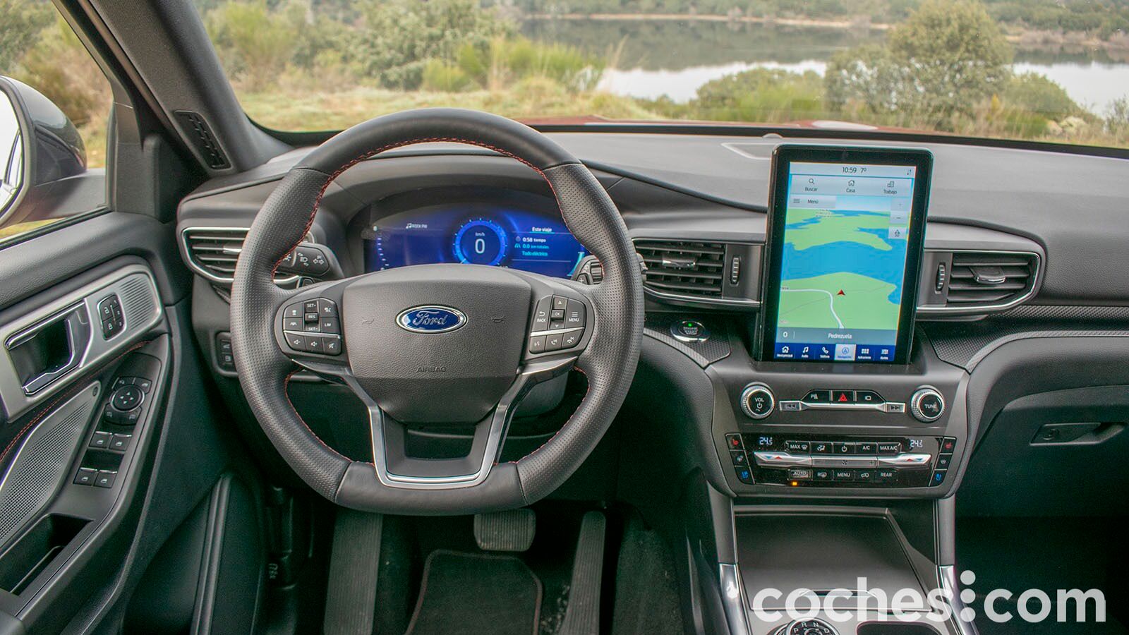 Y ya si nos centramos en su posición de conducción elevada, nos deja a mano un volante multifunción similar al que encontraríamos en cualquier otro modelo. En el Explorer, sirve para manejar el control de crucero y también la instrumentación digital de 12,3 pulgadas que viene de serie. Nos muestra toda la información de manera bastante clara y tradicional, pero es cierto que tiene menos posibilidades de personalización que otros rivales.