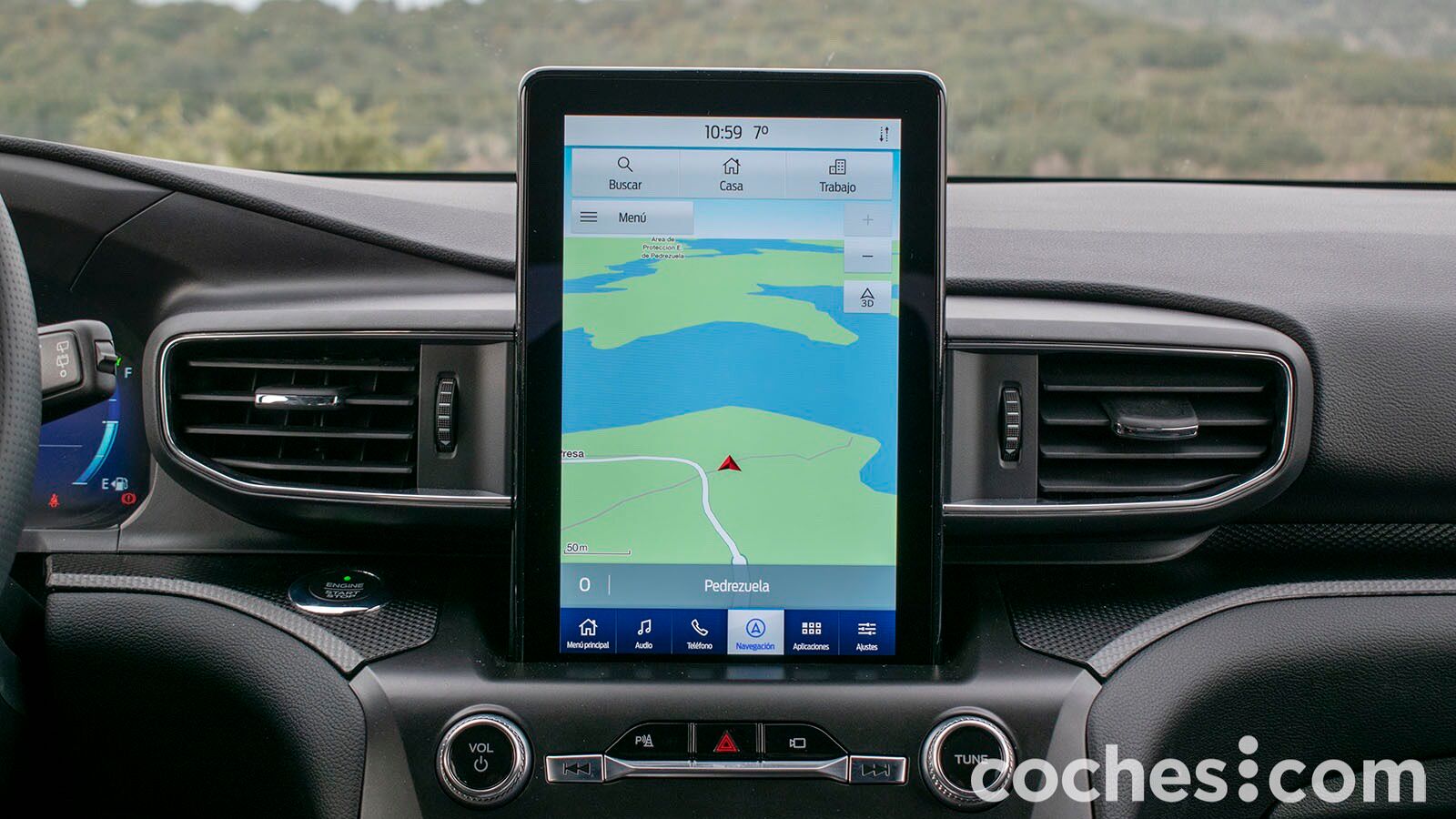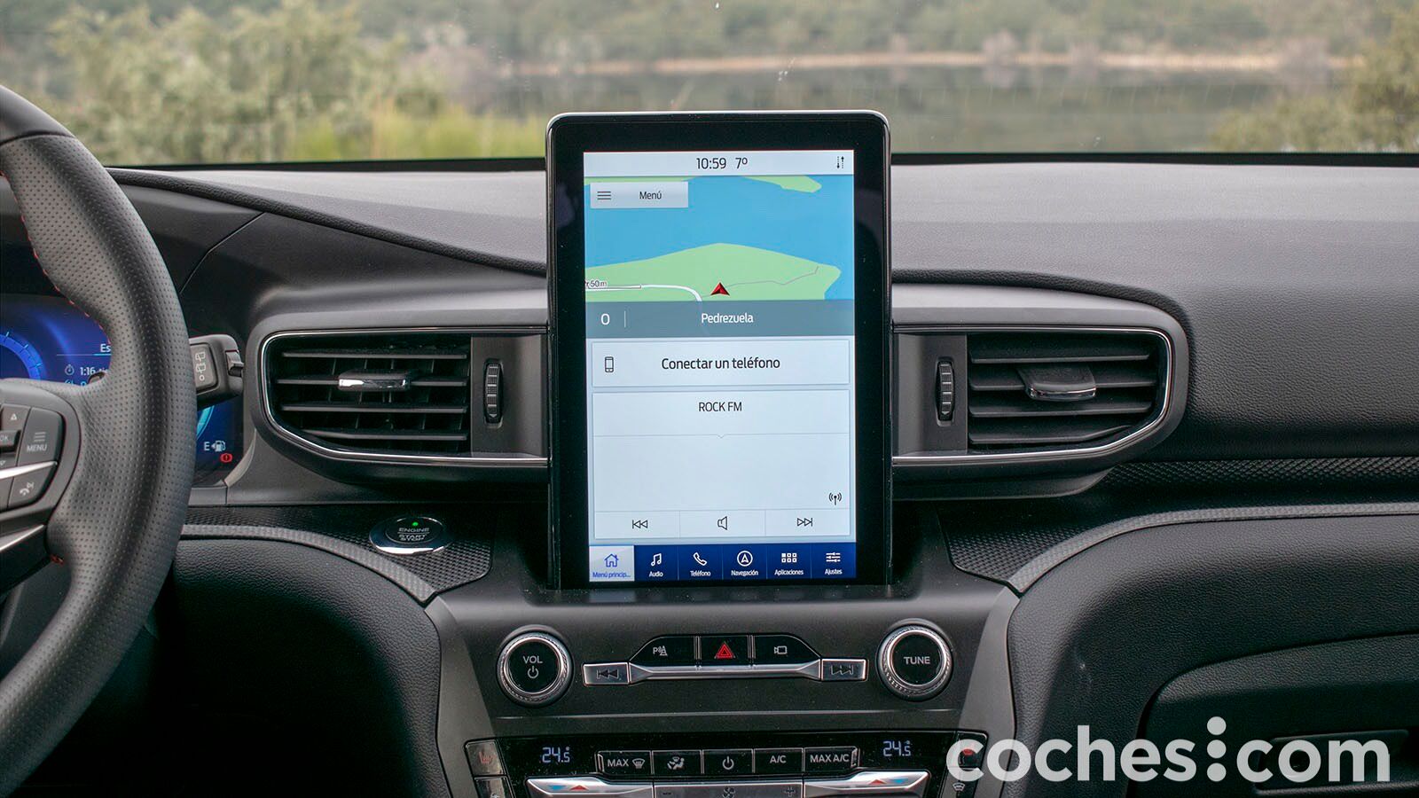 Aunque lo primero que llama la atención al montarnos en el Ford Explorer es su tecnología. Principalmente su pantalla táctil principal de 10,1 pulgadas en posición vertical con el sistema SYNC 3 de la marca. Cabe destacar que no está demasiado bien integrada, pero que su manejo es bastante intuitivo al mantener los menús de otros ejemplares y un tacto preciso. Además, cuenta con una conectividad completa gracias a Android Auto y Apple CarPlay.