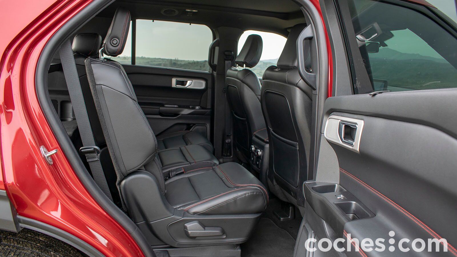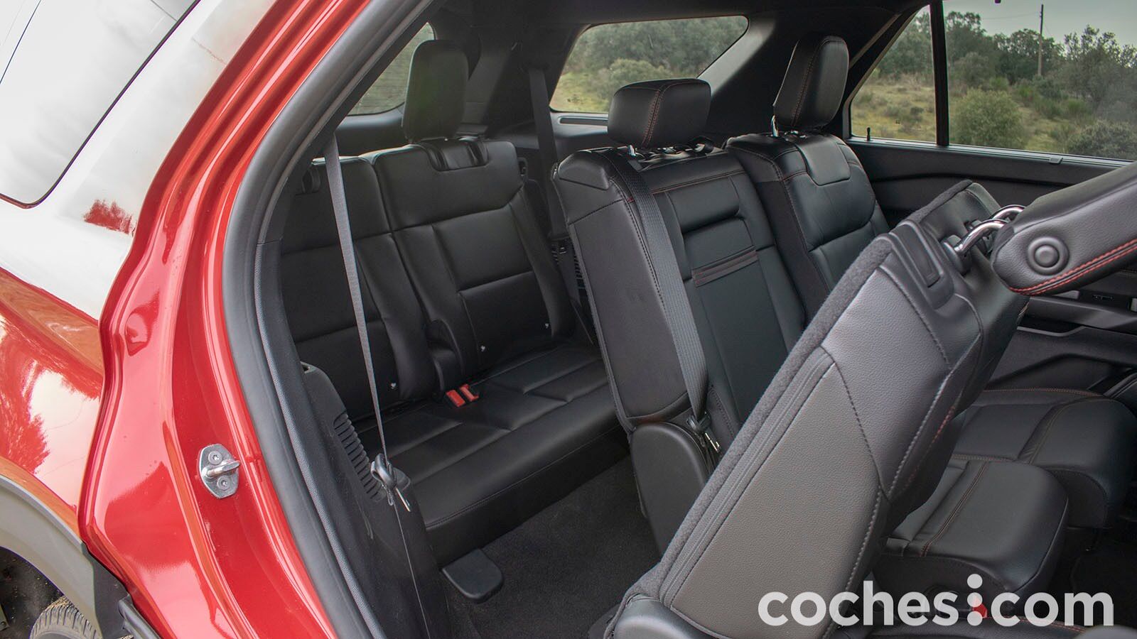 Llama la atención que desde la segunda fila se pueda controlar la temperatura, los asientos calefactables traseros, haya tomas USB e incluso un enchufe convencional. Tampoco hay que olvidar que el Ford Explorer es un coche con siete plazas. El acceso a la tercera fila es algo complicado por el espacio que queda y el movimiento de los asientos de forma manual. Una vez sentados en esos asientos vemos un espacio justo para las piernas, pero son bastante más habitables que en la mayoría de rivales.