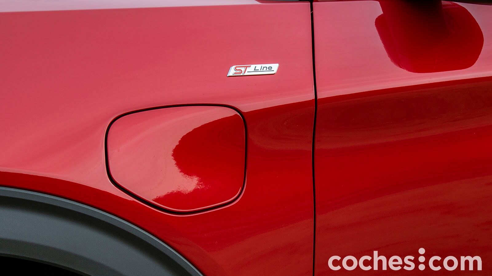 Solamente está disponible en el acabado deportivo ST-Line y por ello aparecen unas llantas de 20 pulgadas en sus abultados pasos de rueda. La toma de carga está justamente en la aleta derecha. También quiere potenciar su carácter de crossover mediante los plásticos negros que recubren todos los bajos de la carrocería. Este modelo cuenta con algunos elementos como los pilares A, los retrovisores o las barras de techo en negro haciendo contraste.