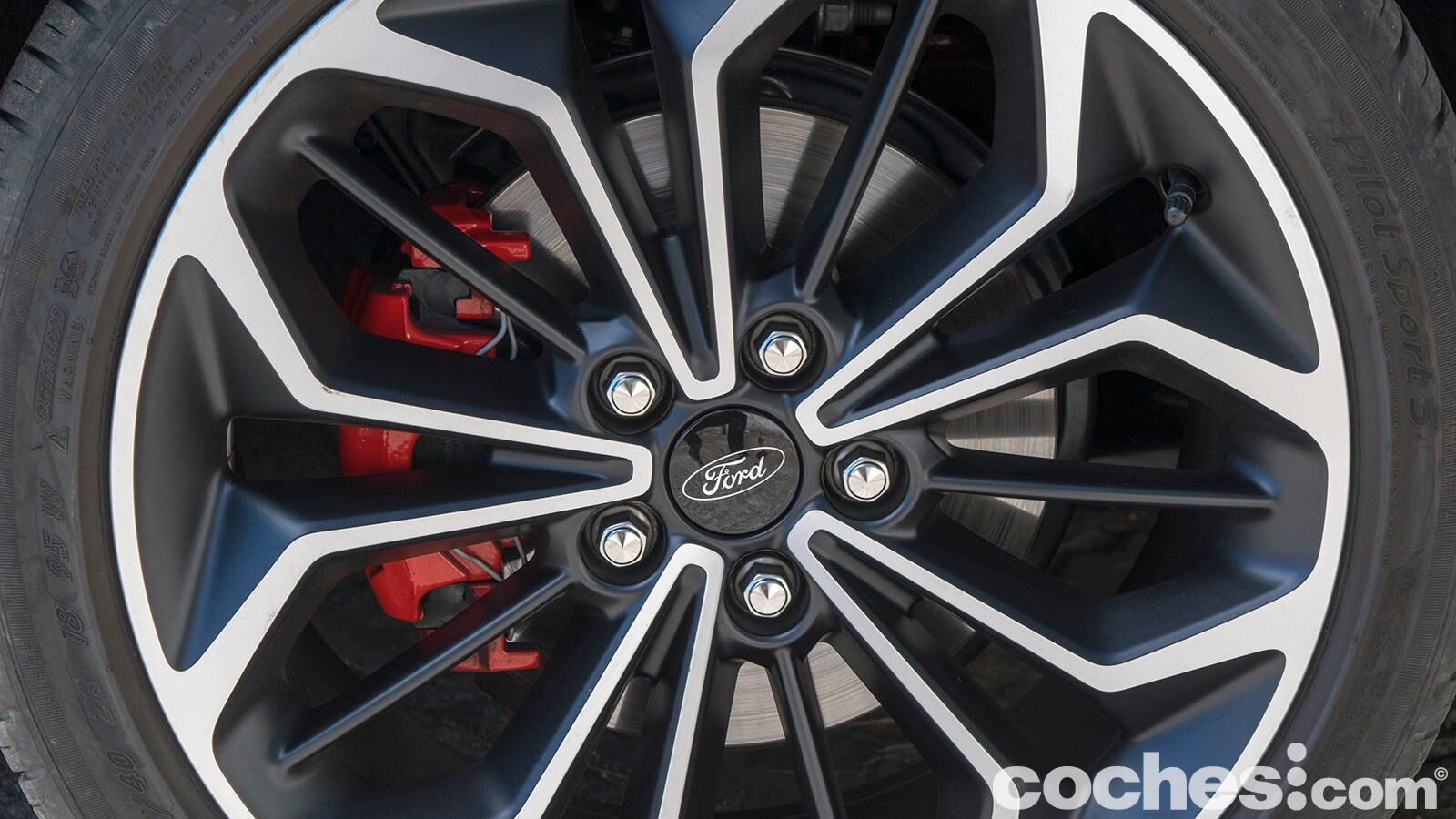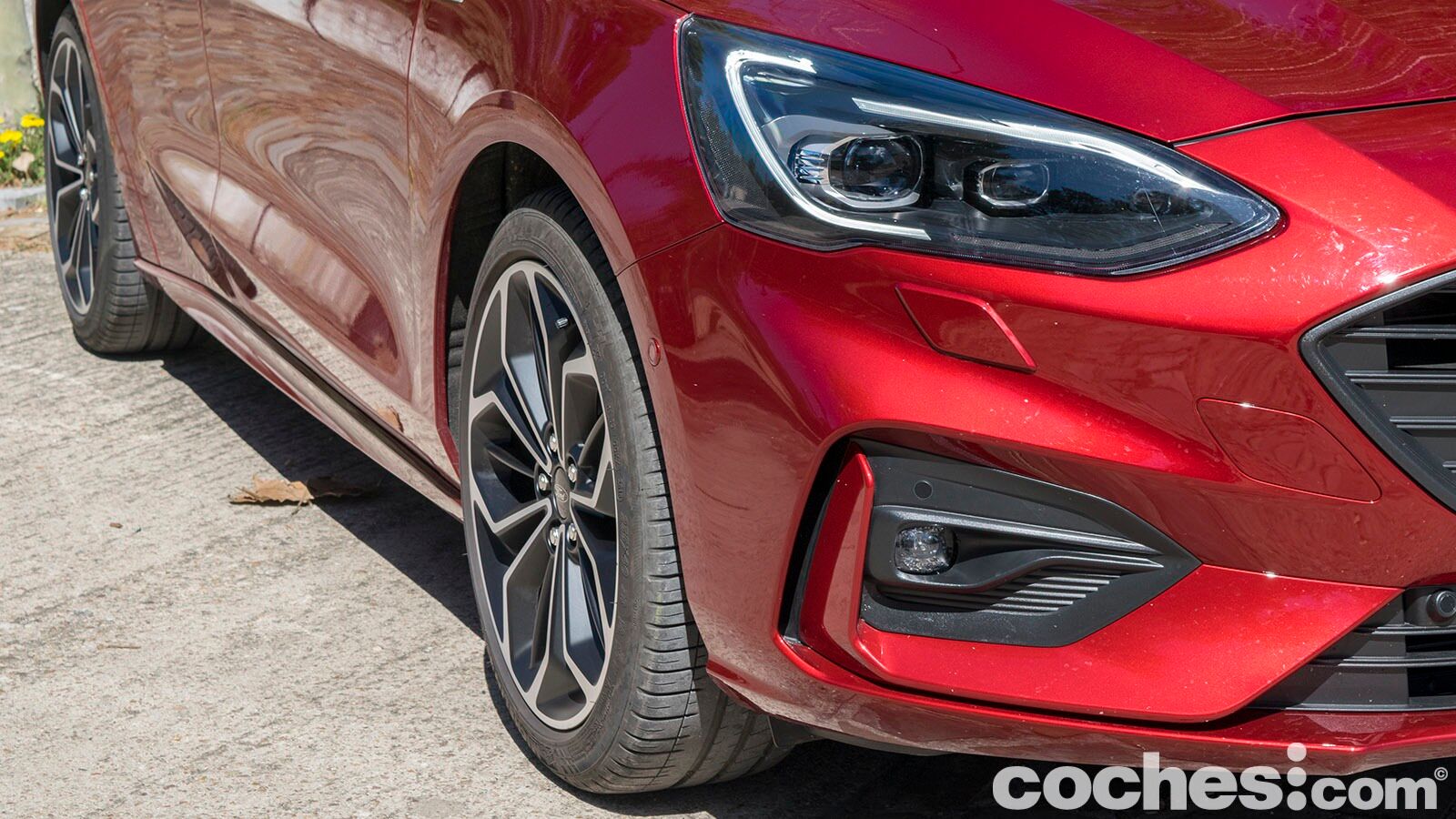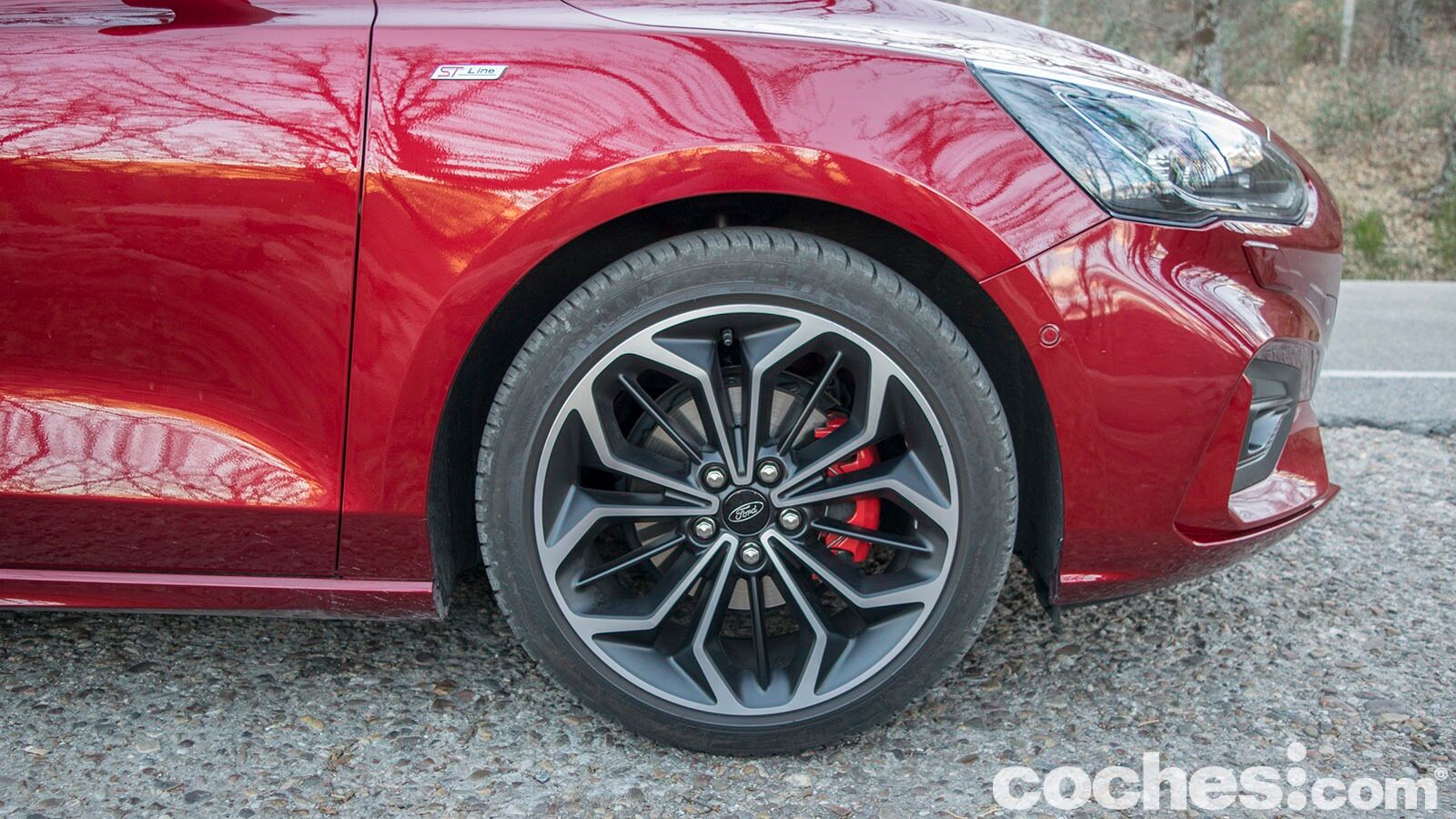 Los paragolpes en este acabados buscan esa imagen más agresiva y en la parte delantera eso se traduce en unas generosas tomas de aire. En el lateral encontramos unos faldones algo más trabajados y también las llantas de 18 pulgadas con acabado bitono que lleva nuestra unidad con pinzas de freno en color rojo. Son destacables los cambios en su silueta, con el habitáculo ligeramente retrasado y una zaga que recuerda ligeramente a un familiar (aunque se diferencia bien del Focus Sportbreak).
