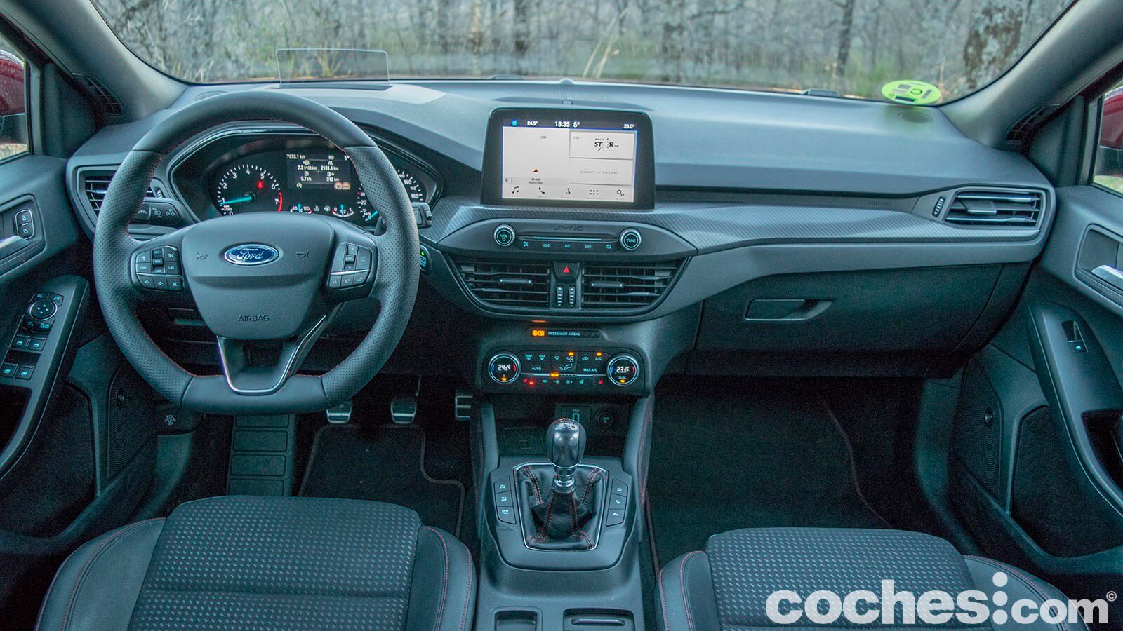 El interior del Ford Focus también ha sufrido una actualización notable y sigue las premisas que ha ido adoptando la marca americana en otros modelos. De esta forma, el protagonismo recae en la pantalla táctil de 8 pulgadas que cuenta con el sistema multimedia SYNC 3. No termina de convencer su integración, pues sobresale mucho en el salpicadero, pero si que destaca por su respuesta fluida y por la navegación intuitiva entre menús.