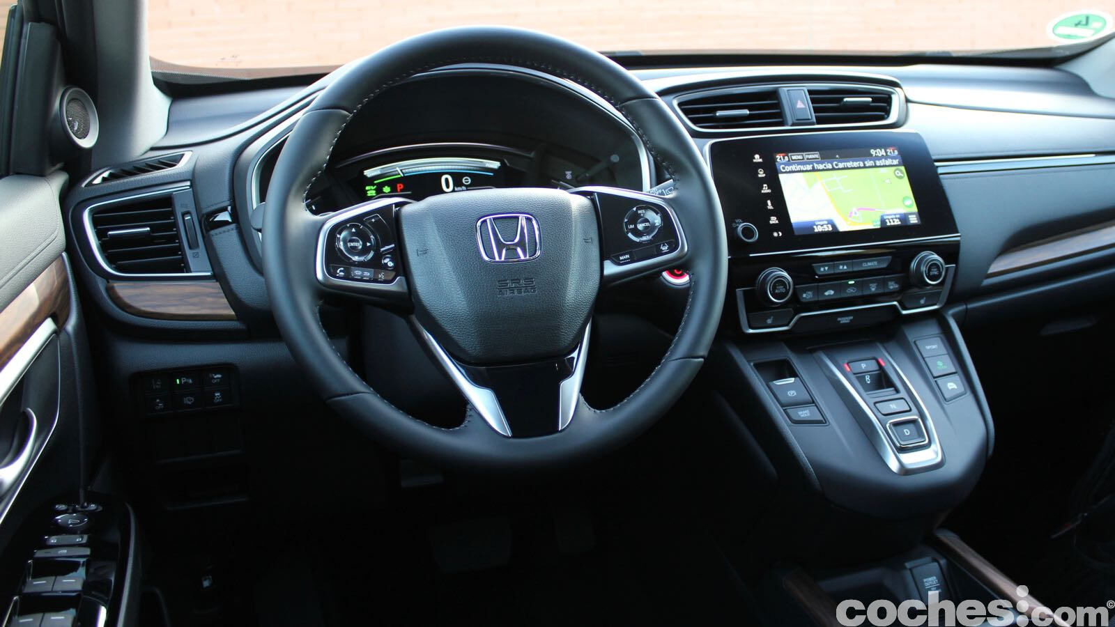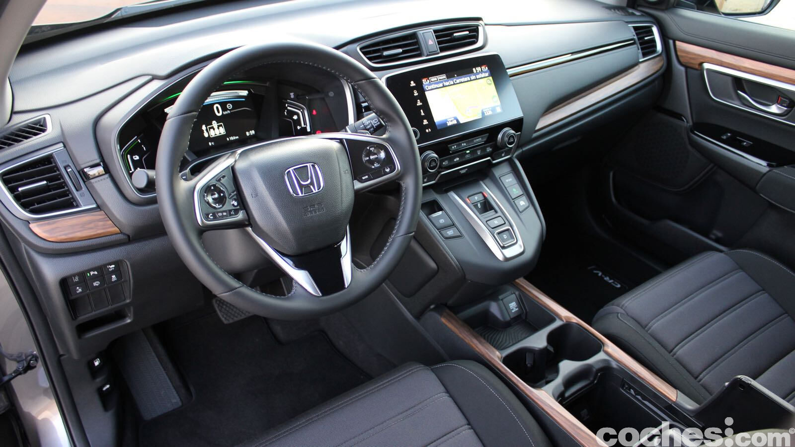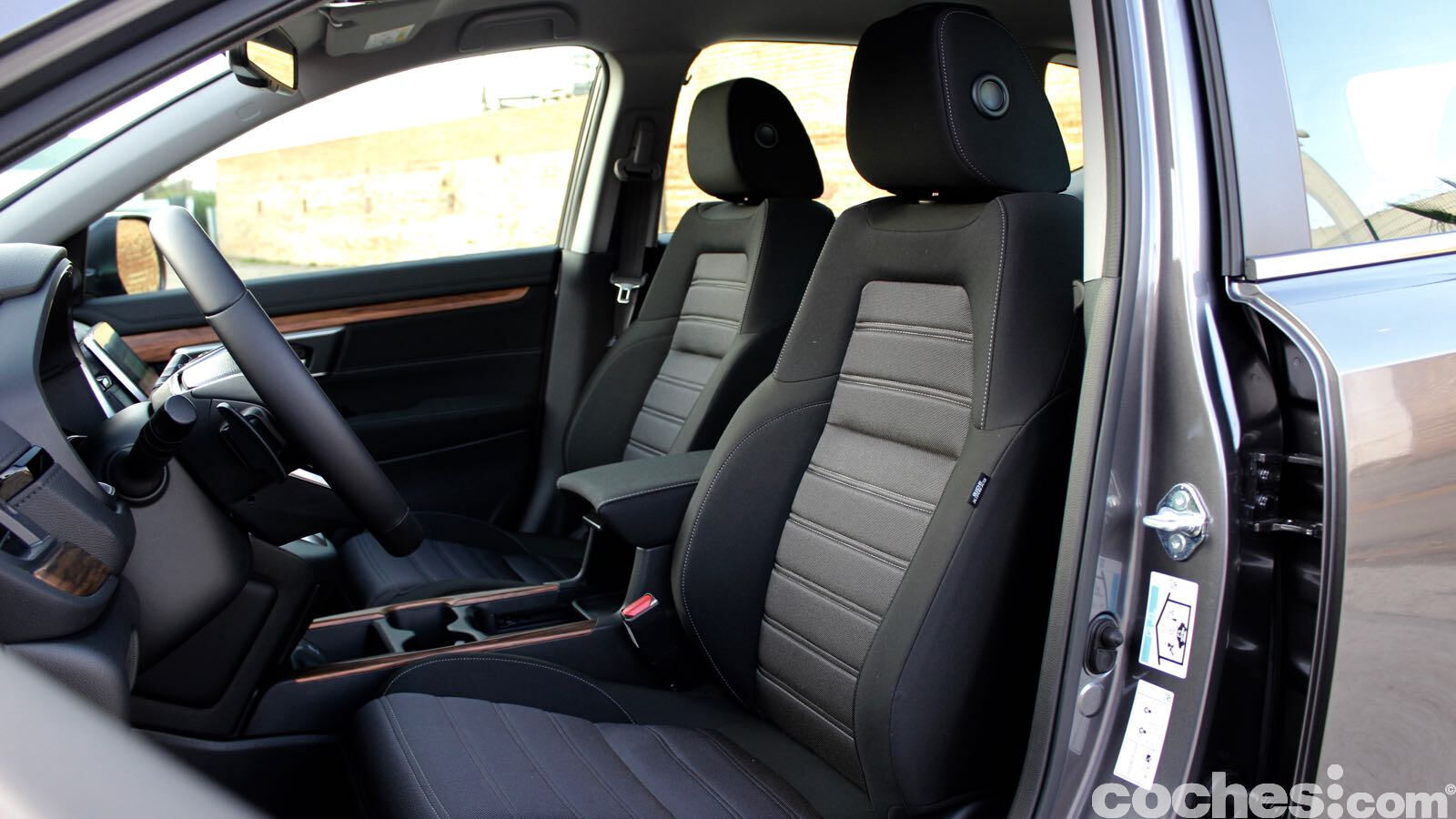 En las plazas delanteras contamos con asientos resultan cómodos, con una buena tapicería textil en negro en los acabados más sencillos, que puede ser de cuero en los superiores. La visibilidades muy buena en todas direcciones. Honda nos cuenta que ahora los montantes A son más estrechos (gracias a que se emplea más acero de alta resistencia) y que también se ve mejor sobre el capó, algo que muchos conductores agradecen. Unos grandes retrovisores facilitan la vista trasera.