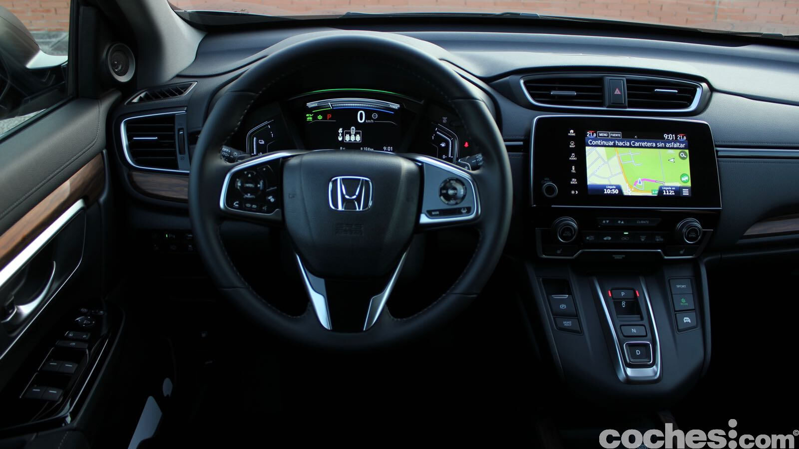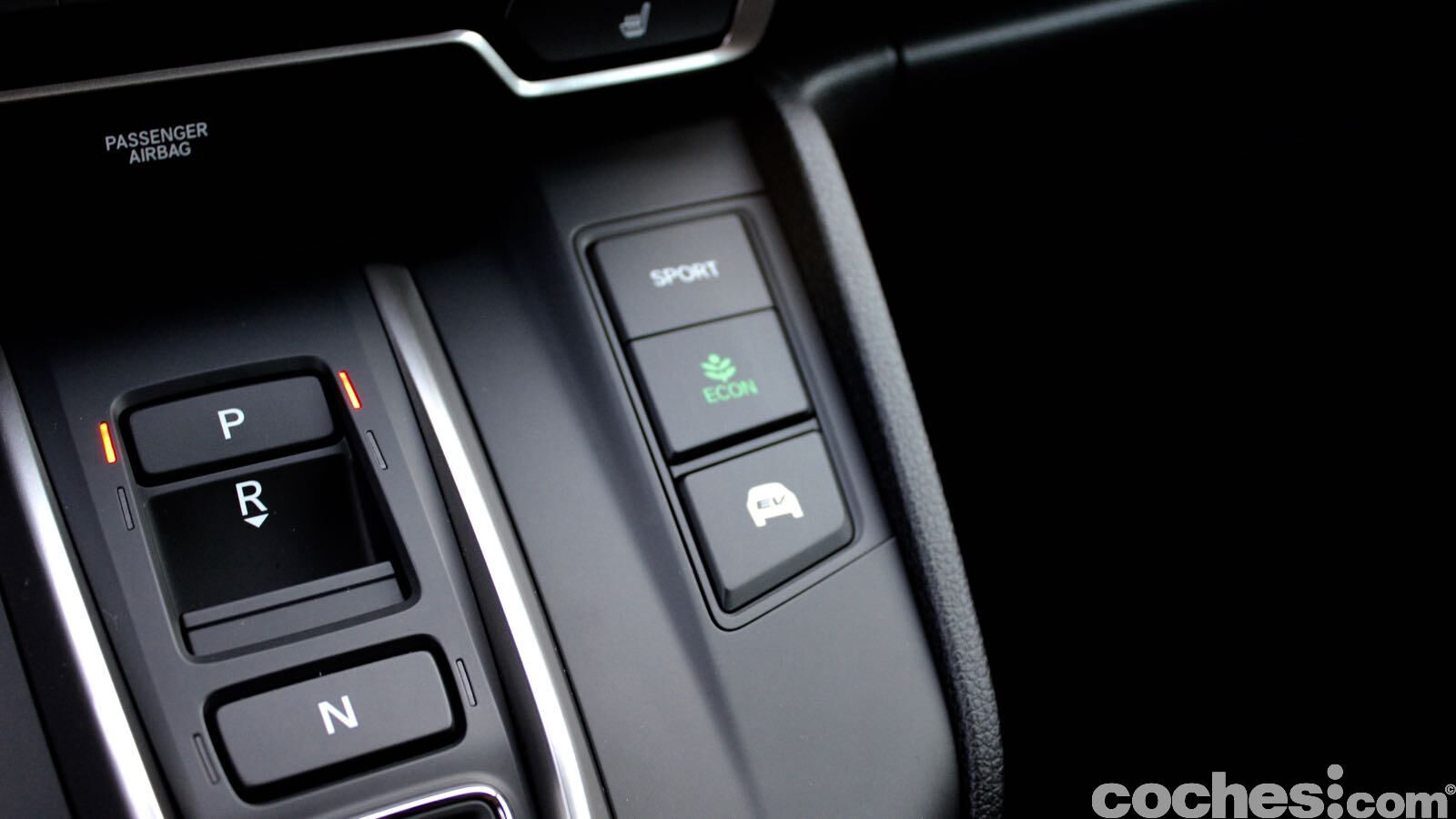 También es más cómodo, por natural, el sistema de frenos. En un coche hibrido, por lo general, entre el funcionamiento del freno regenerativo hasta que comienzan a funcionar el freno hidráulico hay un ligero retraso, lo que crea una sensación «epsonjosa» que en Honda han eliminado. Tras el volante nos encontramos con unas levas que aumentan o disminuyen el frenado regenerativo (izquierda más retención, derecha, menos). No llevan a frenar el coche por completo, como el caso del Mitsubishi Outlander PHEV, pero ayudan a moverse por ciudad sin apenas pisar el freno.