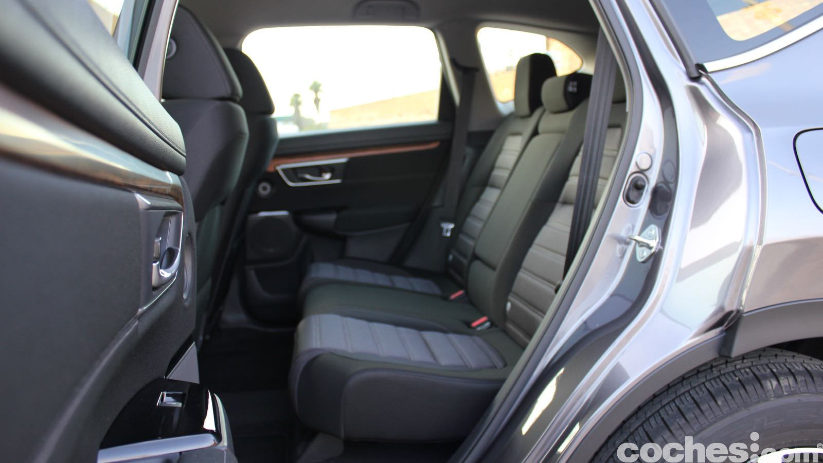 Si en algo destaca el Honda CR-V es en su capacidad interior. Tanto en las plazas delanteras como en las traseras, con un espacio para las piernas y la cabeza soberbios, mejores incluso de coches que destacan en este apartado, como un Skoda Kodiaq o un Peugeot 5008, por citar dos que hayamos probado. El acceso a todas ellas es comodísimo, sobre todo detrás, pues las puertas, además de abrirse mucho dejan un hueco de formas muy rectas en la parte alta.