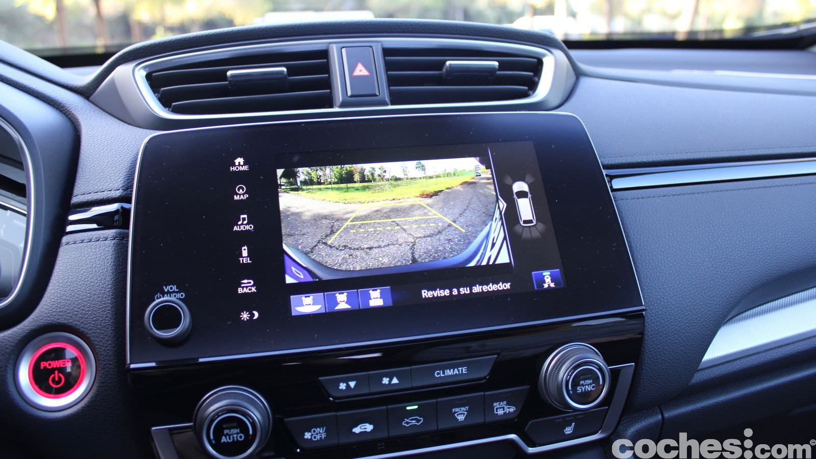 Quien manda en ese espacio es la pantalla táctil central. Tiene un manejo sencillo, pero el espacio real de pantalla se me antoja pequeño para todo lo que ocupa. No me convence tampoco el navegador, pero puedes usar el del móvil al ser compatible con Android Auto y Apple Carplay. La cámara de visión trasera sí tiene una resolución correcta, y tiene tres posibilidades de visionado que pueden resultar muy prácticas para evitar golpes (la convencional, una en la que ves el paragolpes y un gran angular.