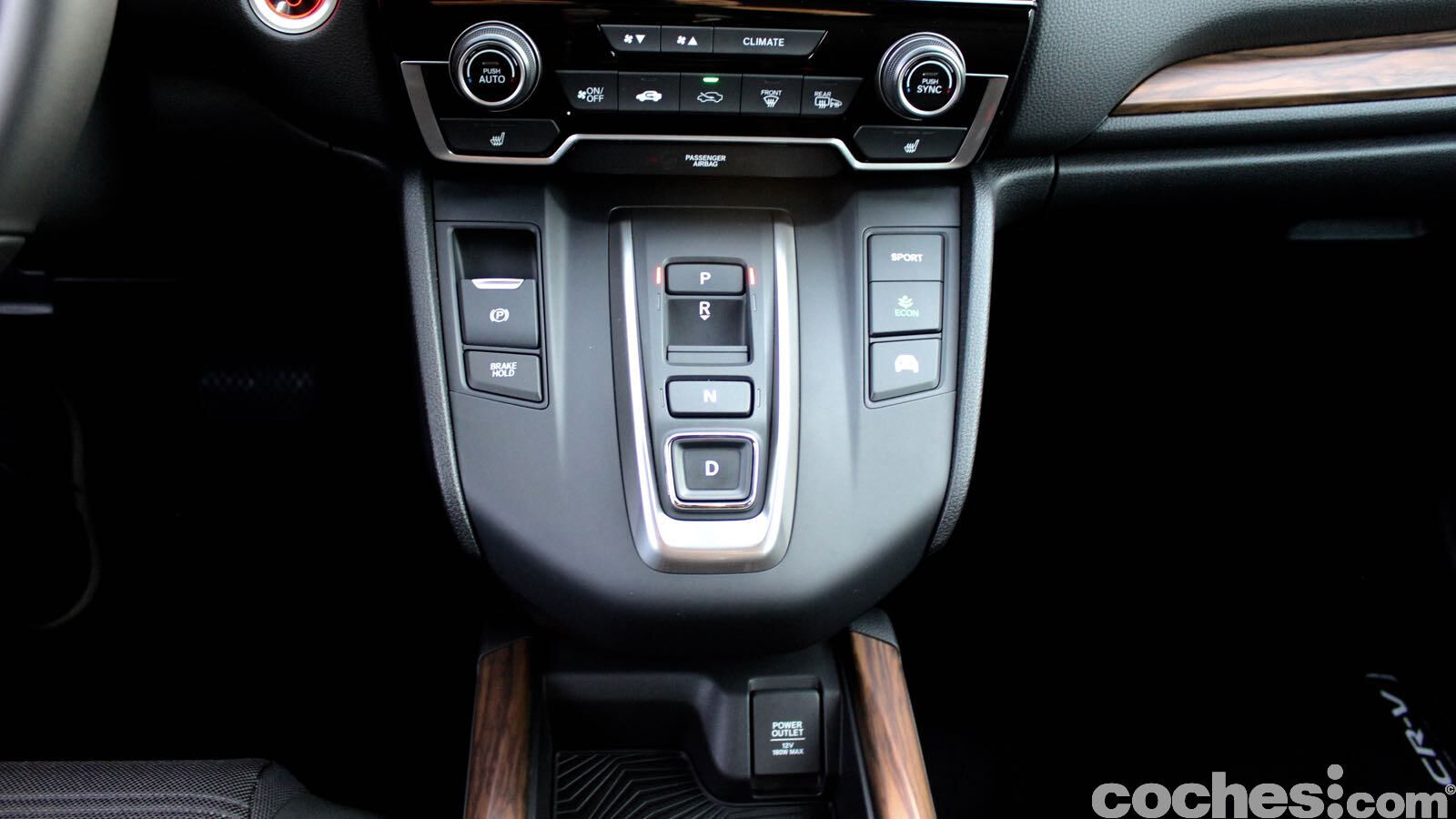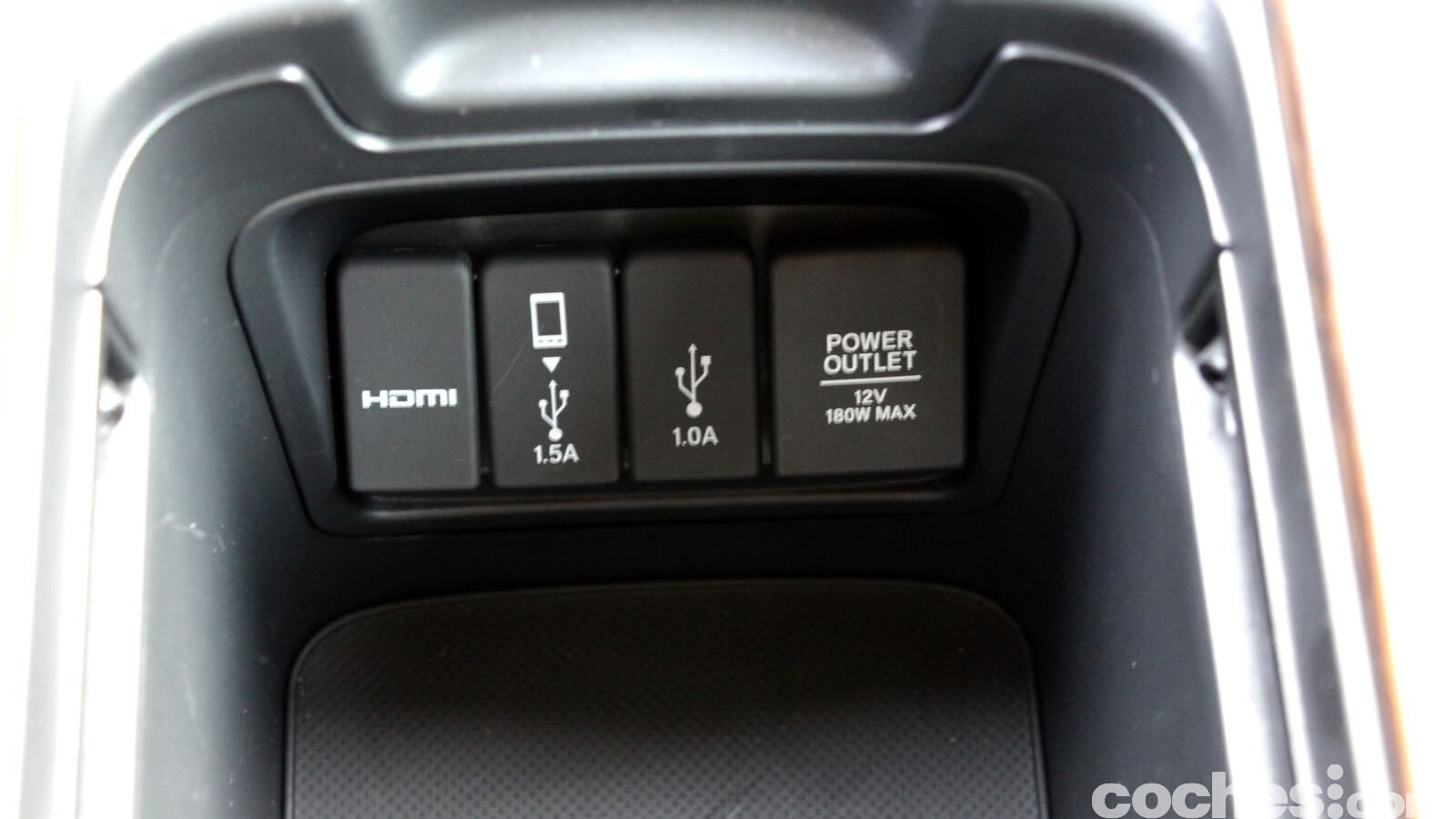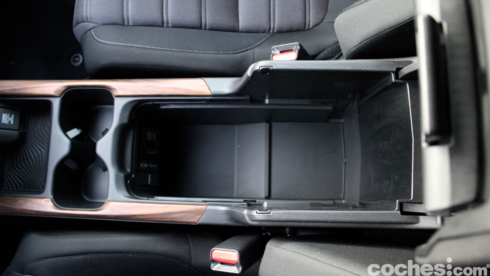 Curiosa también la consola central, con una solución que me gusta, como es la de elevar el «cambio», que en este caso va por botones. Además de estar más a mano, libera espacio entre los asientos, que Honda ha sabido aprovechar muy bien, con un gran cofre (con dos tomas USB, una HDMI y una de corriente), un par de espacios para dejar objetos y reposabebidas.