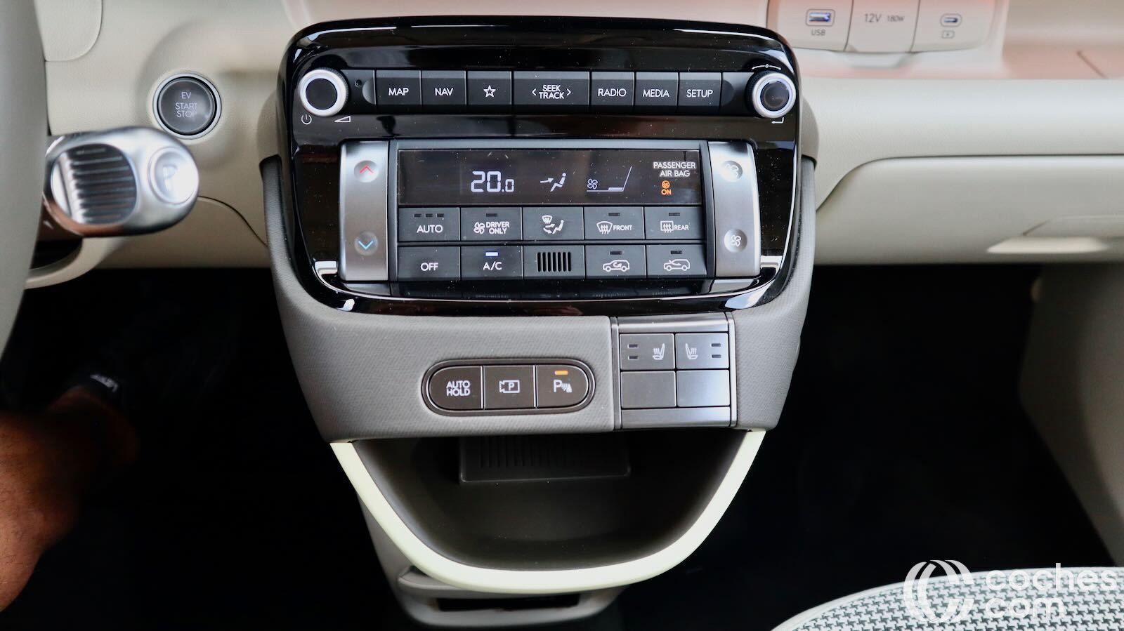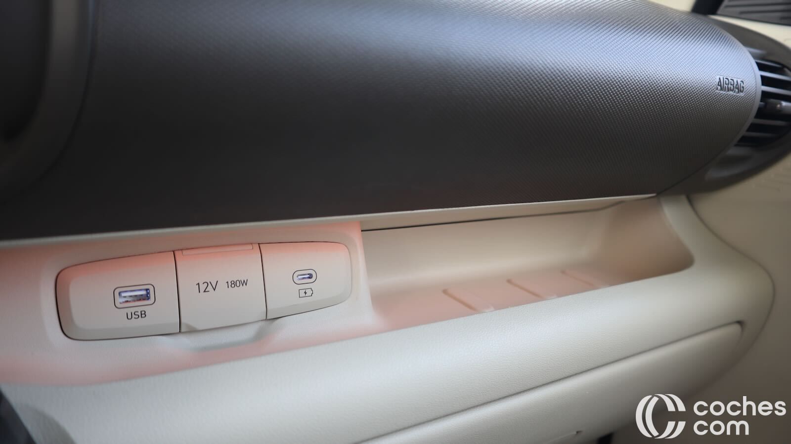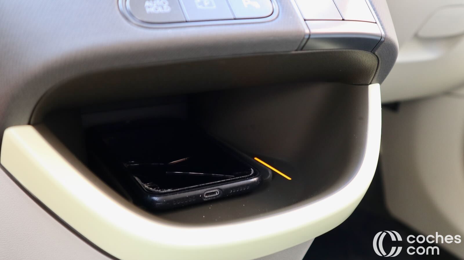 Al no haber consola central podrías pensar que no es un coche práctico. Nada más lejos de la realidad. Tenemos distintos huecos para dejar objetos en la parte inferior del salpicadero, donde no falta incluso una base de carga inalámbrica. Casi en el suelo, una toma de enchufe, que se suma a las USB, USB-C y de 12 voltios que están al lado de una repisa sobre la guantera.