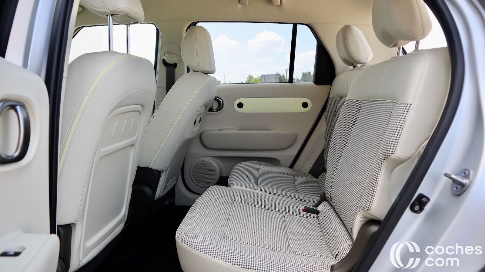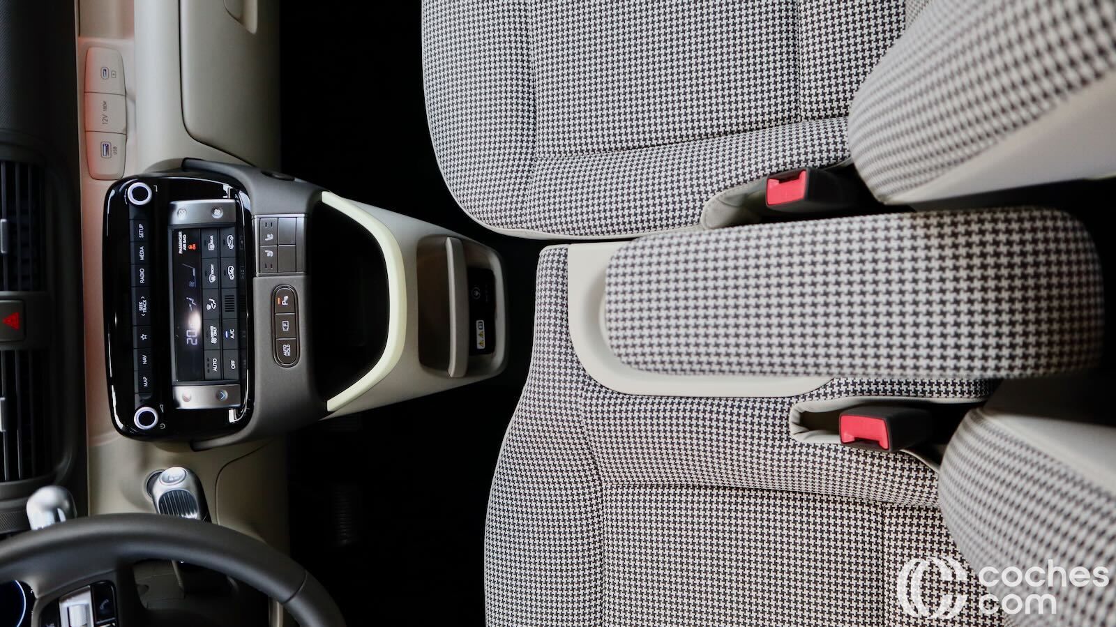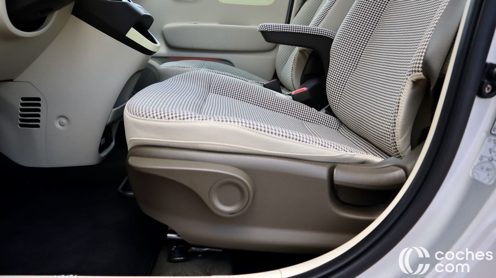 Lo primero que llama la atención es el espacio interior para lo pequeño que es el coche. Delante lo consigue con un asiento delantero corrido, a la antigua usanza, pero en realidad son dos. El del conductor integra posavasos y tenemos incluso un reposabrazos, que es poco habitual en el segmento.