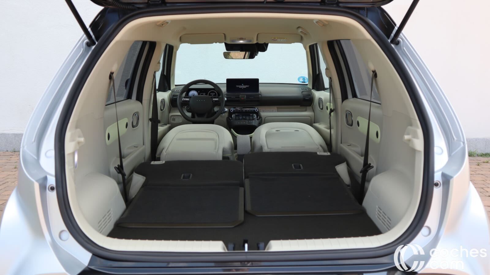 El espacio está bastante bien rematado, para tratarse de un coche pequeño, pero más allá del punto de luz a la izquierda no hay perchas ni ganchos. Lo que sí es posible es abatir los respaldos de los asientos traseros para lograr un espacio de 1.059 litros de capacidad.