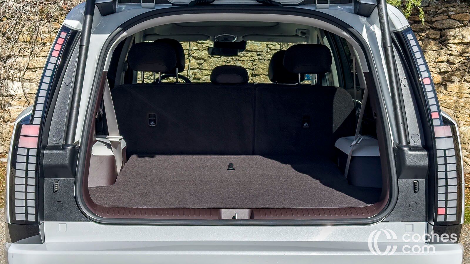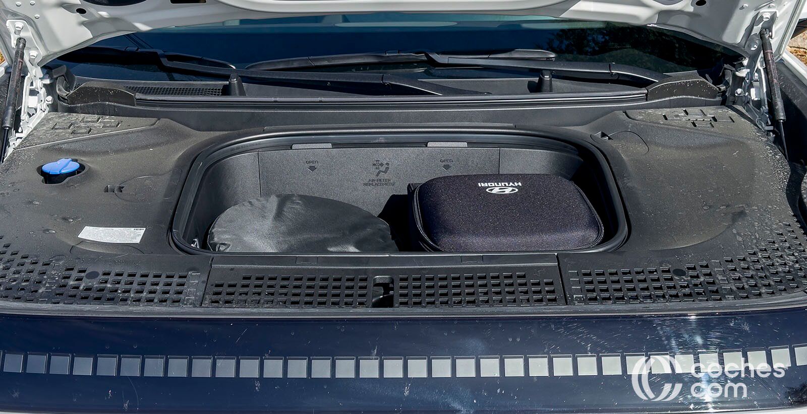 Otros aspectos destacables del maletero serían el portón eléctrico para dejar una gran boca de carga, sumado al hueco bajo el piso para llevar los cables, a la iluminación en esta zona o incluso a las tomas de enchufe convencional. Por si fuera poco, el Ioniq 9 también tiene un maletero delantero, el llamado frunk. En la versión de tracción trasera alcanza una capacidad de 88 litros, mientras que en las de tracción total como la que tenemos nosotros se queda en 52 litros de capacidad.