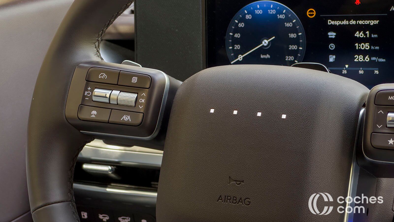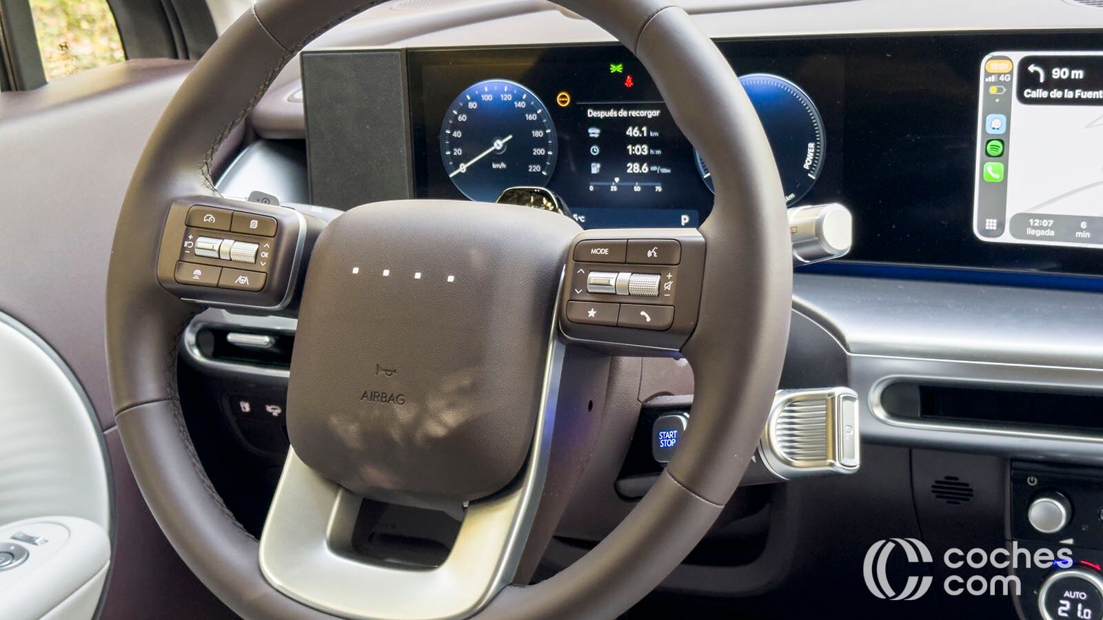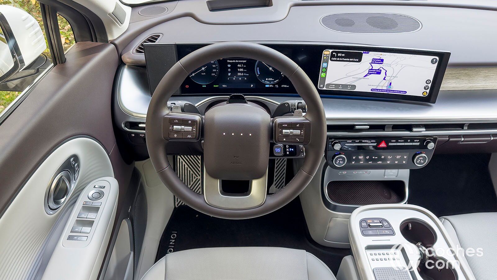 Por cierto, el volante no tiene el logo de Hyundai, sino cuatro puntitos luminosos que cambian de color en diferentes tesituras, como durante la carga. La pantalla táctil principal, también de 12,3 pulgadas, es la que controla la mayoría de funciones. La precisión es más que evidente, pero requiere de cierto periodo de aprendizaje para controlar todo. Además, desactivar algunas alertas nos va a llevar al menos cuatro toques en la pantalla.