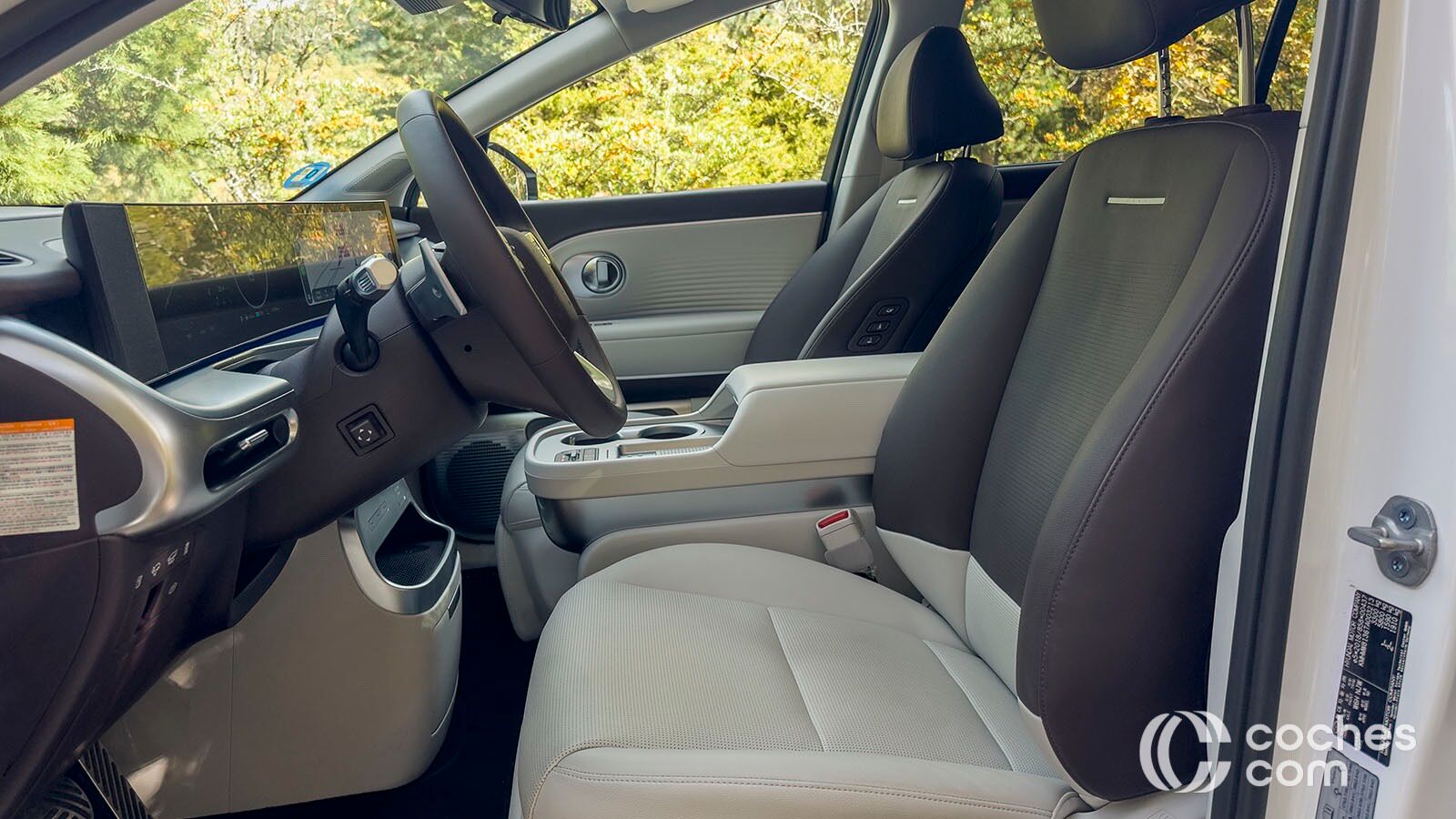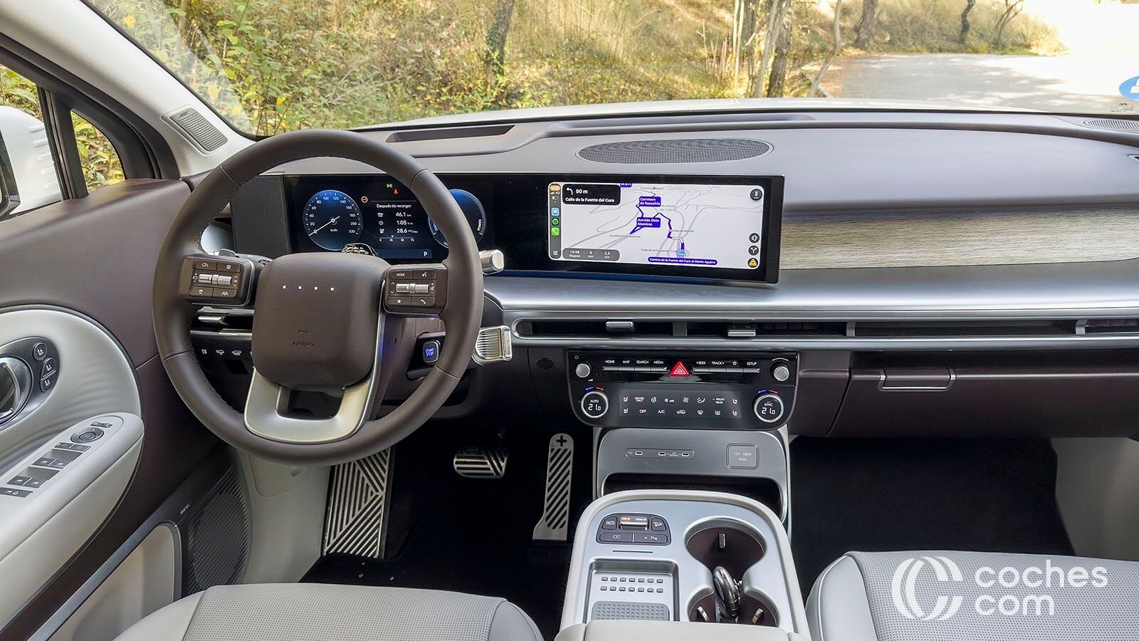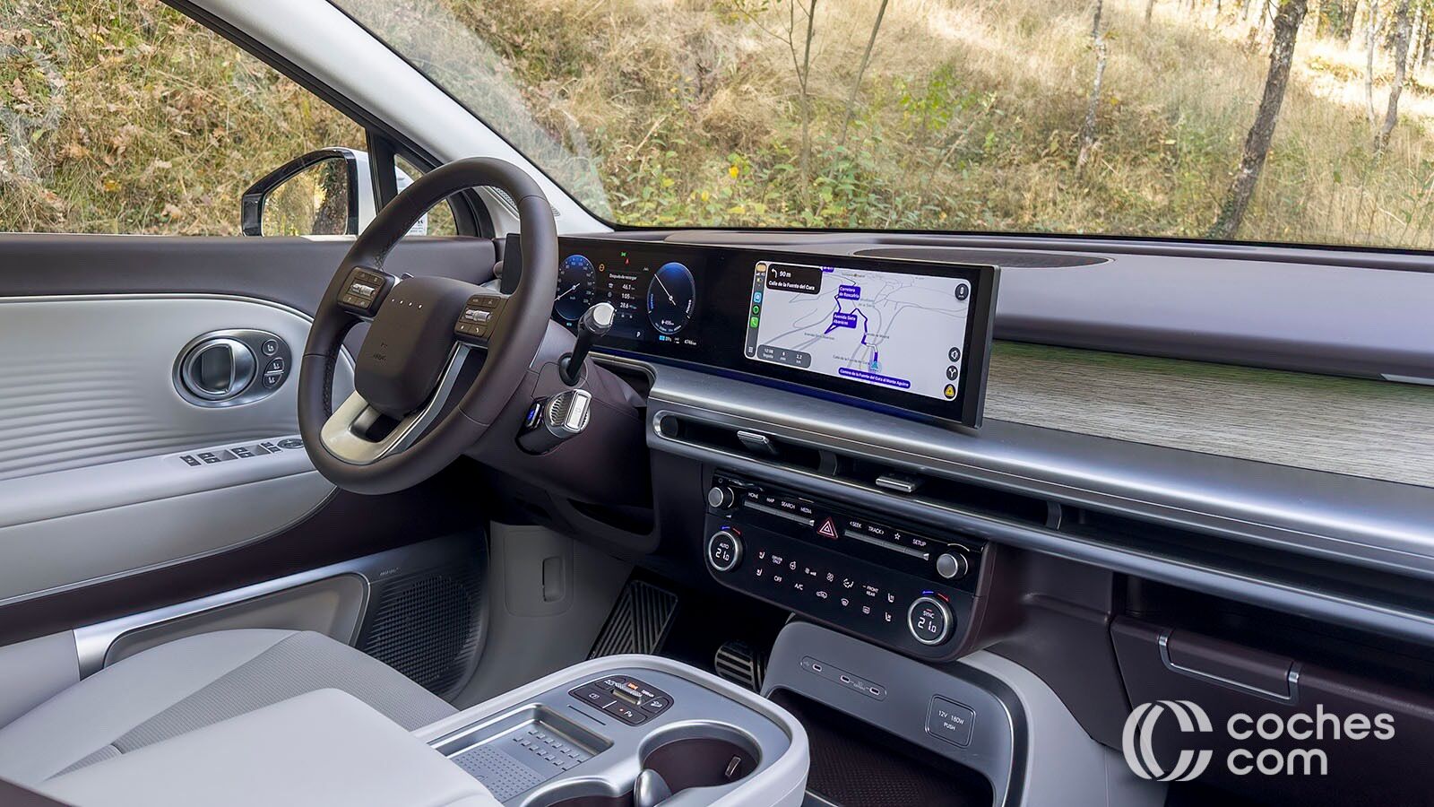 Por cierto, el volante no tiene el logo de Hyundai, sino cuatro puntitos luminosos que cambian de color en diferentes tesituras, como durante la carga. La pantalla táctil principal, también de 12,3 pulgadas, es la que controla la mayoría de funciones. La precisión es más que evidente, pero requiere de cierto periodo de aprendizaje para controlar todo. Además, desactivar algunas alertas nos va a llevar al menos cuatro toques en la pantalla.