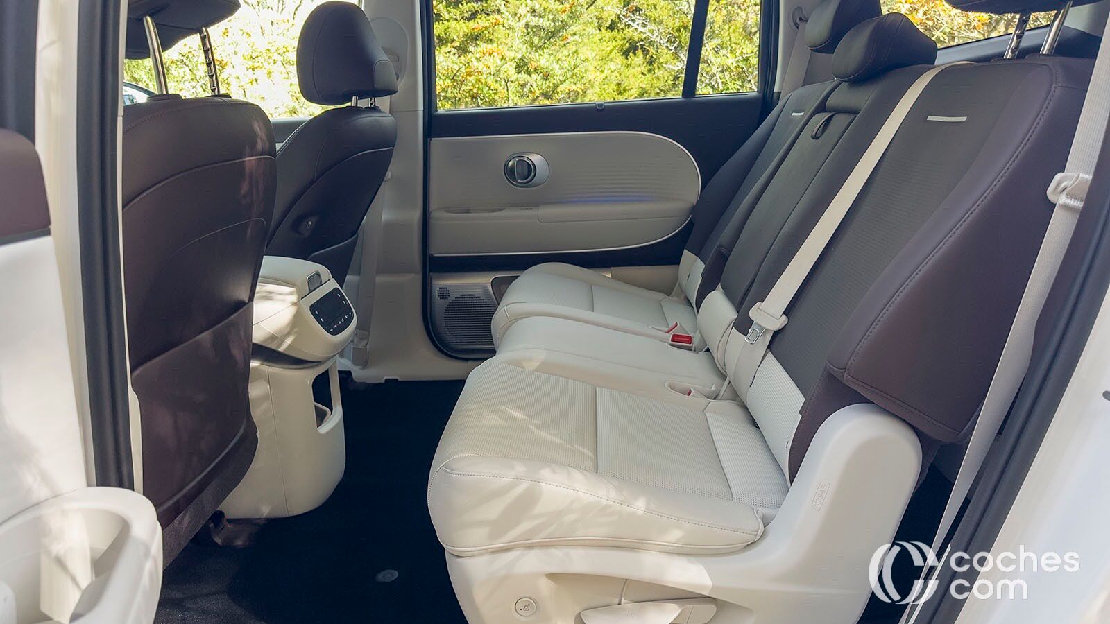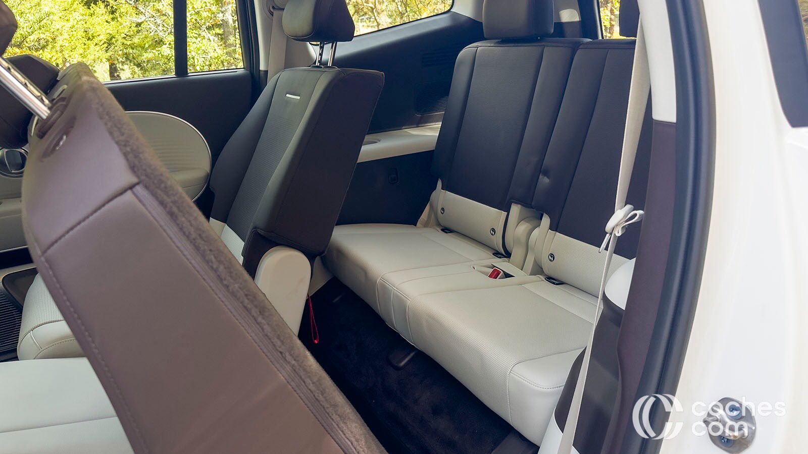 En nuestro caso, tenemos un Ioniq 9 con siete plazas, en configuración 2+3+2, aunque también hay una con asientos individuales en la segunda fila para mejorar el confort. Hay que decir que es muy fácil abatir los asientos de forma eléctrica y que el acceso a la tercera fila es bastante cómodo. En los últimos asientos vemos bastante espacio y también facilidades, podríamos decir que son bastante destacadas viendo a sus rivales.