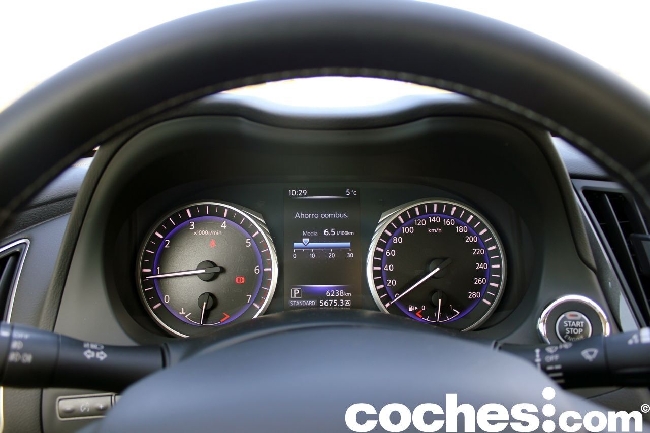 Y llega la hora de ponerse en marcha. Lo primero que me llama la atención es que el motor es bastante ruidoso y transmite muchas vibraciones al ralentí. Imagino que será porque el coche esta todavía frío... así que mejor esperar. Cuando el motor alcanza temperatura, desaparece algo el ruido, pero no las vibraciones. Estas molestias típicas de propulsores de gasóleo van desvaneciéndose a medida que ganas velocidad. Si en ciudad y en vías de circunvalación esas vibraciones se perciben bastante, el Q50 se vuelve muy agradable de conducir en carretera y autovía, y no cuesta en absoluto hacer más y más kilómetros.