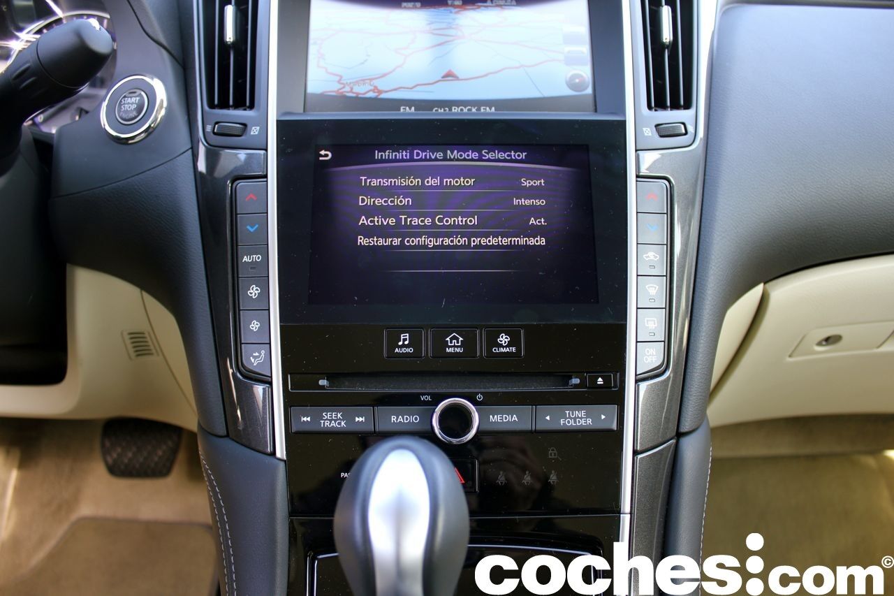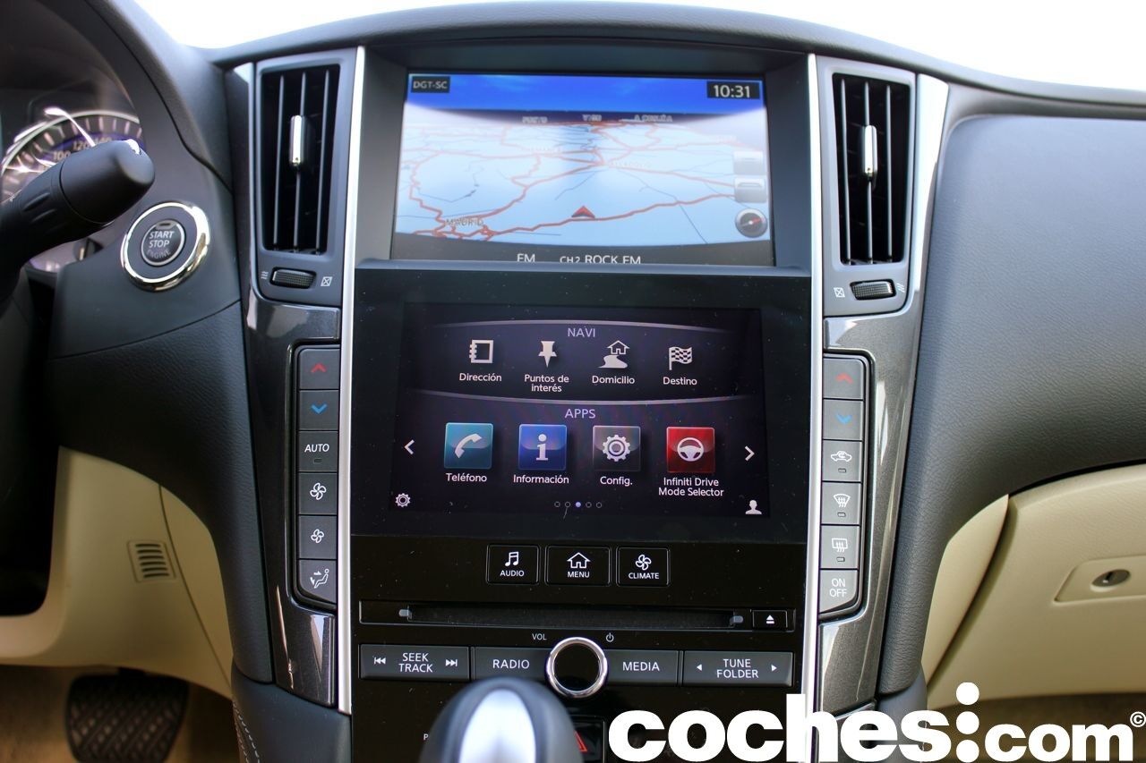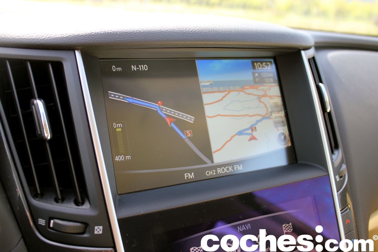 No hay que ser un experto en tecnología para controlarlas. Son táctiles y cuenta con iconos muy grandes y visibles sin que haya que desviar mucho tiempo la vista de la carretera. También hay botones manuales para las funciones más habituales, como sintonizar la radio, el volumen o controlar el climatizador. Parece que en Infiniti se han leído nuestra guía para elegir sistema multimedia del coche. El acabado es brillante y de calidad... pero es de esos que atrapa bastante polvo.
