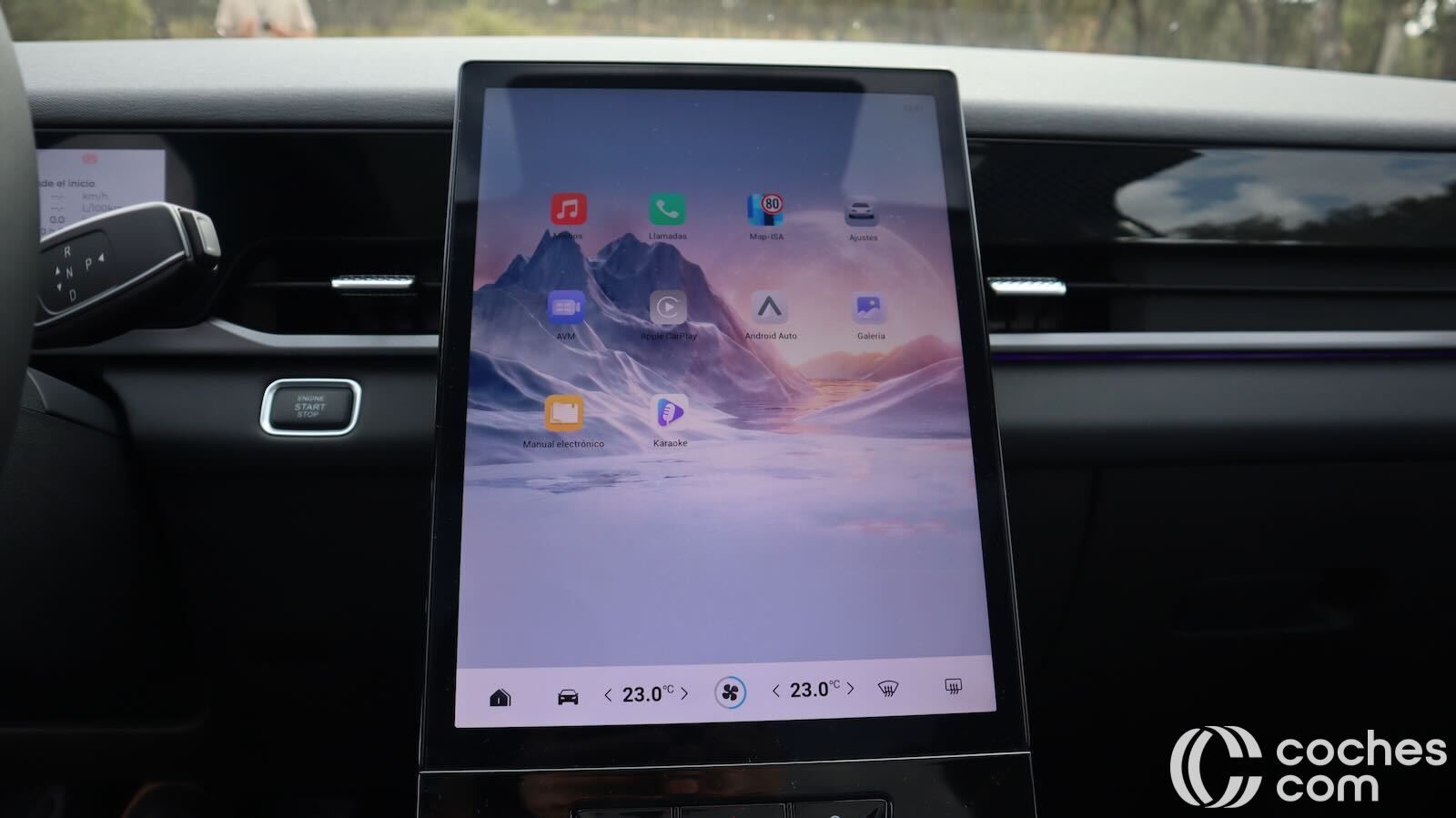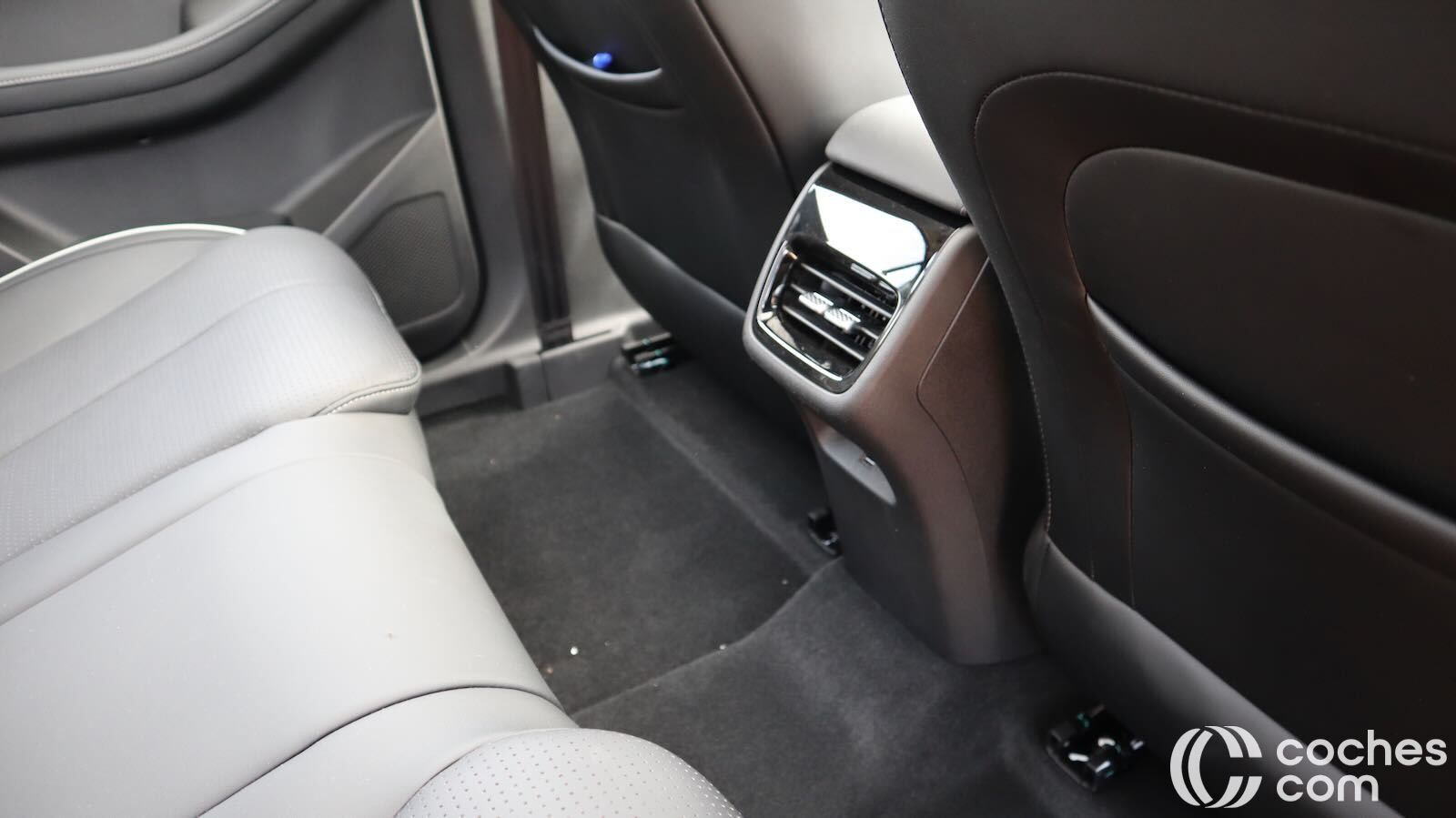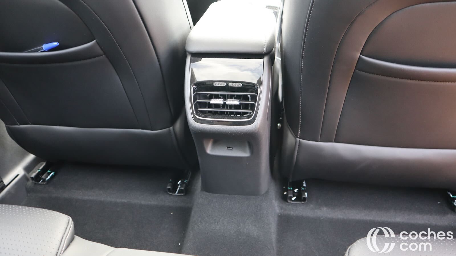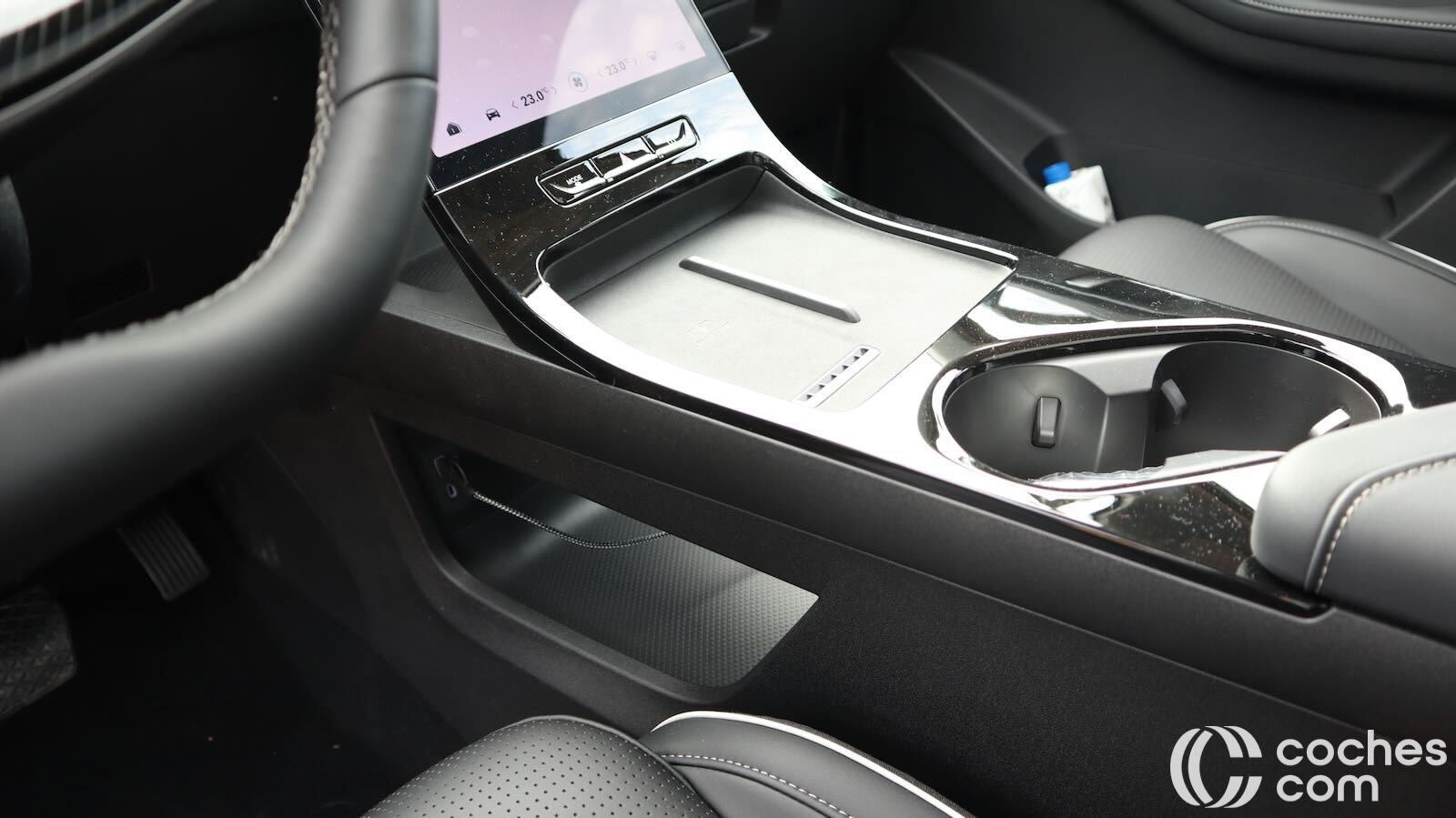 La consola central flotante aporta huecos, posavasos y un generoso portaobjetos refrigerado; la palanca de cambios se reubica junto al volante, ahorrando espacio.