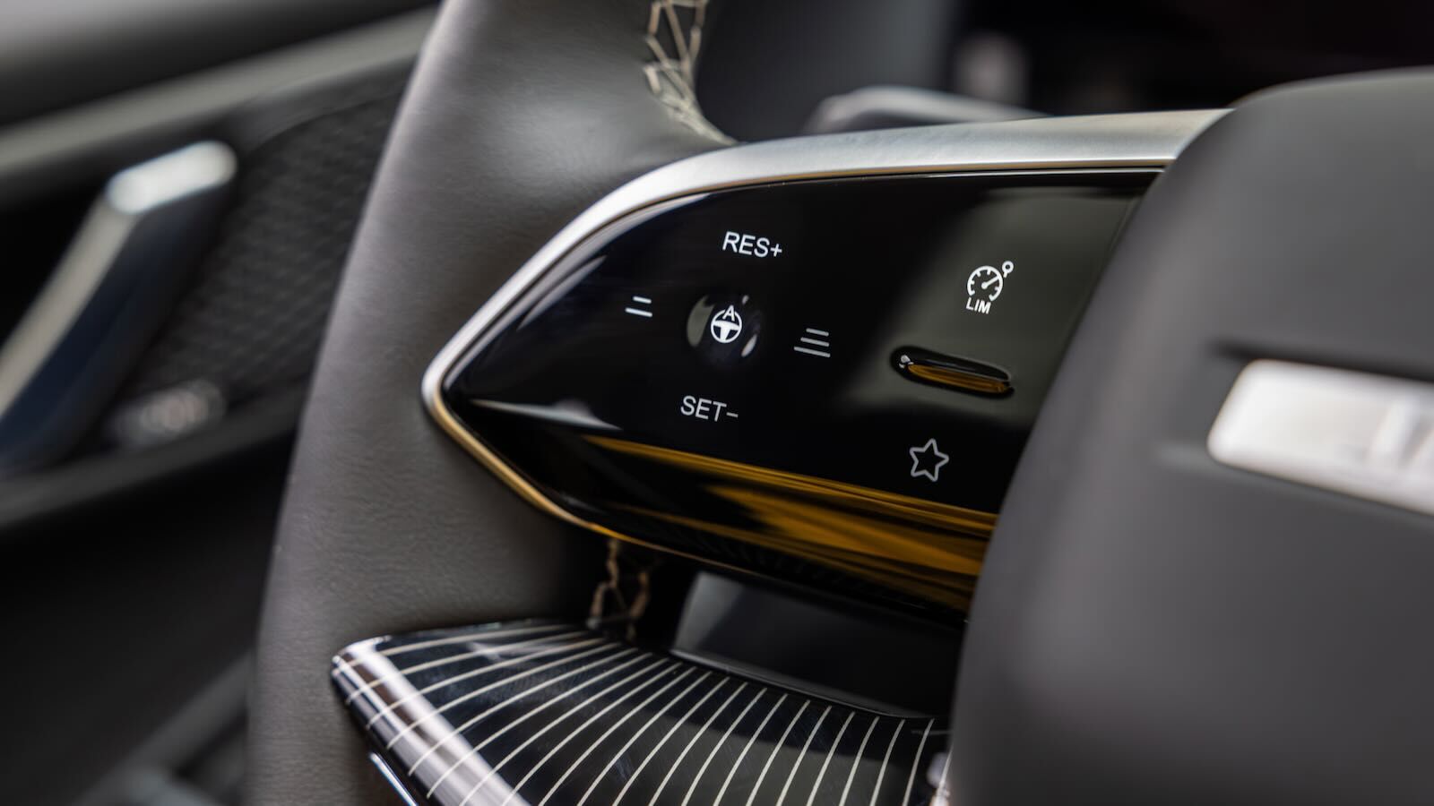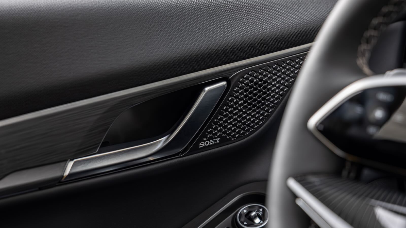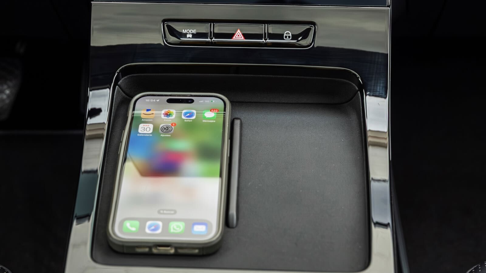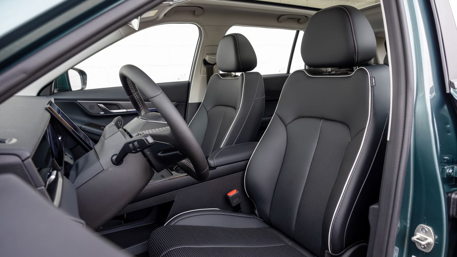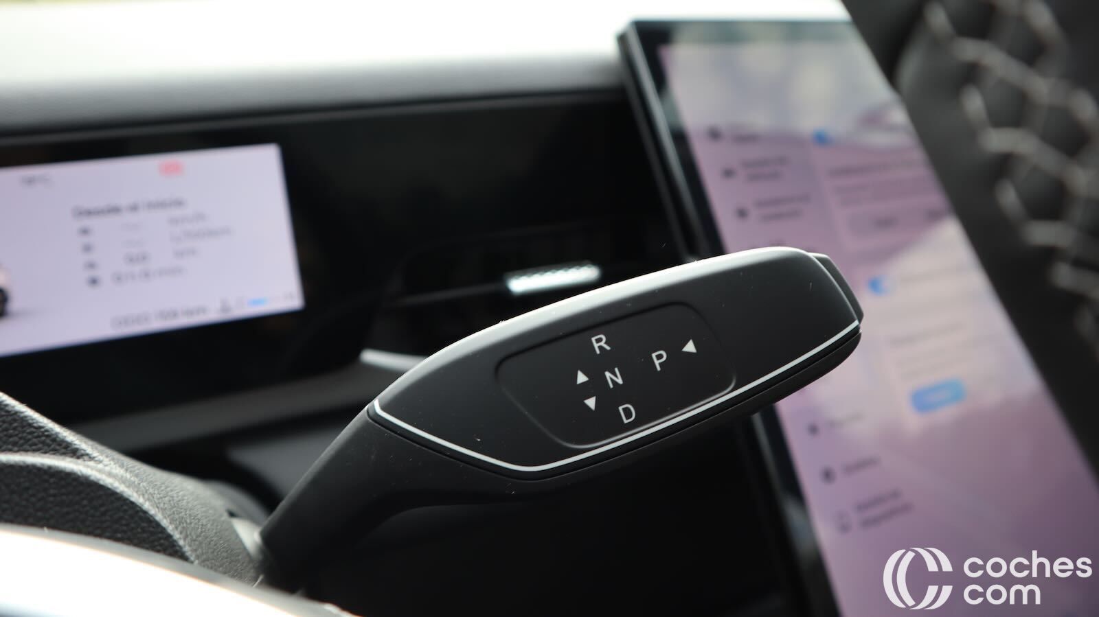 La consola central flotante aporta huecos, posavasos y un generoso portaobjetos refrigerado; la palanca de cambios se reubica junto al volante, ahorrando espacio.