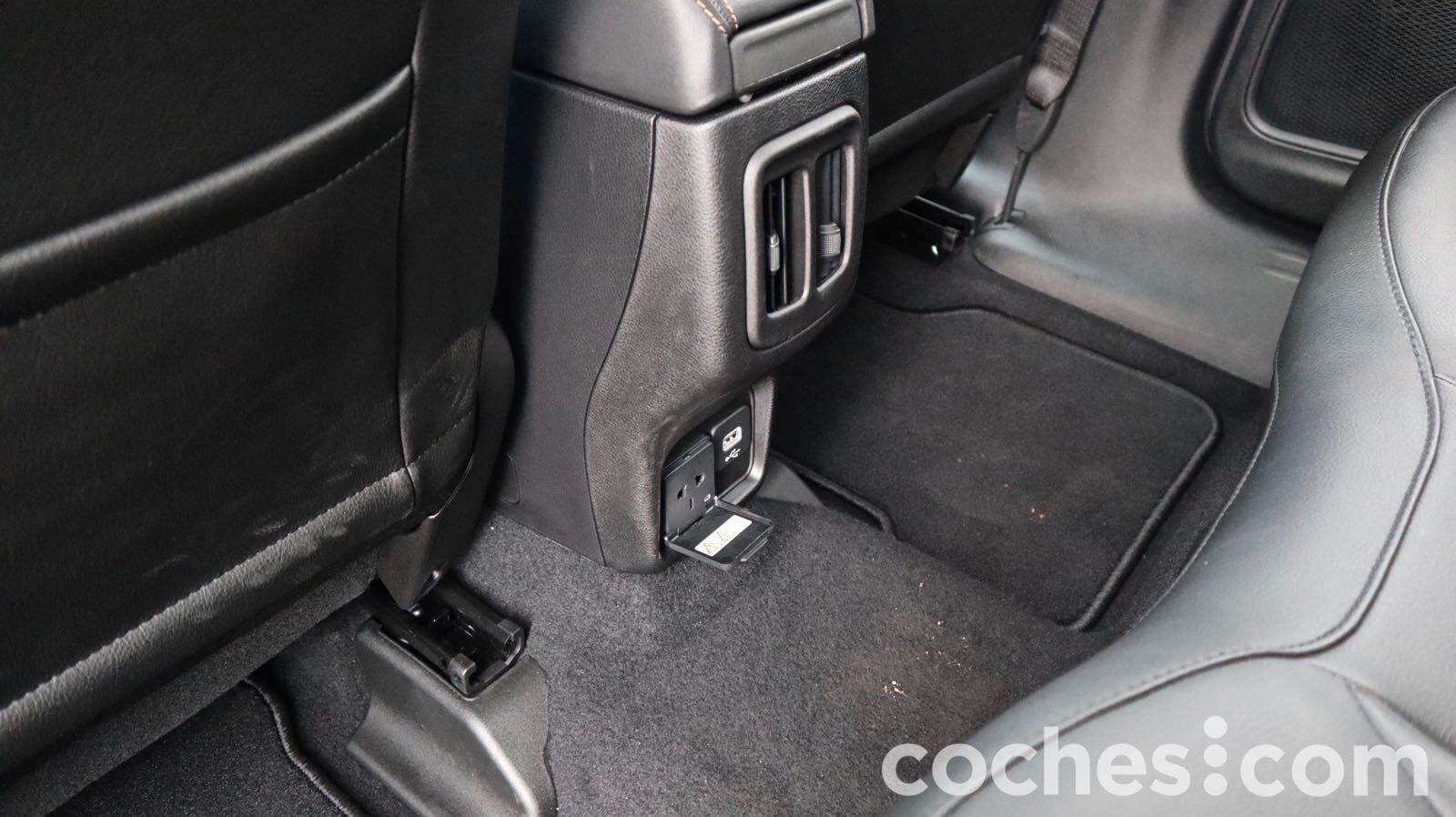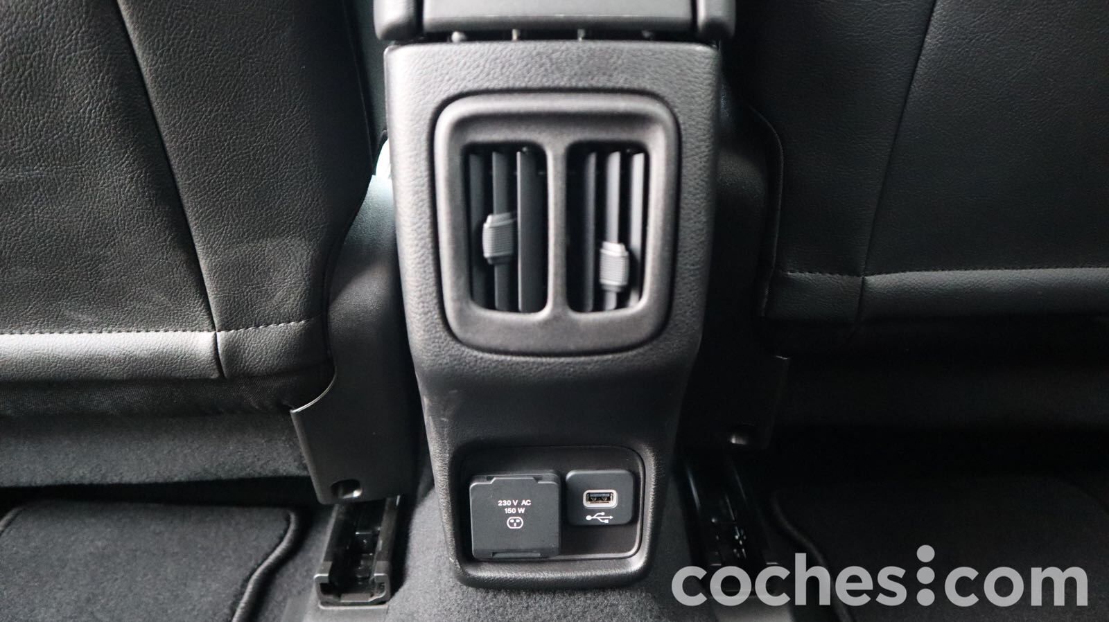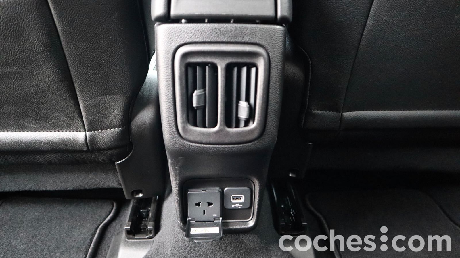 Las plazas traseras cuentan con una buena longitud para las piernas, pero son algo justas para la cabeza y no destacan en anchura. Contamos, eso sí, con salida independiente para el aire acondicionado y tomas de 220 V y USB.
