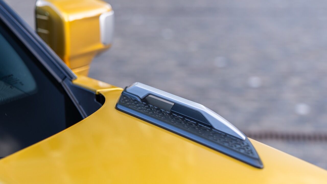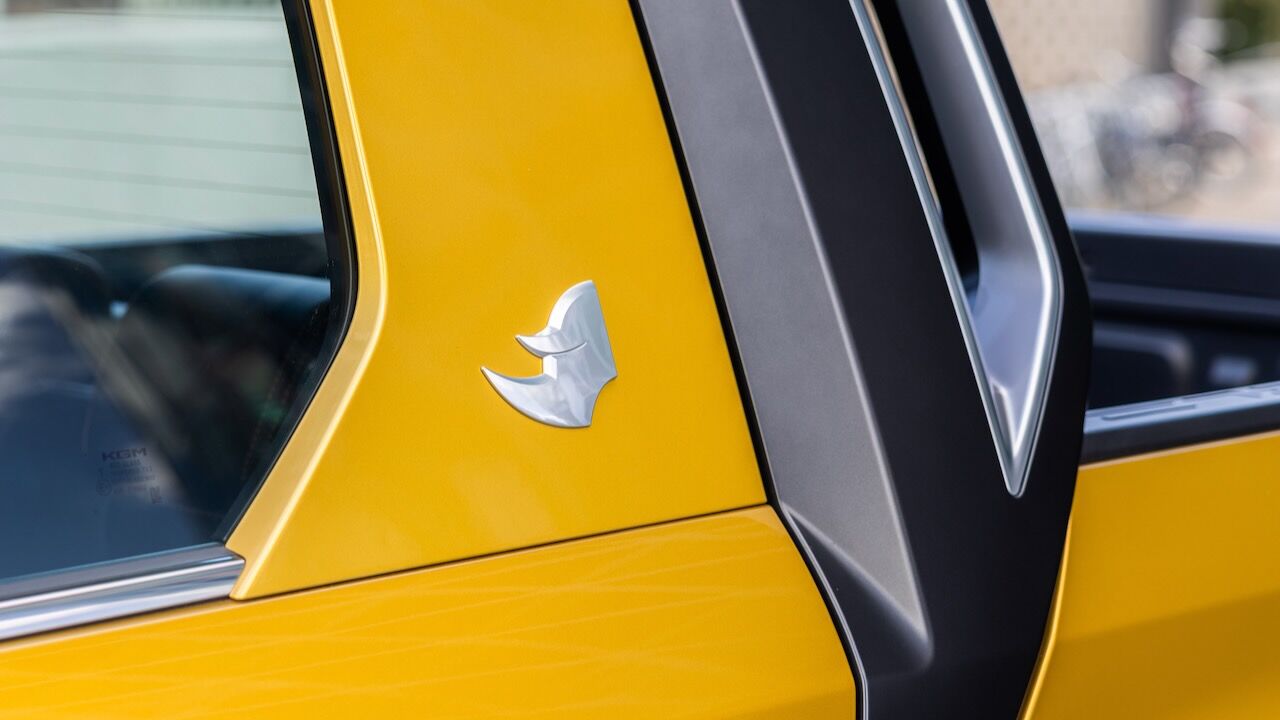 Ahí queda claro que la KGM Musso EV es un vehículo robusto, pues los plásticos protectores se extienden a lo largo de todos los bajos de su carrocería. Eso incluye unos pasos de rueda que integran las llantas de 17 pulgadas, con acabado diamantado para darle un extra de distinción. Otros detalles llamativos son los retrovisores angulares o los generosos estribos, mientras que las barras te techo completan el pack de robustez. Como nota curiosa, la pick-up hace referencia al rinoceronte que le da negro con una insignia plateada en el pilar C.
