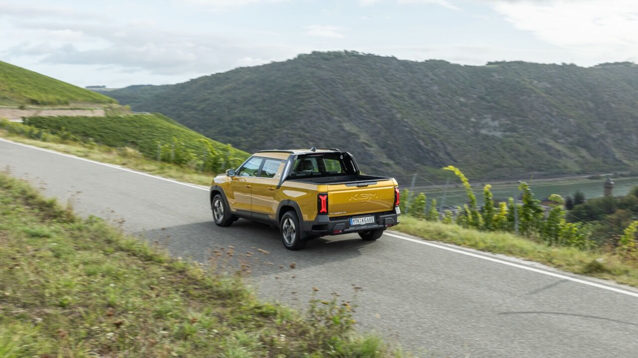 Fuimos uno de los primeros medios en ponerse al volante del KGM Musso EV en los alrededores de Frankfurt. Compartimos ruta con la versión 2WD, aquella de tracción delantera con 207 CV y 339 Nm de par, un nivel de potencia que está bien para tratarse de la versión de entrada. Va en línea con lo que ofrecen otras pick-up diésel, con la ventaja adicional de tener ese par instantáneo y una respuesta suave y lineal. En su ficha técnica (provisional) vemos datos como una aceleración de 0 a 100 km/h en 9,2 segundos y una velocidad máxima de 162 km/h.