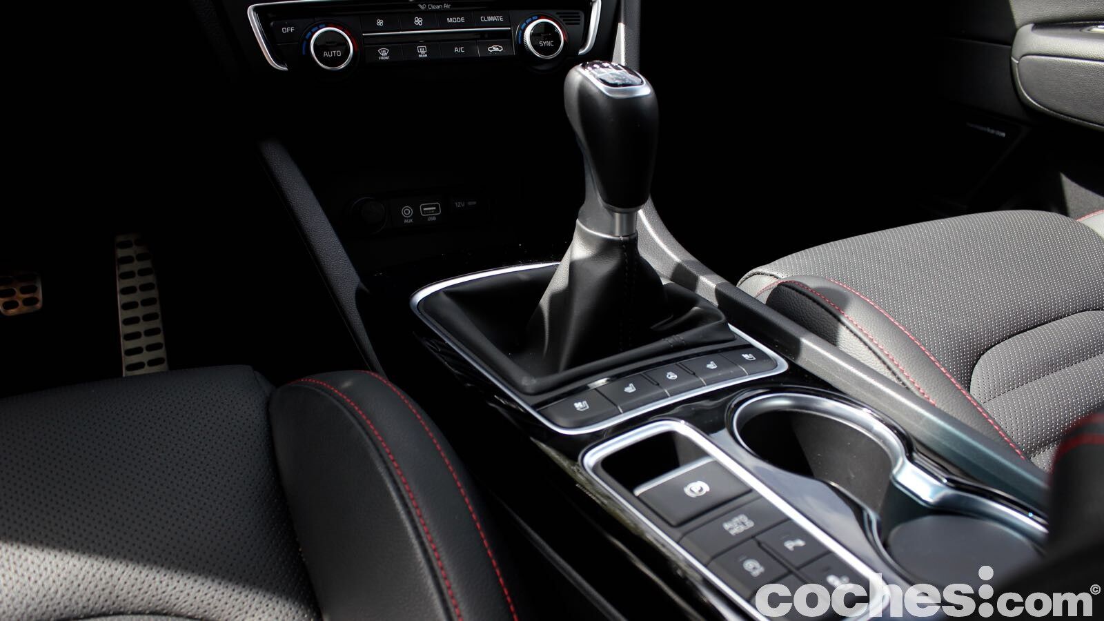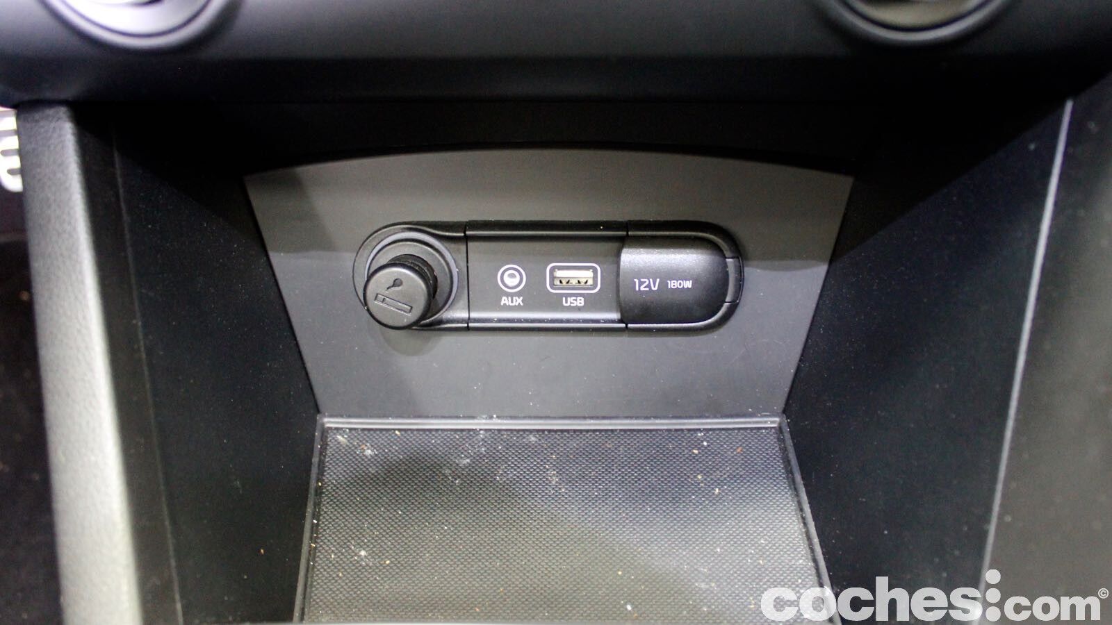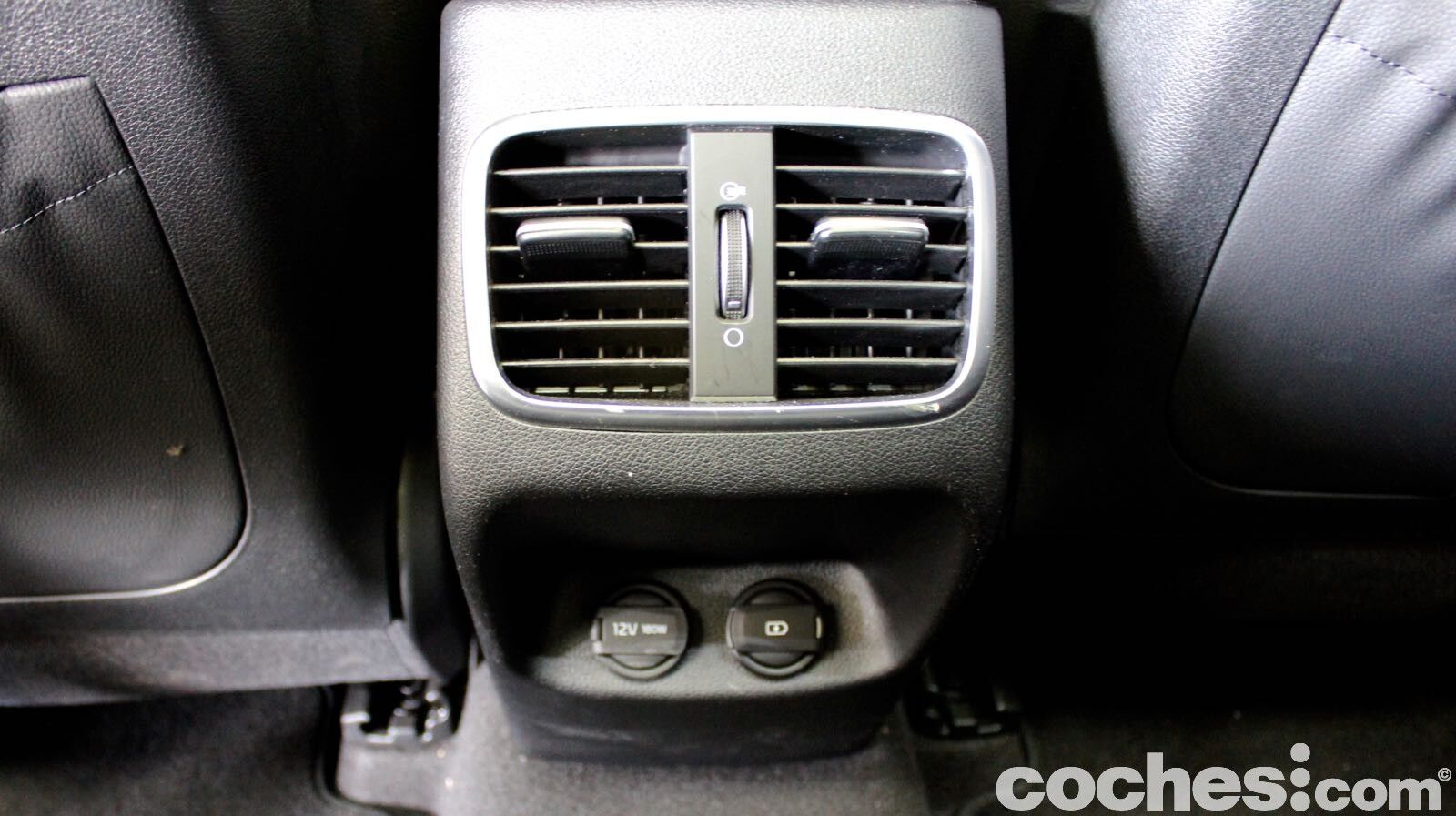 Bajo la consola encontramos un hueco donde poder dejar objetos y las tomas Aux in, USB y 12V justo enfrente de la palanca de cambios (puede contar con cargador inalámbrico). Allí también hay mandos para controlar los asientos calefactables y ventilados, freno de estacionamiento eléctrico, asistente de aparcamiento…