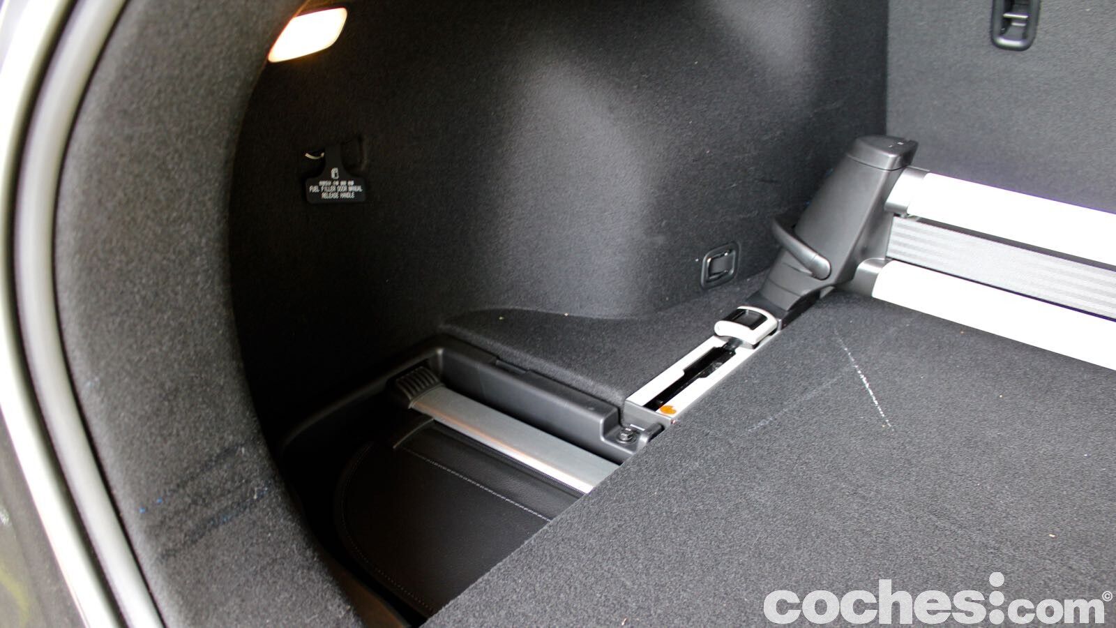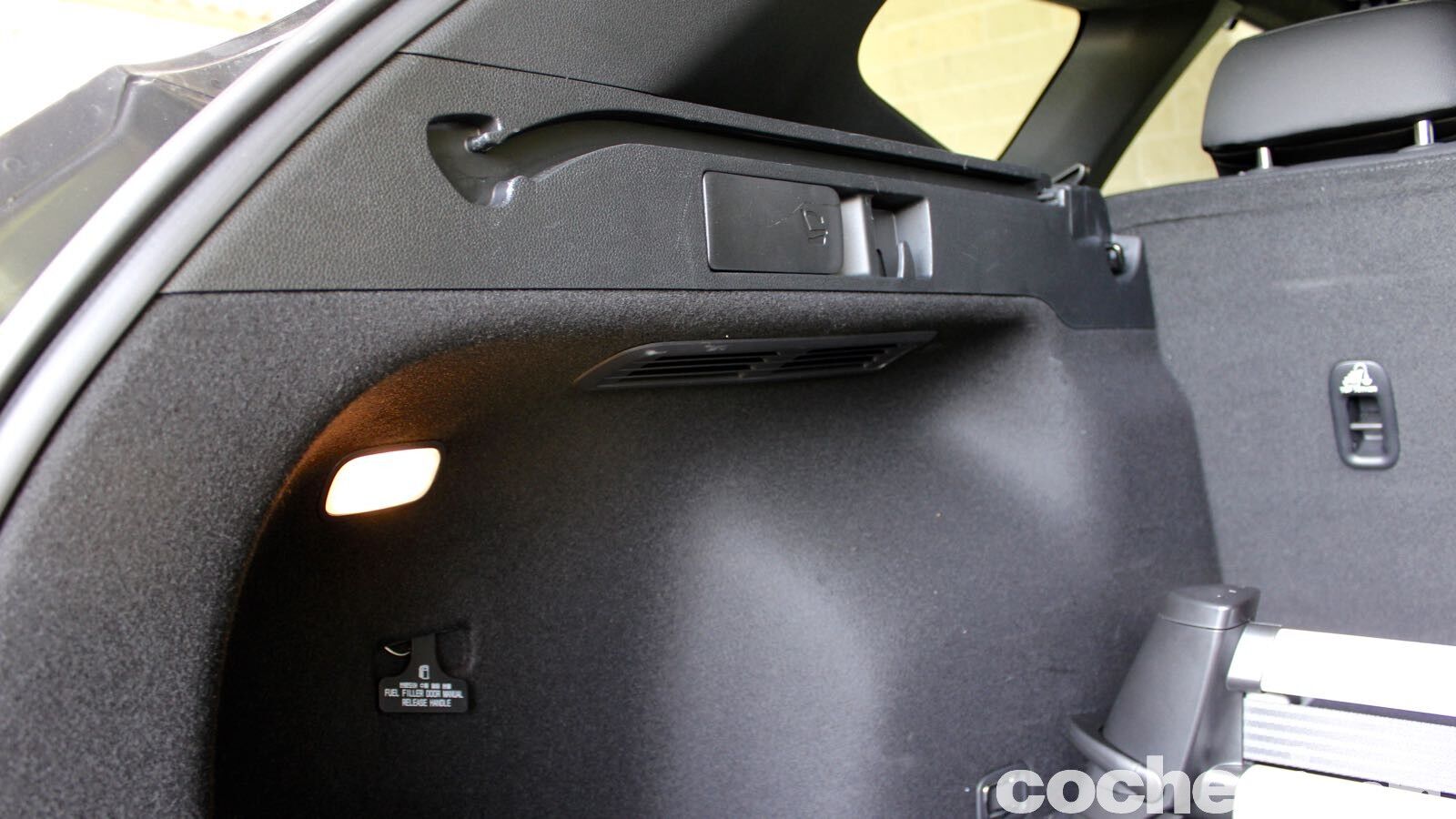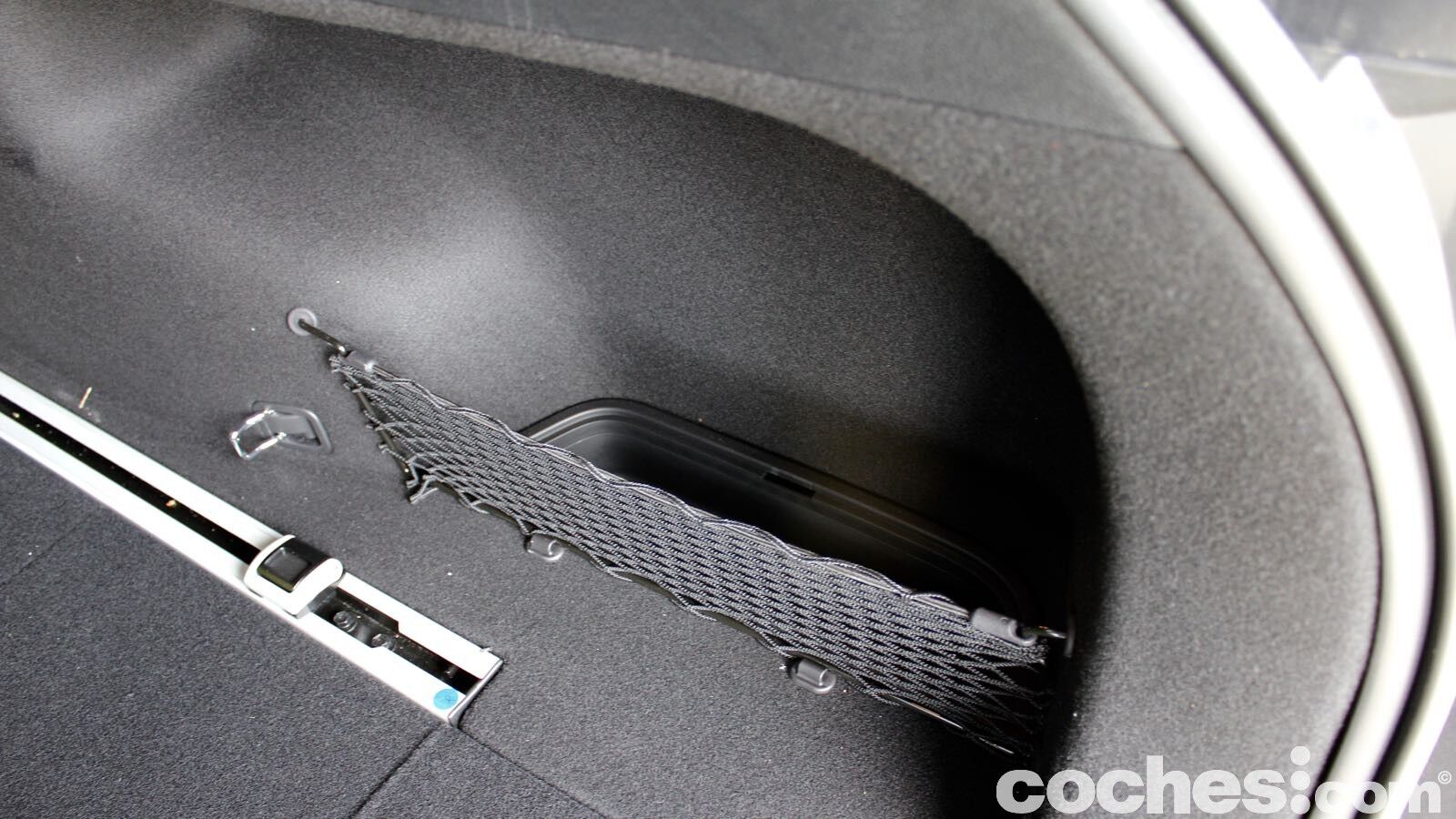 Levantando el piso enmoquetado se accede al doble fondo, donde se encuentra el kit antipinchazos, si bien parece que hay suficiente espacio para una rueda de repuesto de emergencia. También hay ahí un espacio donde poder guardar el toldo enrollable que oculta la carga cuando no se necesita… y que monta una práctica red separadora que permite llenar el cofre hasta arriba sin temor a que los objetos pasen dentro del habitáculo.