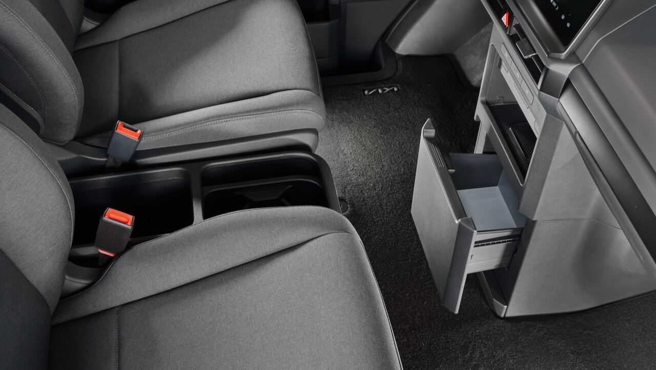 Acceder al interior del KIA PV5 es una experiencia diferente. Lo primero que llama la atención es su generosa superficie acristalada, con unas ventanillas que llegan mucho más abajo que en sus rivales. Eso tiene ventajas más que evidentes por la visibilidad, además del aporte extra de luminosidad. Se nota que es un vehículo con vocación comercial debido a las numerosas soluciones de almacenamiento. Vemos compartimentos bajo los asientos, en la zona de las alfombrillas, en la consola central, varias guanteras...