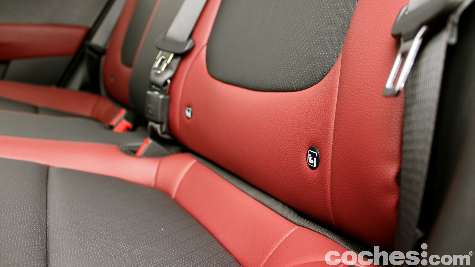 El aspecto de todos los mandos y materiales es bueno, pero hay bastantes plásticos duros, que aparecen incluso en los paneles de las puertas, donde se echa de menos que estén tapizados. En España, al menos al inicio de la comercialización, no podrás ver esas molduras decorativas en dos colores que le dan un aspecto más sofisticado (o en un plástico blando). El interior solamente podrá elegirse en negro y los asientos de tela (en símil cuero bitono, a juego con esas molduras, en nuestra unidad de pruebas).