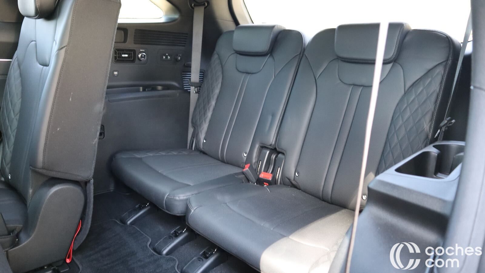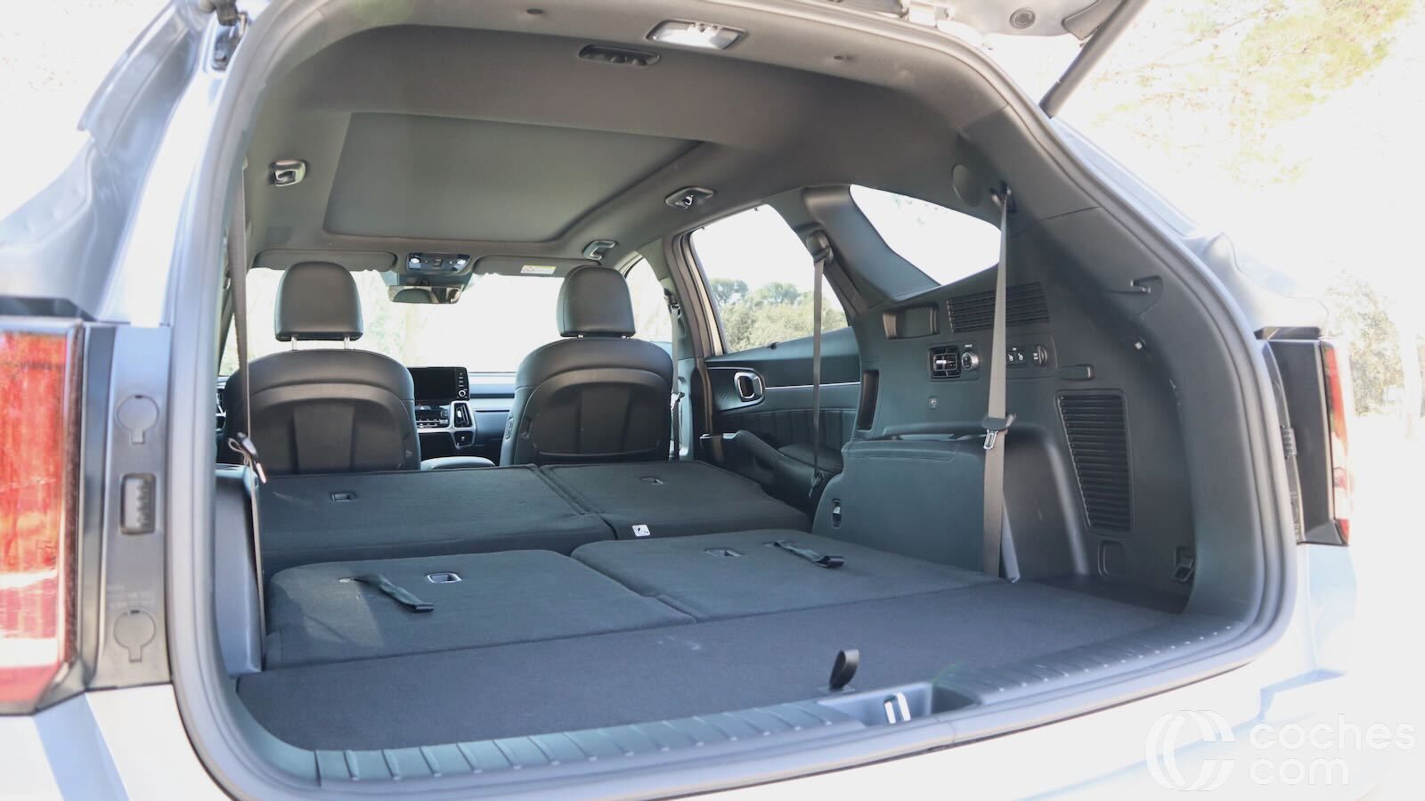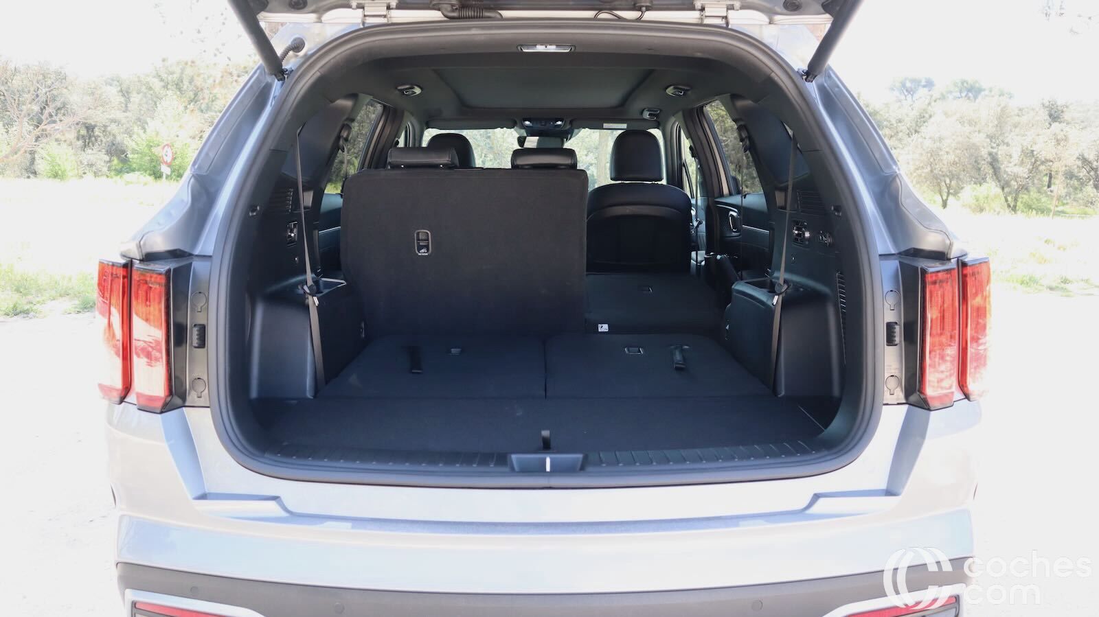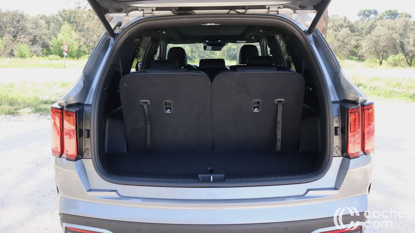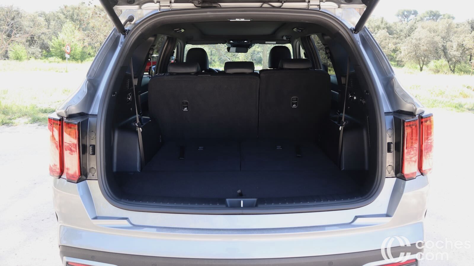 Con cinco plazas el Kia Sorento híbrido anuncia hasta 813 litros de capacidad si pones los asientos en su posición más adelantada, 608 en la más retrasada. Son unas cifras realmente buenas para un modelo con su sistema de propulsión. Si abates las dos filas traseras y te quedas con dos asientos cuentas con 1.996 litros de capacidad.
