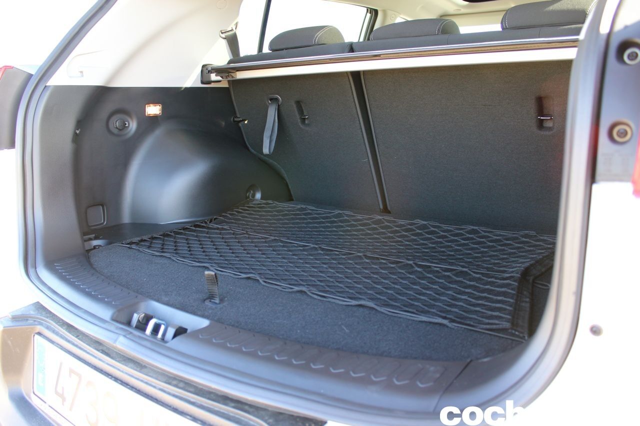 En el espacio de carga tenemos una pequeña luz y una toma de 12 voltios en la parte izquierda, un pequeño compartimento en la parte derecha y una red que se puede sujetar en varios puntos para mantener la carga en su sitio. Si levantamos el piso (que puede quedar elevado mediante un sencillo gancho), nos encontramos con la rueda de repuesto (de la misma medida del resto, con llanta de aleación), los triángulos y el gato.