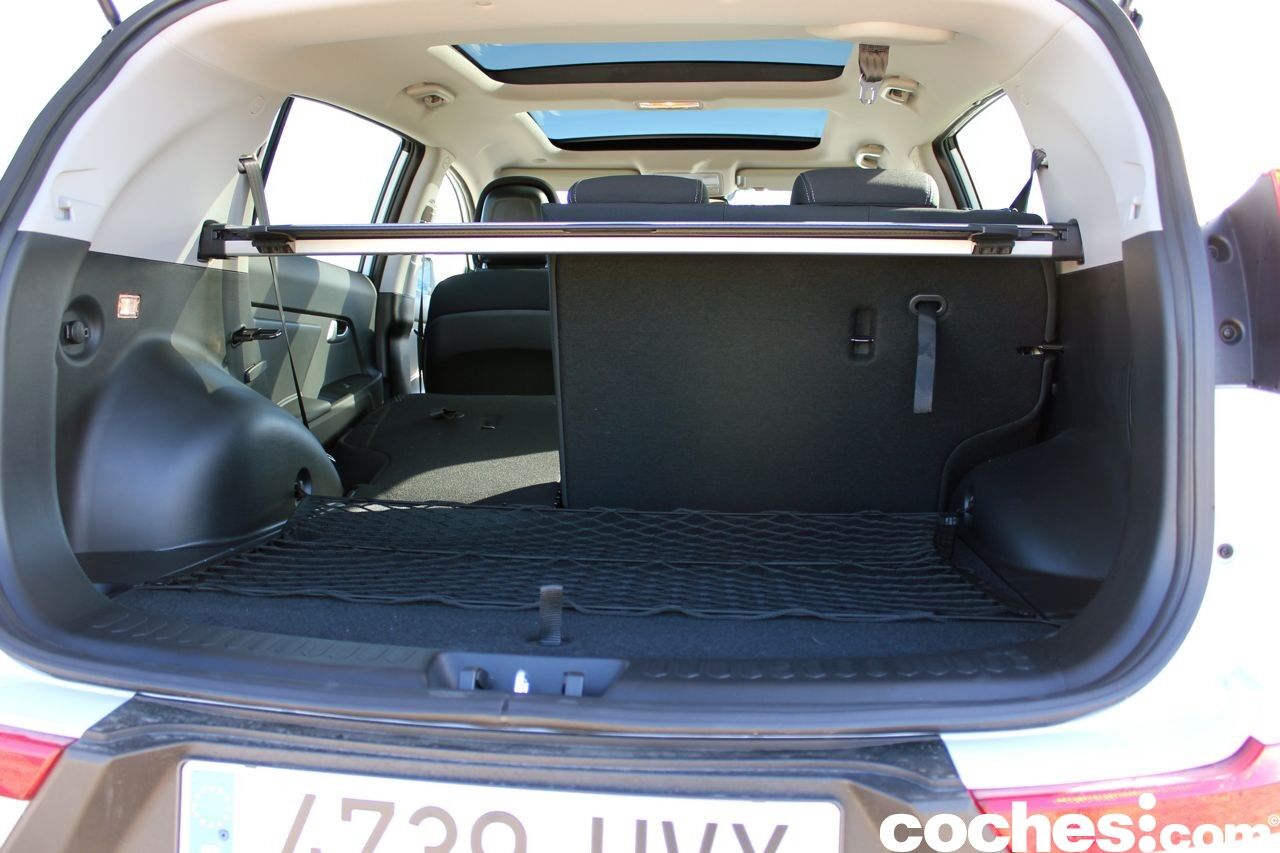 El maletero del Kia Sportage anuncia una capacidad de 465 litros, que es una buena cifra si tenemos en cuenta el espacio para las piernas con que contamos en las plazas traseras. A pesar del espacio robado por los pasos de rueda, el maletero es bastante aprovechable ya que tiene unas formas interiores bastante regulares.