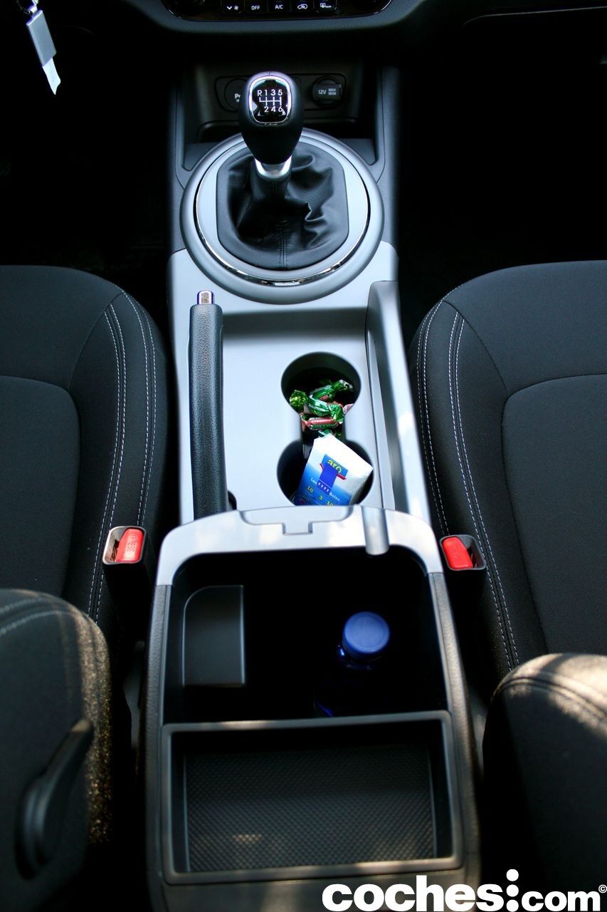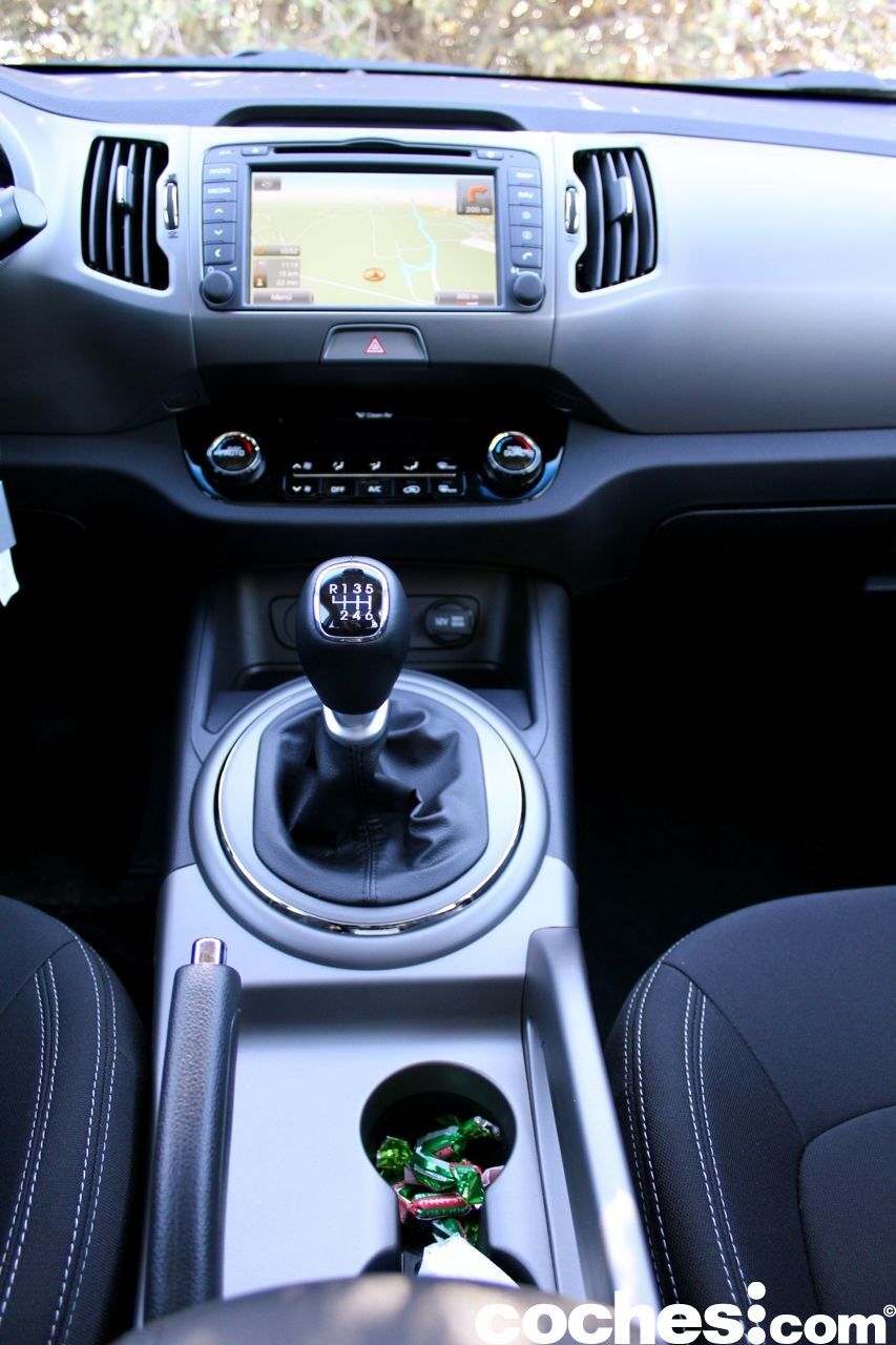 El espacio de almacenamiento en el interior del habitáculo es correcto, pero no espectacular para un coche con vocación familiar como eset Kia Sportage. Incluye una guantera refrigerada )del tamaño justo para dejar la documentación y el chaleco de emergencia) un cofre de seis litros de capacidad entre los dos asientos, que sirve de apoyabrazos al estar cerrado.