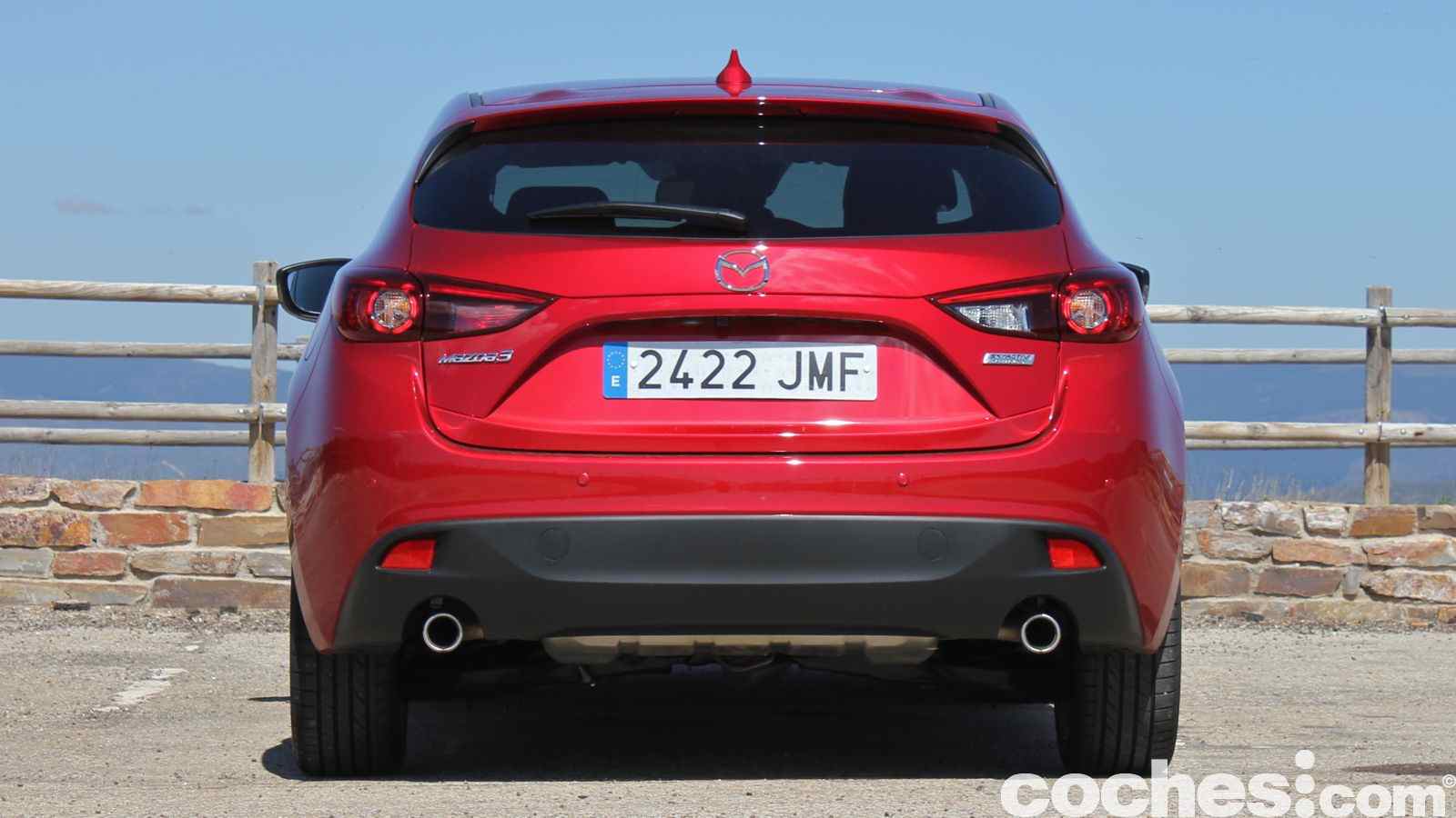Los pilotos traseros se caracterizan por unas ópticas circulares que recuerdan a los del Mazda 6, el primer modelo creado bajo la filosofía Kodo, a imagen y semejanza del prototipo Shinari que pudimos ver y tocar. Las dos salidas de escape a ambos lados le dan un aire deportivo, pero quizá se abusa un poco del plástico negro en esa zona.