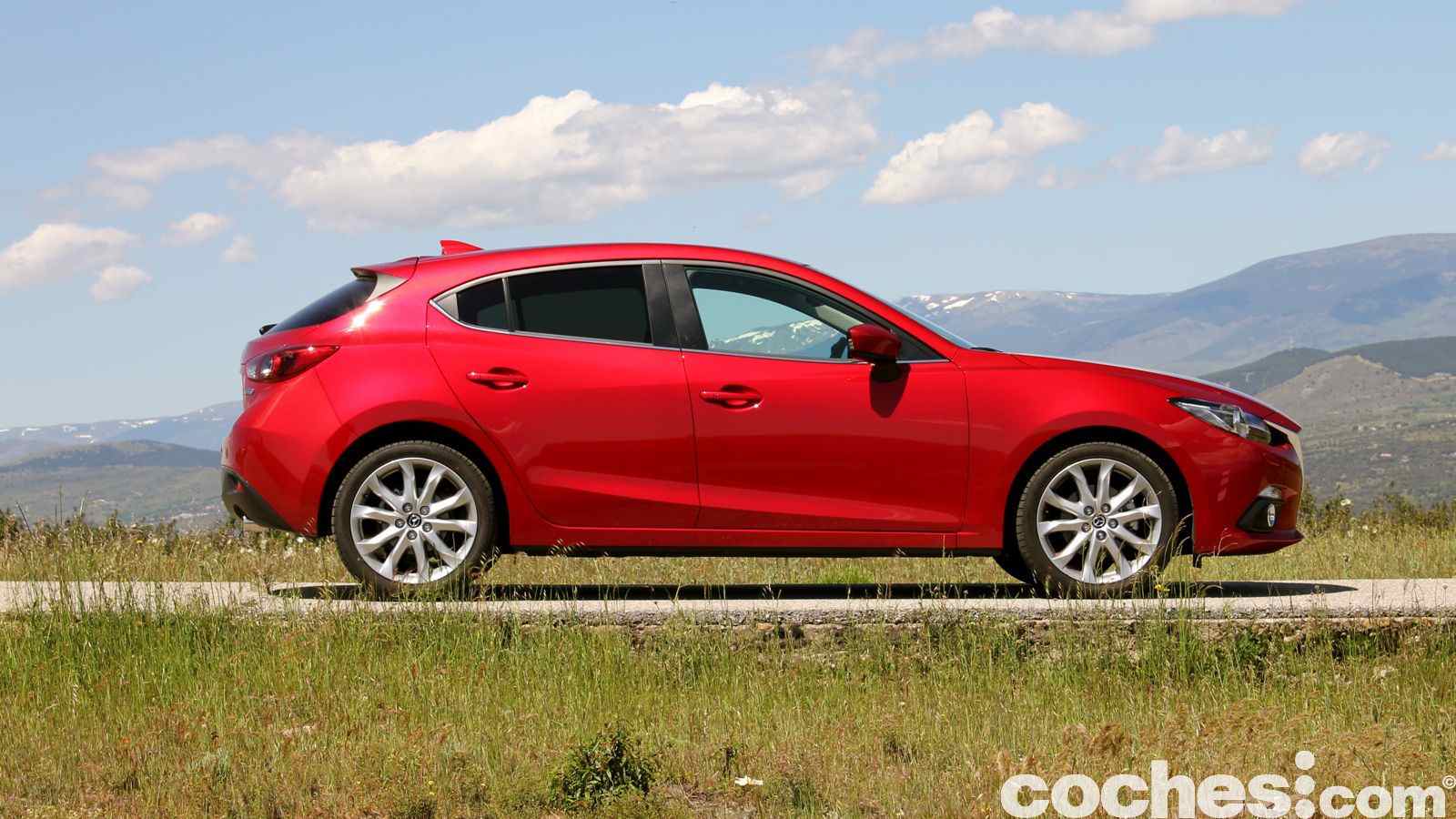 El capó tan largo, con el habitáculo desplazado hacia atrás hace parecer que el coche sea muy largo, pero en realidad se trata solamente de proporciones. Porque mide 4.460 mm de longitud, si bien ahora es algo más ancho (1.795 mm, 40 más) y algo más bajo (1.455 mm). En esta vista lateral, se aprecia también la elevada línea de cintura, que se eleva en las puertas traseras, y la gran distancia entre ejes, con los voladizos muy cortos. Gracias a ello mejora su estabilidad en carretera a tiempo que gana habitabilidad interior. Su coeficientes aerodinámico es muy bueno, de 0,275 Cx en esta carrocería el 5 puertas, que se reduce a 0,26 en el Mazda 3 SportSedan 2014.