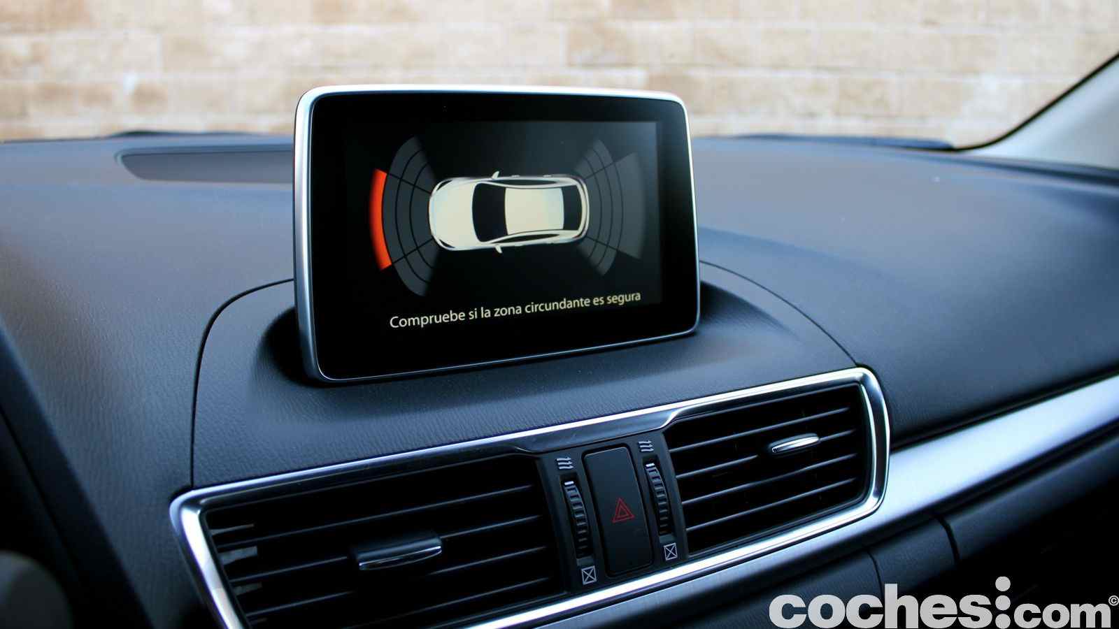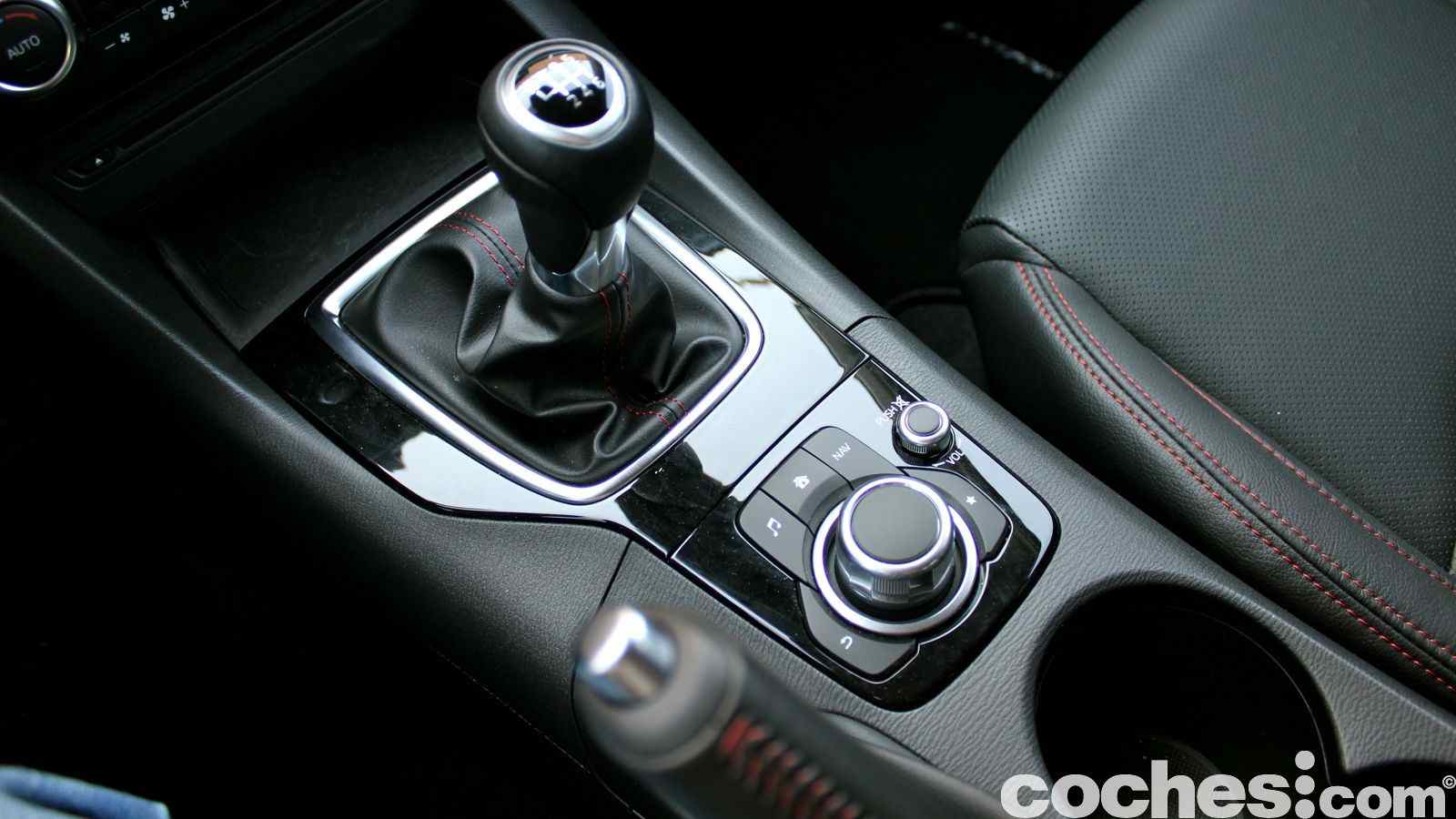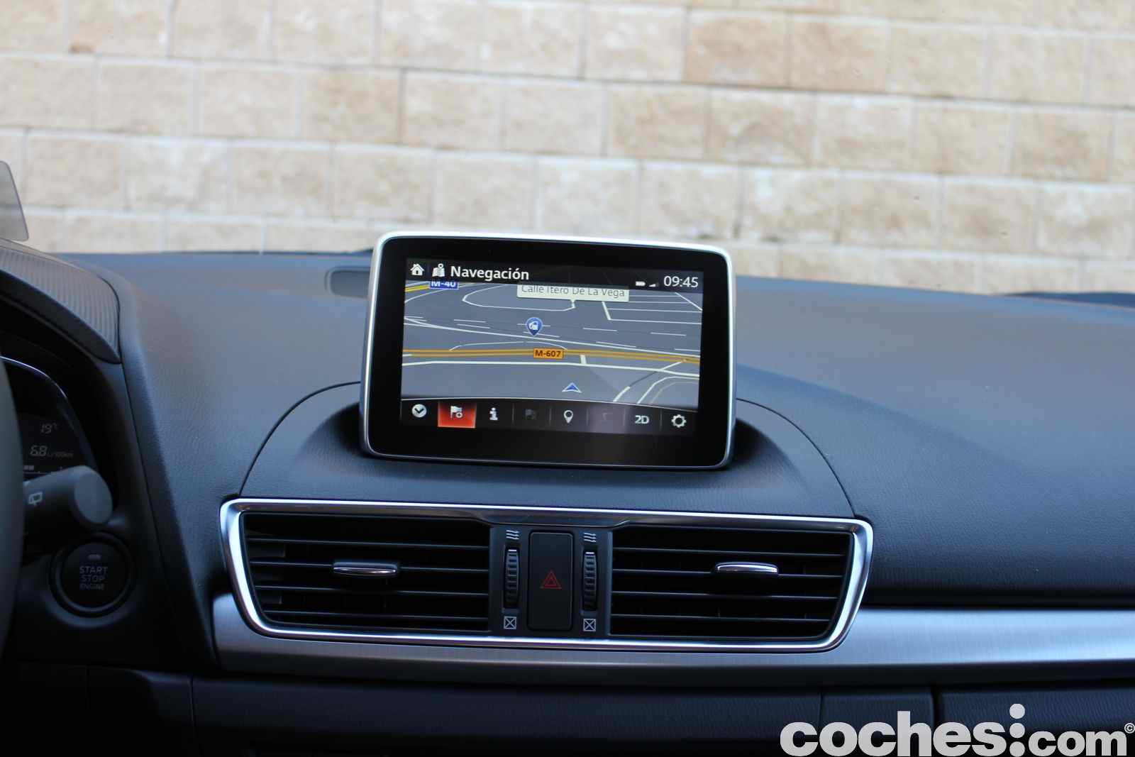 En la consola central el protagonismo corre a caro de una pantalla táctil TFT de siete pulgadas. No está integrada en el salpicadero, sino que queda buena parte de la misma al aire. No molesta la visibilidad de la carretera, se ve bastante bien y se controla a la perfección desde el mando mando giratorio HMI Commander, situado entre los asientos delanteros. Su utilización resulta muy intuitiva, si bien es cierto que realicé esta prueba tras pasar una semana con el Mazda 2, que también lo equipaba. Está en una posición adelantada, perfecta para controlarlo sin no tener que variar la postura de conducción mientras vas en marcha.