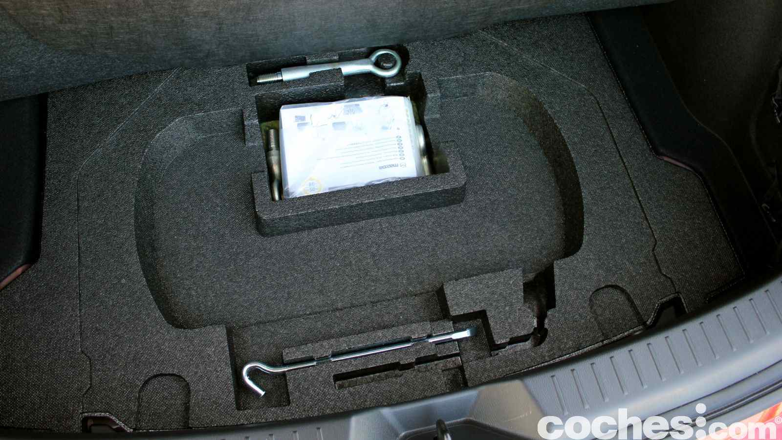 El diseño de la carrocería hacxe que el borde de carga quede un poco alto y hay que salvar un pequeño escalón para dejar las cosas en él... que puede dificultar ligeramente la descarga de bultos grandes y pesados. A diferencia de muchos de los modelos actuales, no cuenta con un doble fondo, bajo el que poder guardar cosas y que no queden a la vista. Si levantas el piso del maletero te encuentras directamente con un kit de reparación de pinchazos (puede llevar una rueda de repuesto de emergencia de manera opcional).