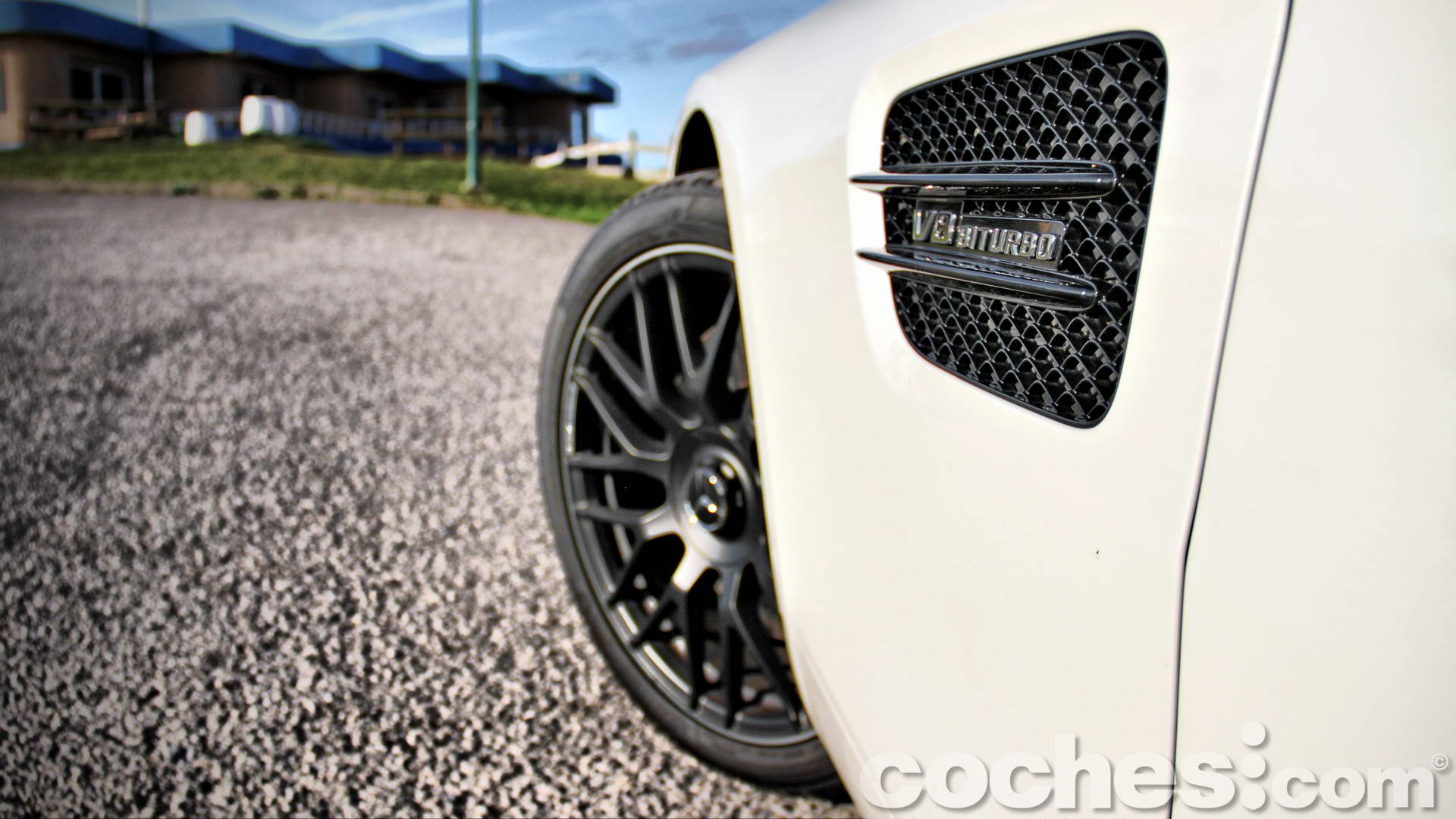 La increíble estampa del lateral se completa con unos generosos pasos de rueda ocupados en esta ocasión por unas espectaculares llantas forjadas AMG de 19 pulgadas de diámetro delante y 20 pulgadas detrás, con un diseño de radios cruzados en color negro, sobre las que se montan unos deportivos neumáticos Continental ContiSportContact 5P en medidas 265/35 ZR 19 98Y y 295/30 ZR 20 101Y respectivamente necesarios, sobre todo estos últimos, para conseguir transmitir al asfalto la ingente cantidad de potencia disponible. A través de ellas se vislumbran los enormes discos de freno compuestos, autoventilados y perforados, de 360 mm de diámetro tanto delante como detrás, con pinzas fijas de 6 pistones en el tren anterior y de 1 sólo pistón en el posterior, anodizadas en color plata.