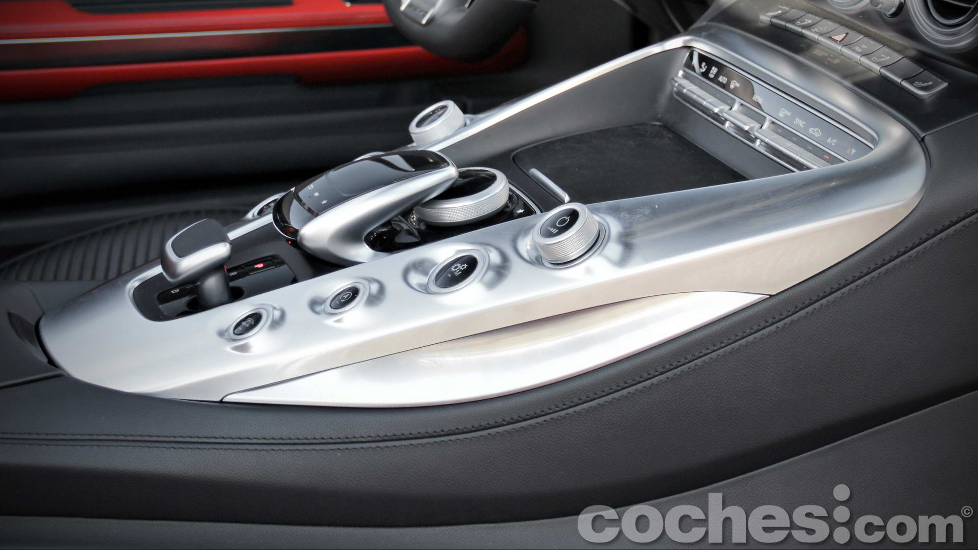 Justo debajo de la pantalla los 4 aireadores, de clara inspiración aeronáutica, dejan paso a los controles del sistema de climatización THERMOTRONIC para, sin solución de continuidad, unirse a la enorme consola central (AMG DRIVE UNIT según el lenguaje de la marca) cuyo diseño simula el del V8 que propulsa a esta “bestia”. Allí encontraremos el mando giratorio del AMG DYNAMIC SELECT que permite ajustar los programas de conducción, el cambio y el ESP, además de diversos pulsadores encargados del arranque sin llave, cambiar la sonoridad del sistema de escape, etc. Pero sigue sin gustarnos la situación de la palanca de la caja de cambios AMG E-SELECT, en una posición poco natural y cuyo accionamiento resulta muy dificultoso, por ejemplo a la hora de realizar maniobras de estacionamiento.