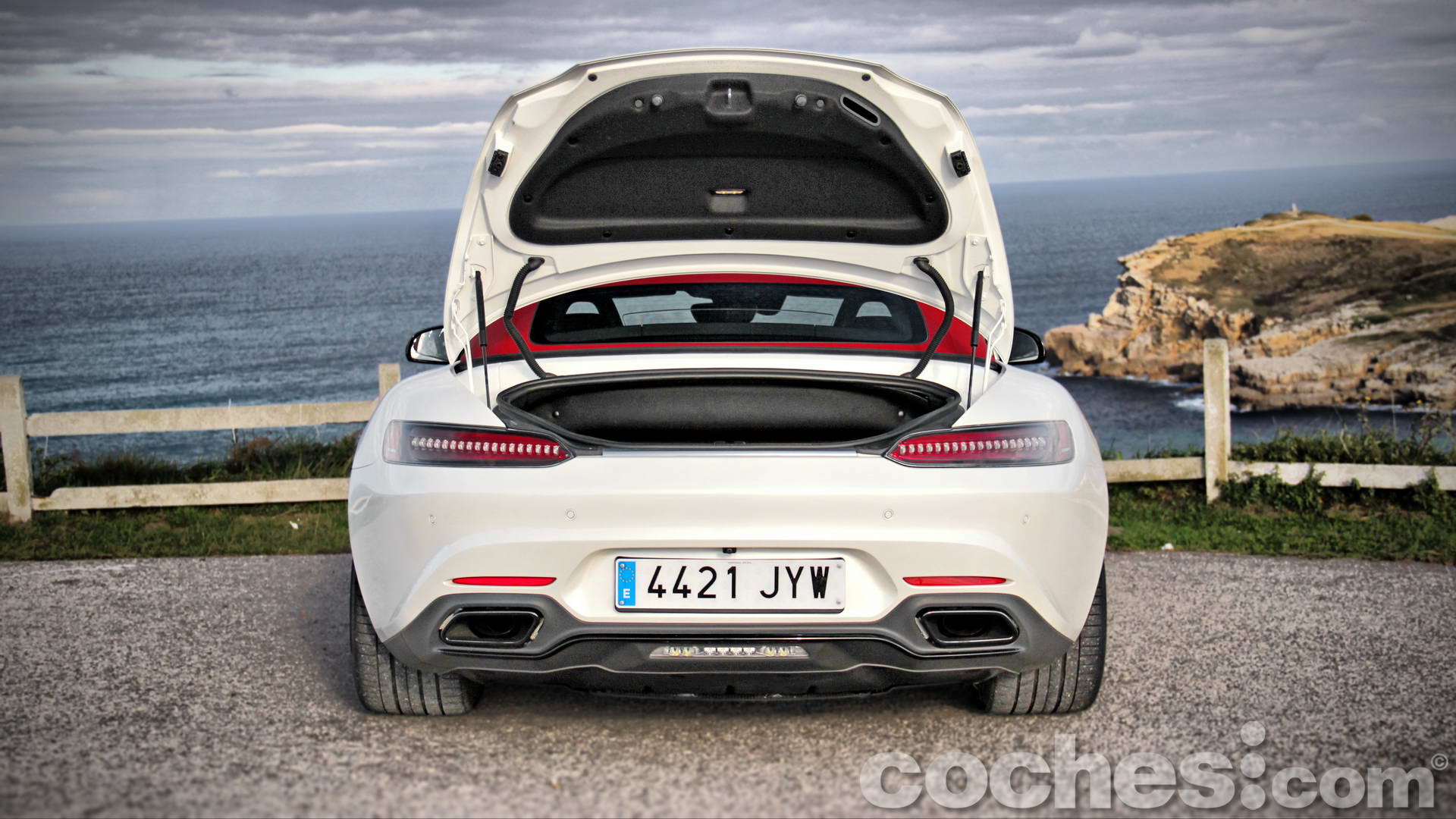 La zaga, tremendamente ancha y musculosa, nos sigue pareciendo uno de los rasgos más conseguidos de su diseño. Denota todo lo que se presupone, logrando acrecentar el marcado dinamismo del conjunto, apoyado por el diseño horizontal de los grupos ópticos, el difusor inferior (que incluye las dos salidas trapezoidales del escape AMG Performance, las luces antiniebla y de marcha atrás). En la zona superior no podía faltar el spoiler trasero retráctil que debe “convivir” con la tercera luz de freno, pues lógicamente no puede ubicarse en la misma posición que la variante coupé. Este alerón se despliega a partir de los 80 km/h para garantizar el necesario apoyo aerodinámico, aunque también puede elevarse a voluntad desde un pulsador en el salpicadero.