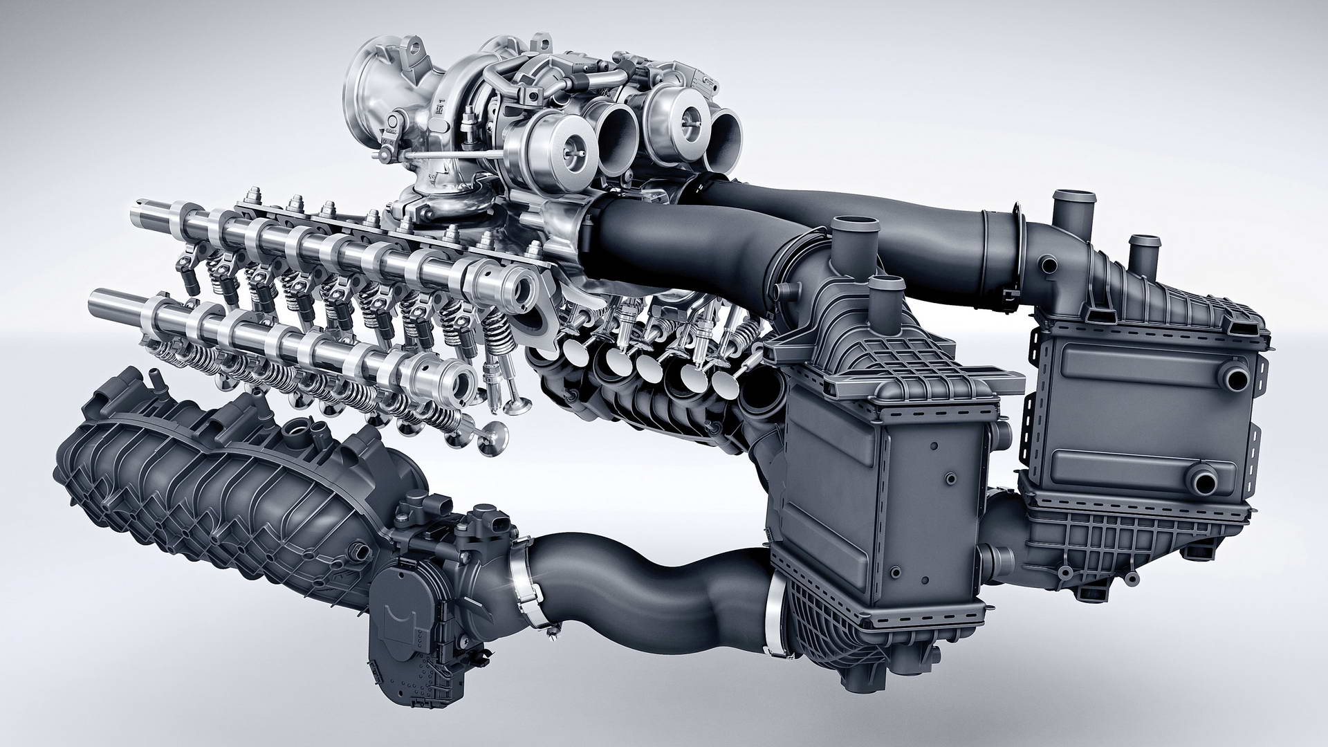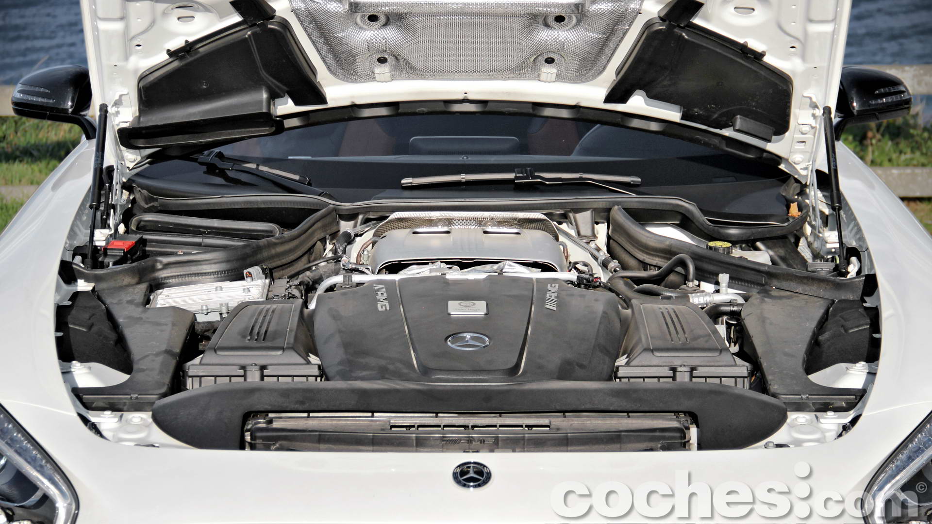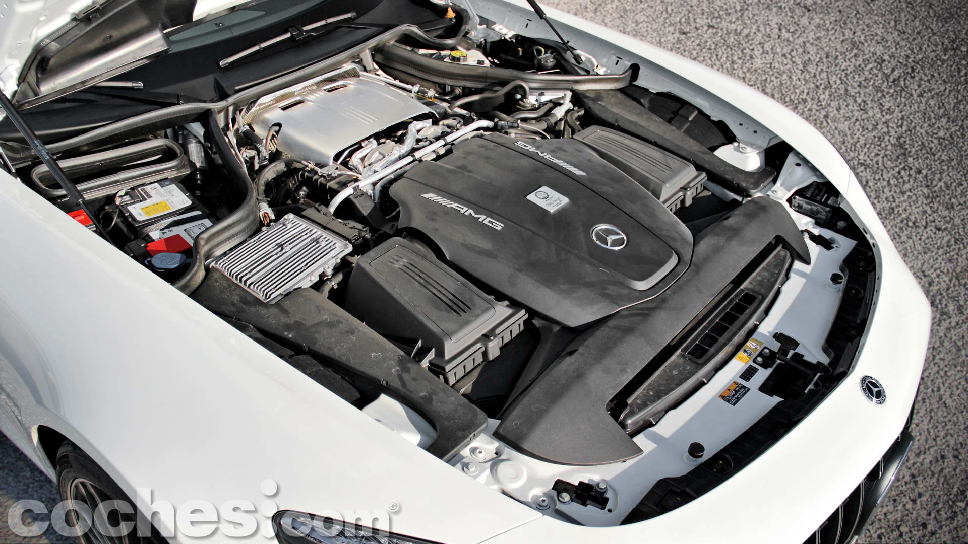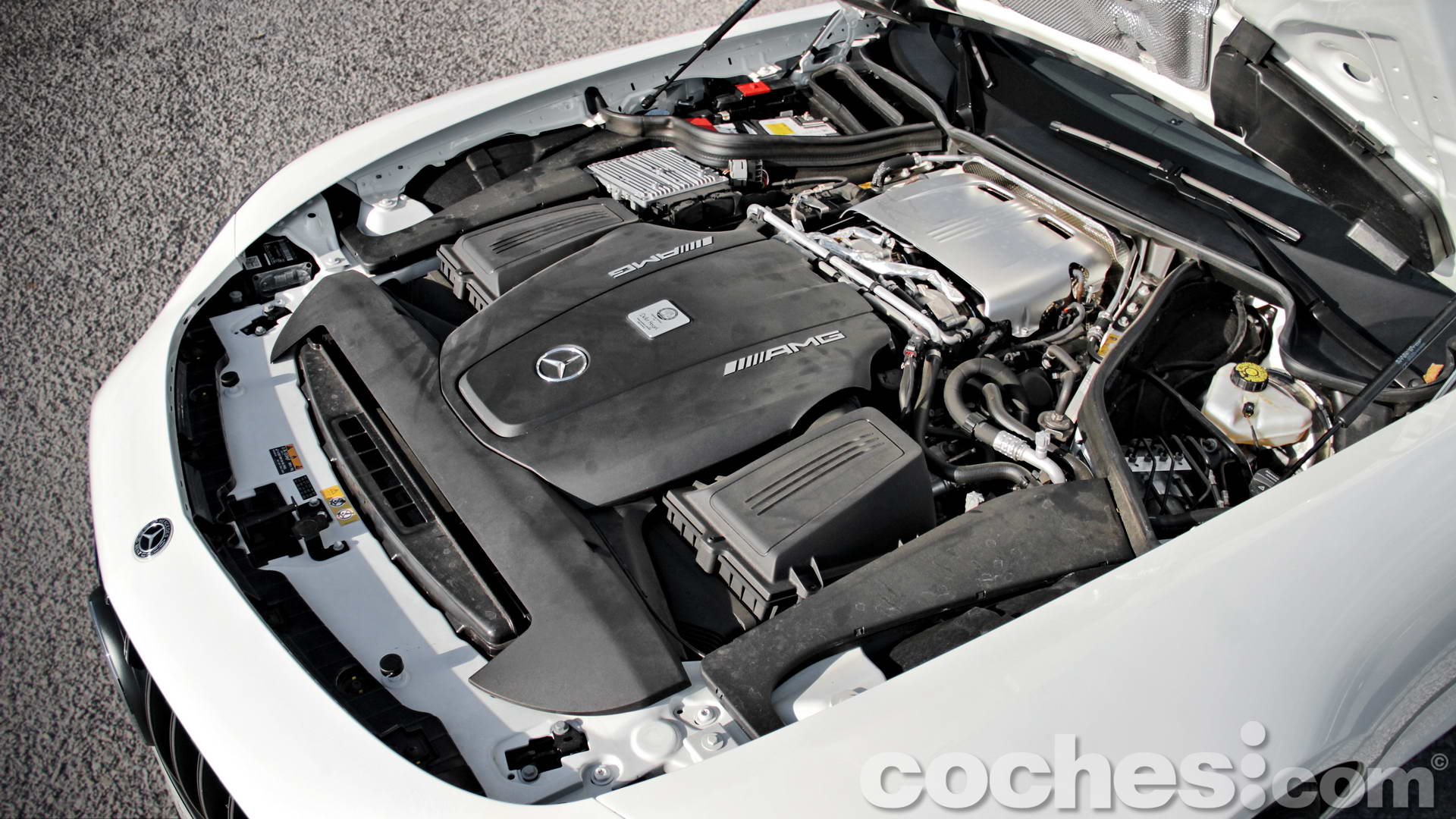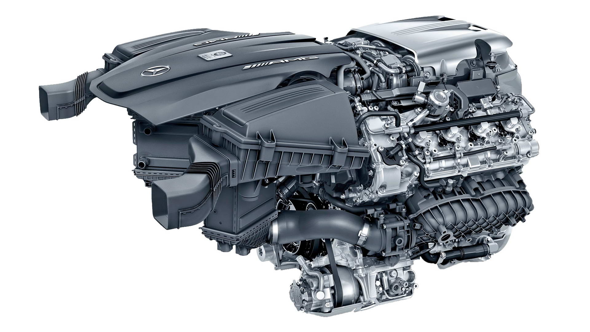 Este motor cuenta con un sistema de inyección directa, que pulveriza el combustible en las cámaras de combustión mediante inyectores piezoeléctricos a una presión variable de entre 100 y 200 bares. También está sobrealimentado mediante dos turbocompresores, que soplan a una presión máxima de 1,1 bares. Para mejorar su respuesta y disminuir el “lag” los turbos se montan en el interior de la V formada por las bancadas de cilindros. Al mismo tiempo dispone de engrase por “cárter seco”, lo que garantiza la correcta presión de aceite en todos los órganos mecánicos, aunque se practique una conducción extrema con fuertes aceleraciones laterales. Como “guinda del pastel” se culmina el conjunto con un afinado equipo de escape AMG Performance, del que podemos variar su sonoridad simplemente pulsando un botón en la consola central.
