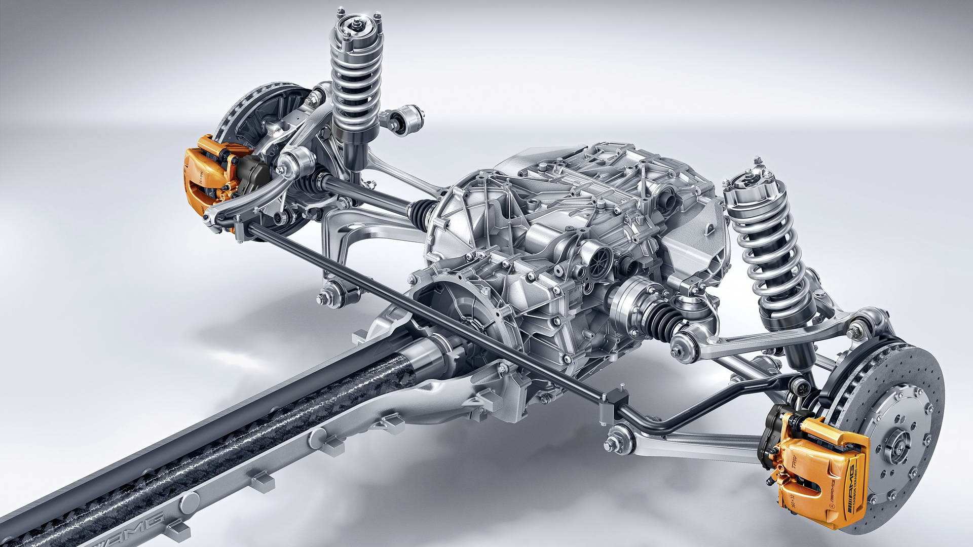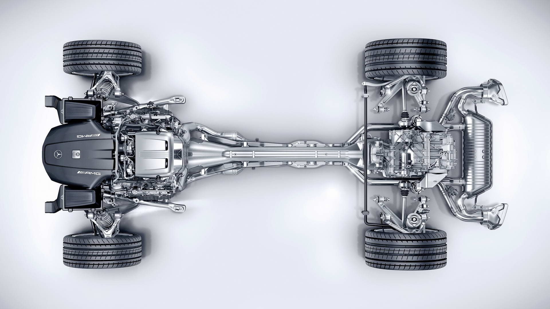 Este propulsor va asociado a una caja de cambios automática de doble embrague y 7 marchas AMG SpeedShift DCT en configuración “transaxle”… ¿Y ese “palabro” qué significa? Como todos sabréis en un vehículo, cuanto más optimizada sea la distribución de pesos y más bajo se sitúe el centro de gravedad, mejor será su comportamiento dinámico. En el caso del modelo que hoy nos ocupa esto se consigue colocando el propulsor lo más abajo posible en una posición central-delantera, justo por detrás del eje anterior y, además, trasladando la propia caja de cambios al tren posterior. Ésta va unida solidariamente al motor mediante un tubo hueco (el Torque Tube), diseñado para ofrecer una gran rigidez a la flexión y a la torsión. En el interior es donde gira el árbol de transmisión de fibra de carbono, que es el encargado de trasferir la potencia del V8 a la caja de cambios. Por último cabe mencionar la presencia, también en el eje trasero, de un diferencial autoblocante mecánico (de control electrónico en las versiones más potentes) para mejorar la tracción a la salida de las curvas, permitiéndonos acelerar antes.