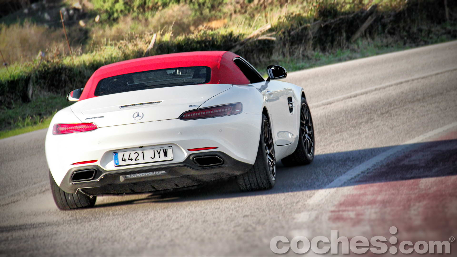 Una vez que desaparecieron las últimas casas junto a la carretera apenas tardamos unos pocos centenares de metros más en volver a pulsar el selector del AMG RIDE CONTROL eligiendo, ahora sí, el modo “Sport +”. De esta manera el carácter de este Mercedes-AMG GT Roadster se transformó radicalmente. Las reacciones a cualquier mínima insinuación sobre el acelerador eran mucho más inmediatas, el tacto de la dirección más directo y bastaba un leve toque a las levas del cambio para que la transición de una marcha a otra se produjera de forma instantánea.