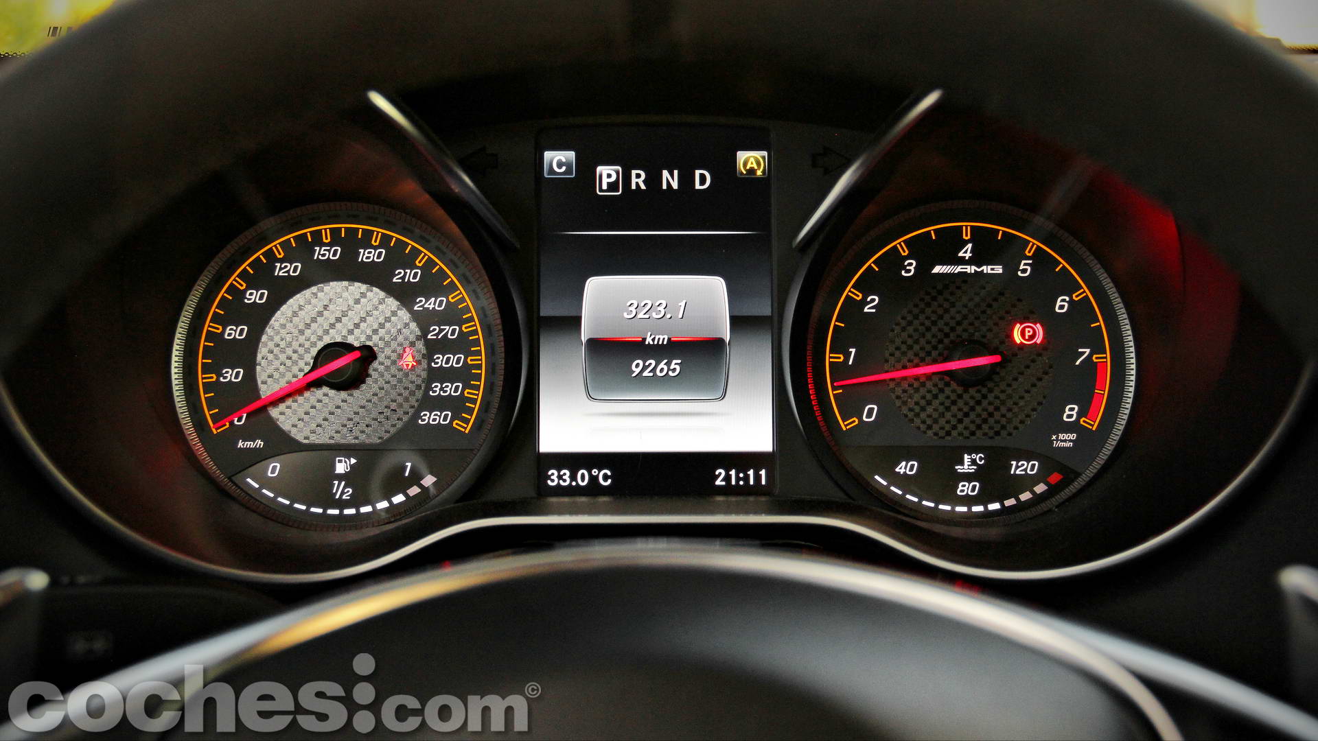 El volante AMG Performance de tres radios muestra el tamaño, grosor y tacto perfectos para manejar este deportivo, incluso cuando le exigimos el máximo en una carretera de curvas o un circuito. Justo por detrás se sitúan las levas de cambio en aluminio, desde las que podremos subir y bajar marchas de la magnífica caja de cambios automática de doble embrague AMG SpeedShift DCT. Resulta curioso que en este deportivo la marca alemana no haya renunciado todavía a un cuadro de instrumentos tradicional, en lugar de los copkit “virtuales” que montan ya algunos de sus rivales. De hecho parece sacado de cualquier otro modelo de la firma de la estrella de hace unos años… no dudamos que será uno de los aspectos a revisar en próximas actualizaciones, sobre todo contando en otros modelos de su gama con una amplia experiencia en lo que a este tipo de pantallas se refiere.