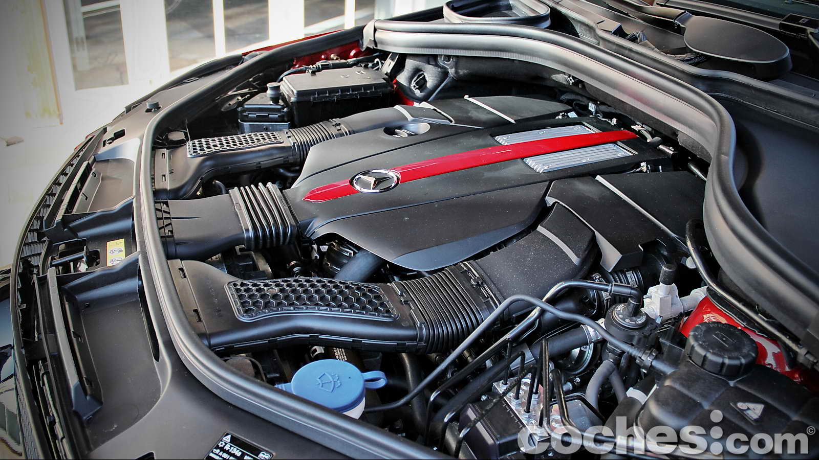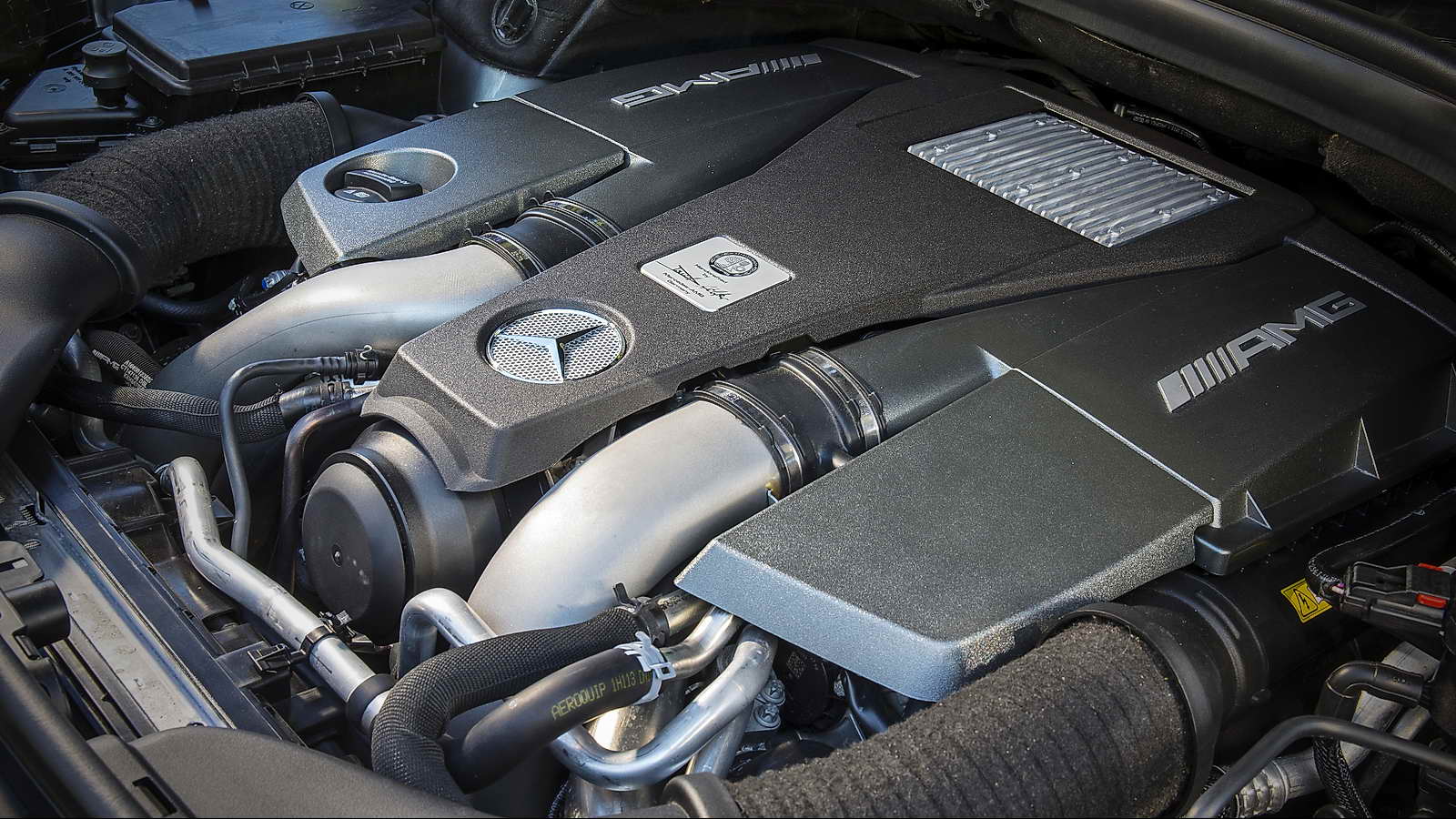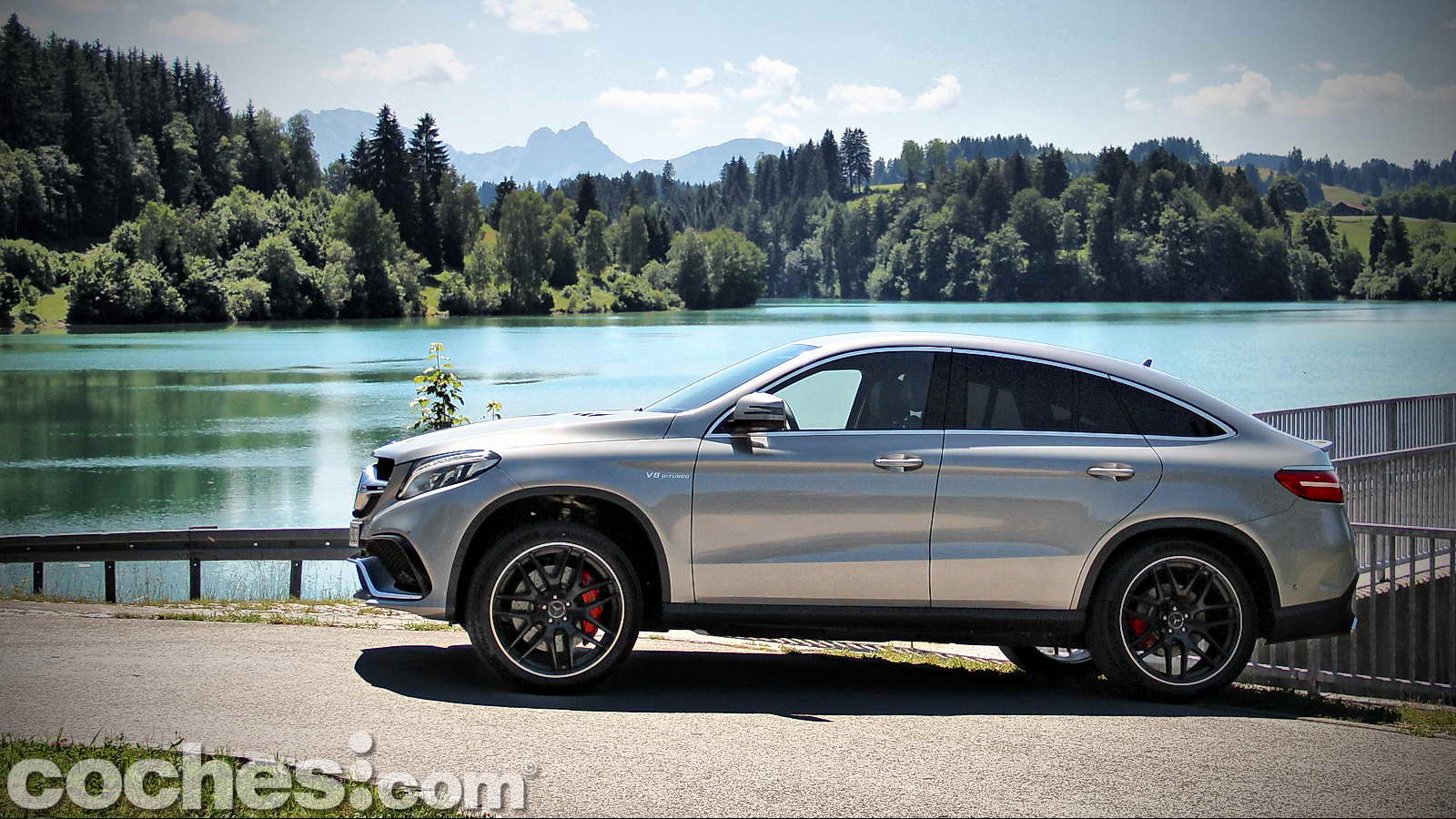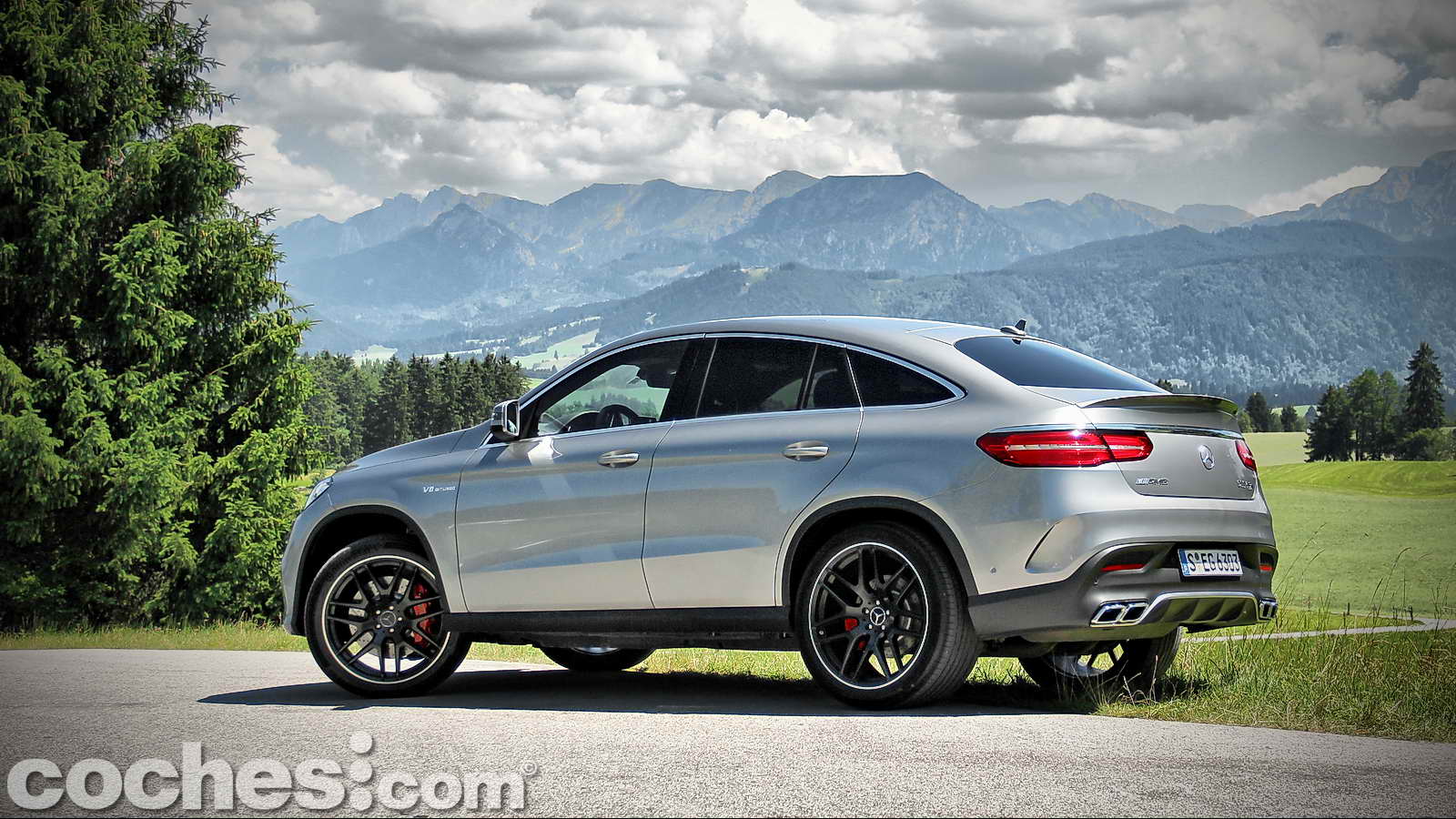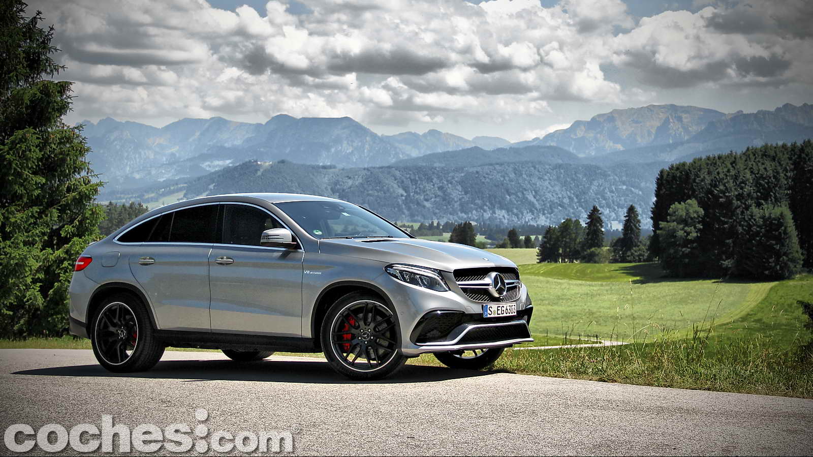 También por su musculosa carrocería pintada en un bonito color Palladium Silver, los deportivos paragolpes delantero y trasero firmados por AMG, la suave caída de la zaga desde el pilar B que culmina en un disimulado pero eficaz alerón posterior, ese intimidante logo V8 BITURBO colocado sobre cada uno de los guardabarros delanteros.